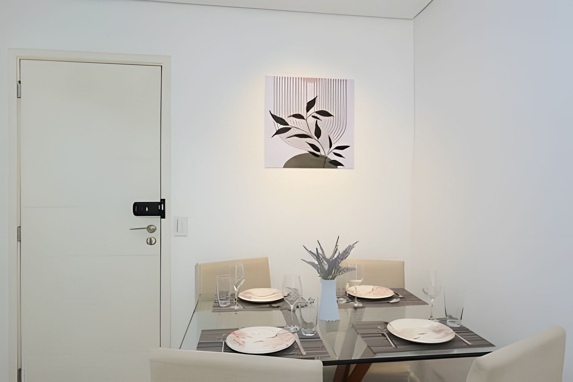 * Sala de Jantar: Funcional, com uma mesa que acomoda 4 pessoas, além de uma bancada espaçosa com duas cadeiras altas.