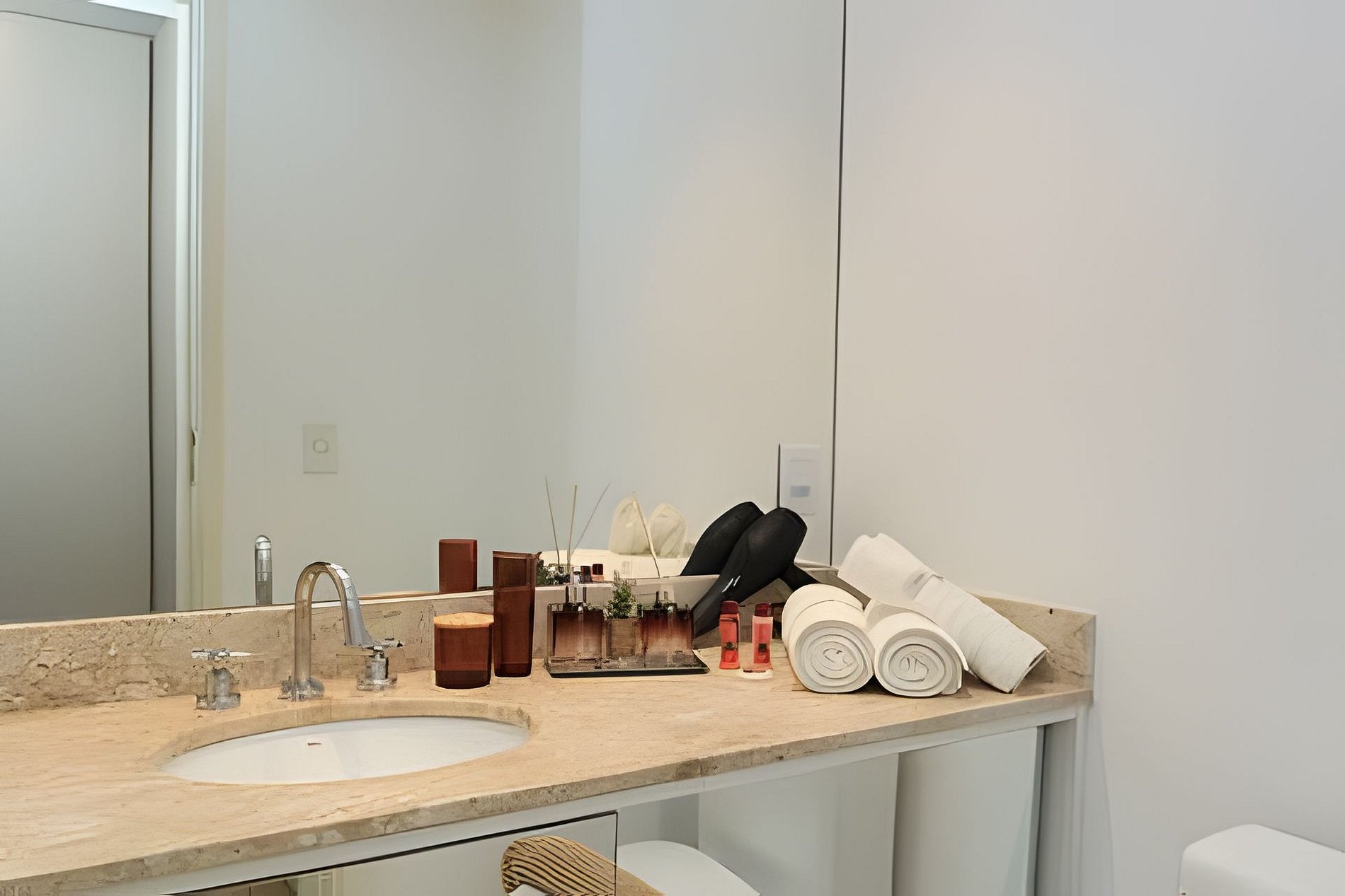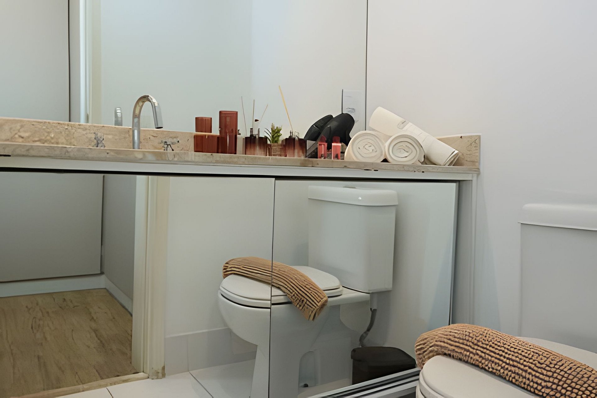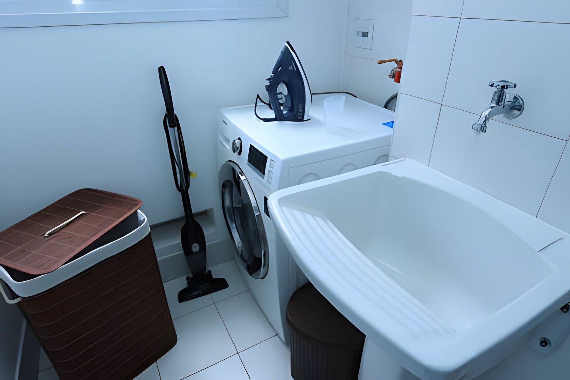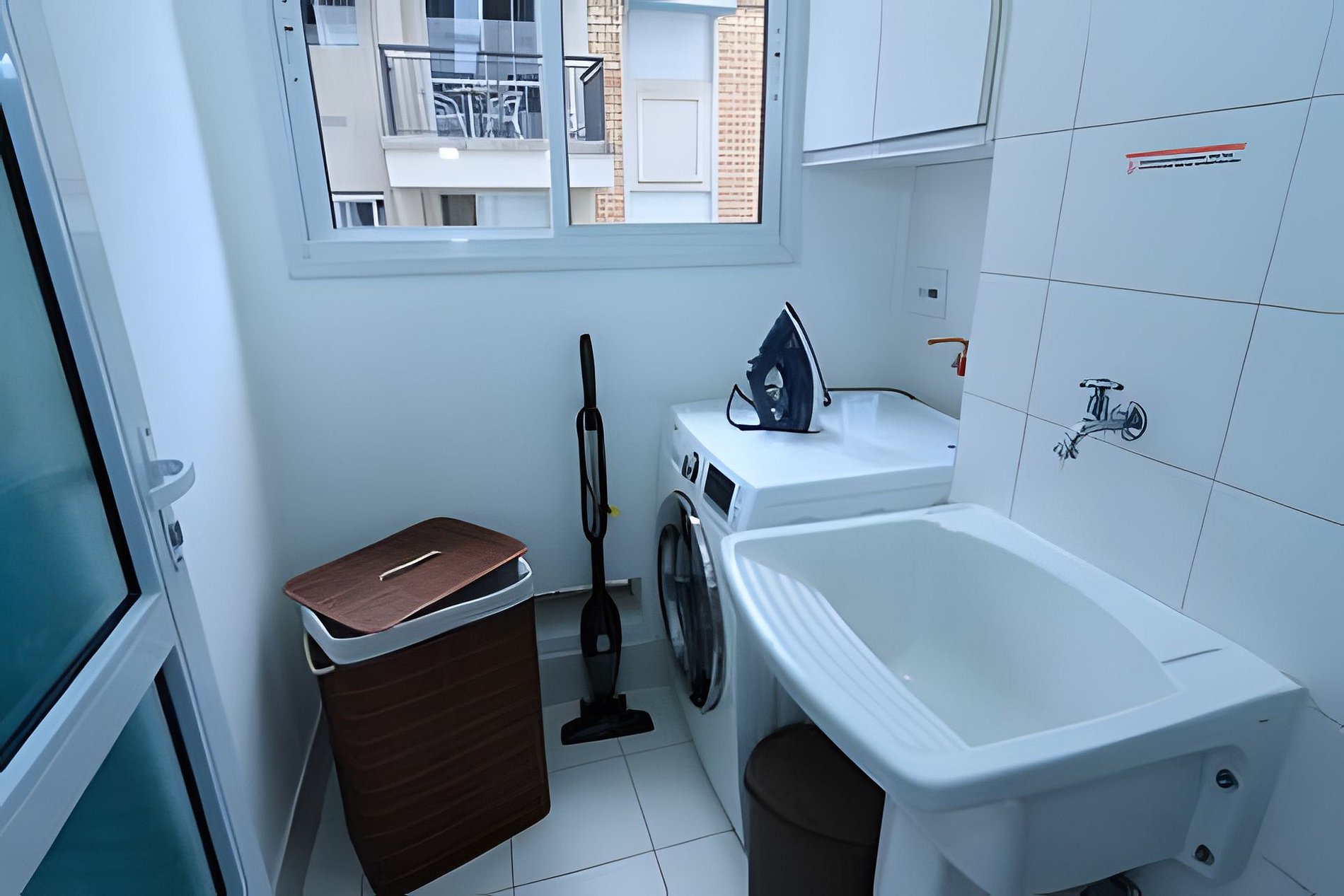* Área de Serviço: Equipada com máquina de lavar e secar roupas, ferro, varal, cesto de roupas e lixeira.