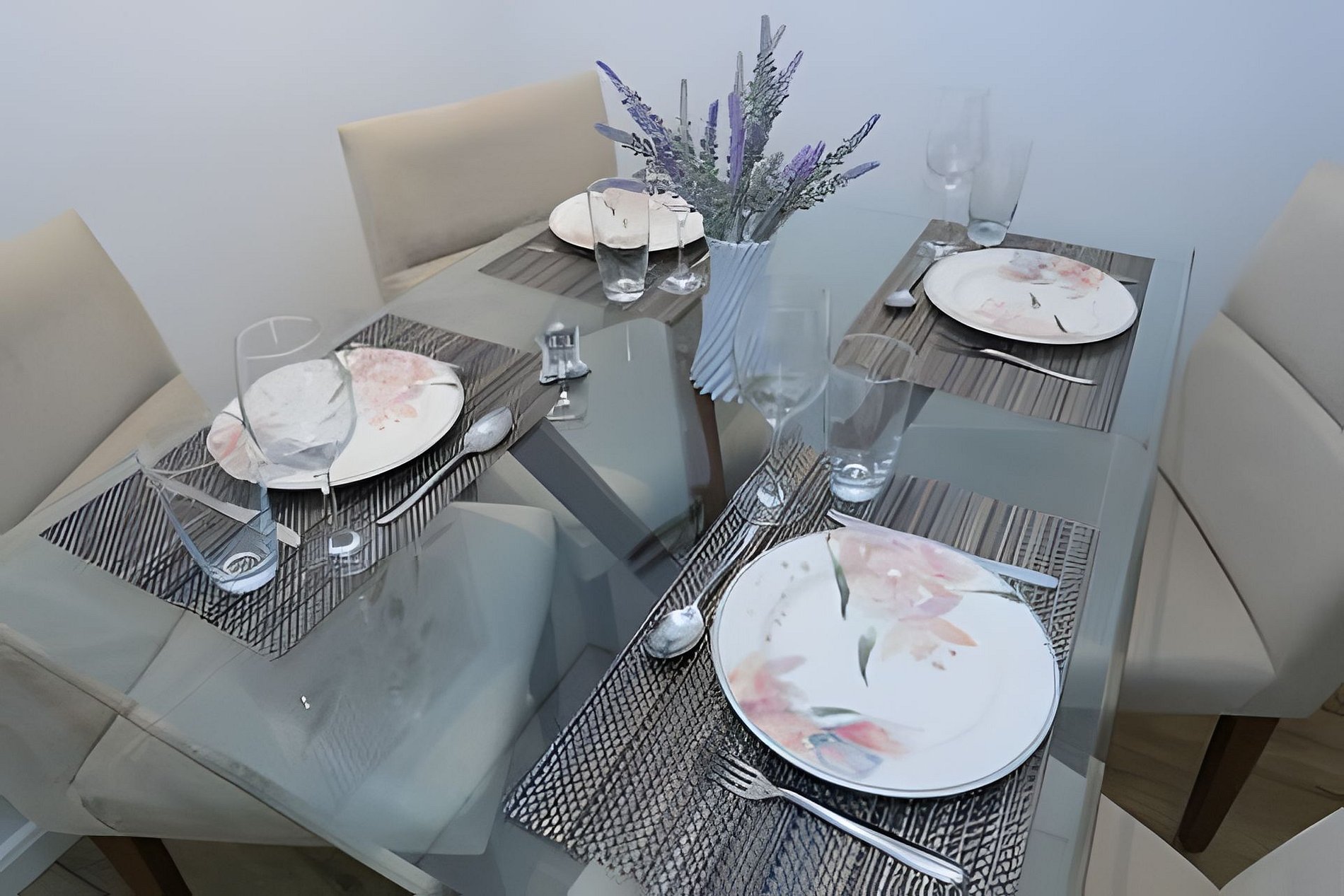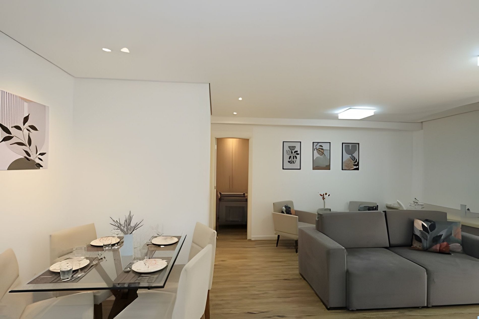 * Sala de Jantar: Funcional, com uma mesa que acomoda 4 pessoas, além de uma bancada espaçosa com duas cadeiras altas.