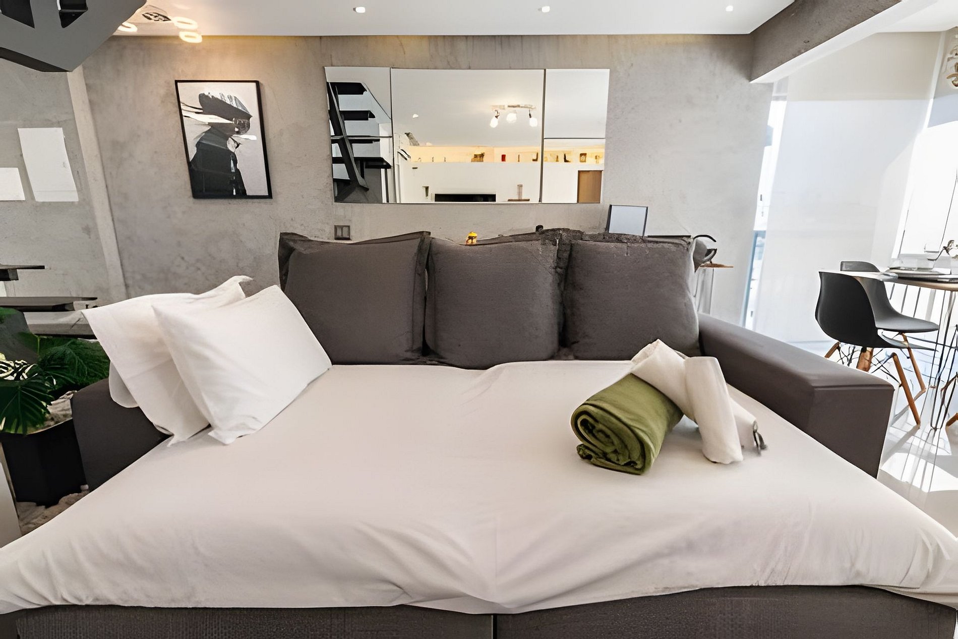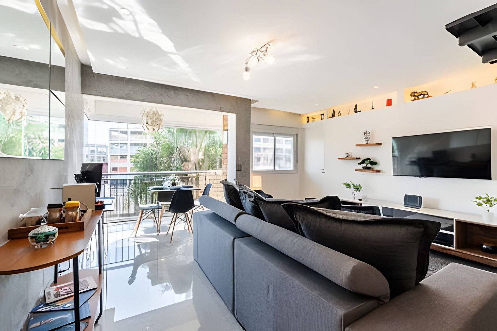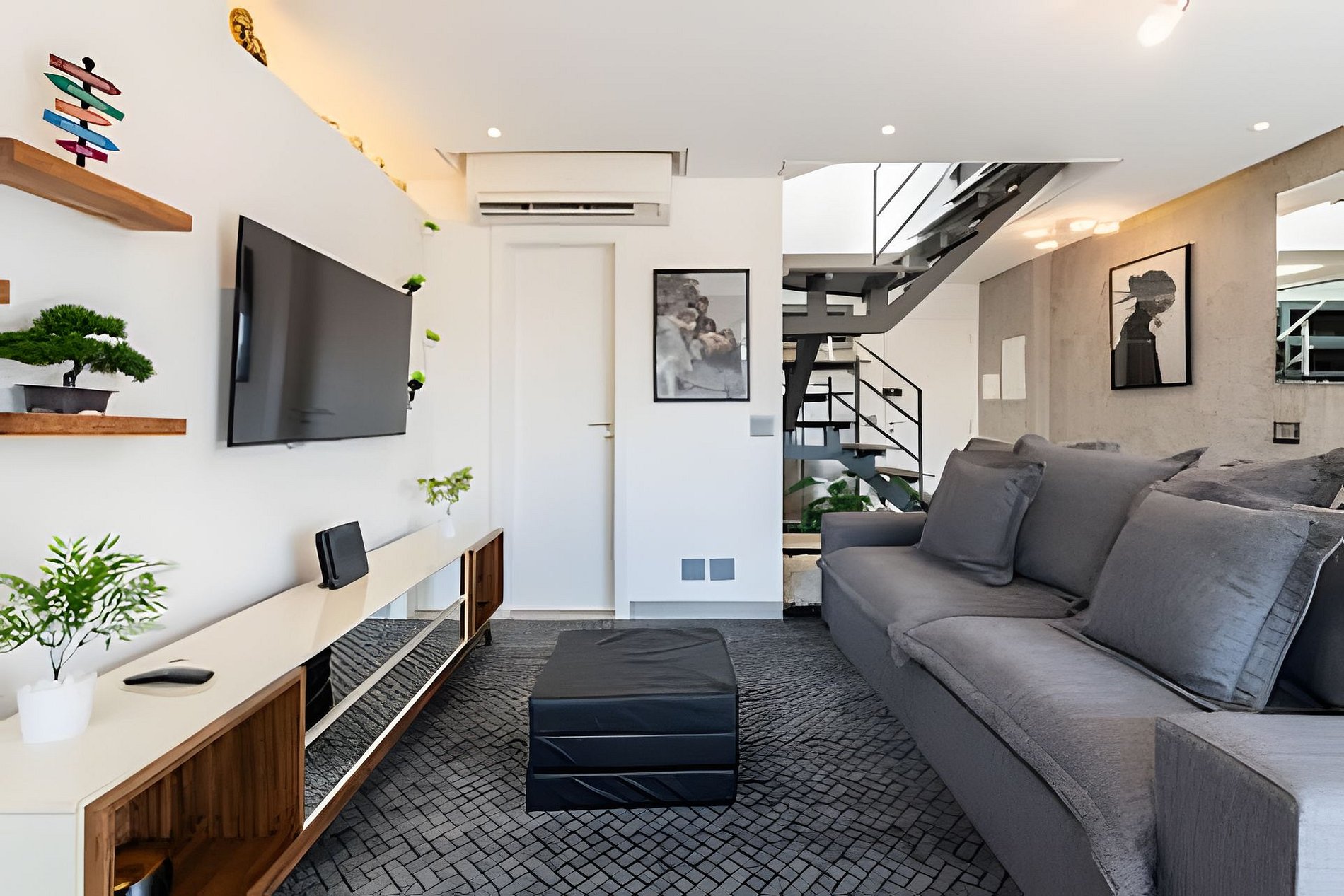 *Sala de Estar: Espaçosa, com sofá que se transforma em uma cama de casal e TV de 55’ para uma experiência de cinema em casa.