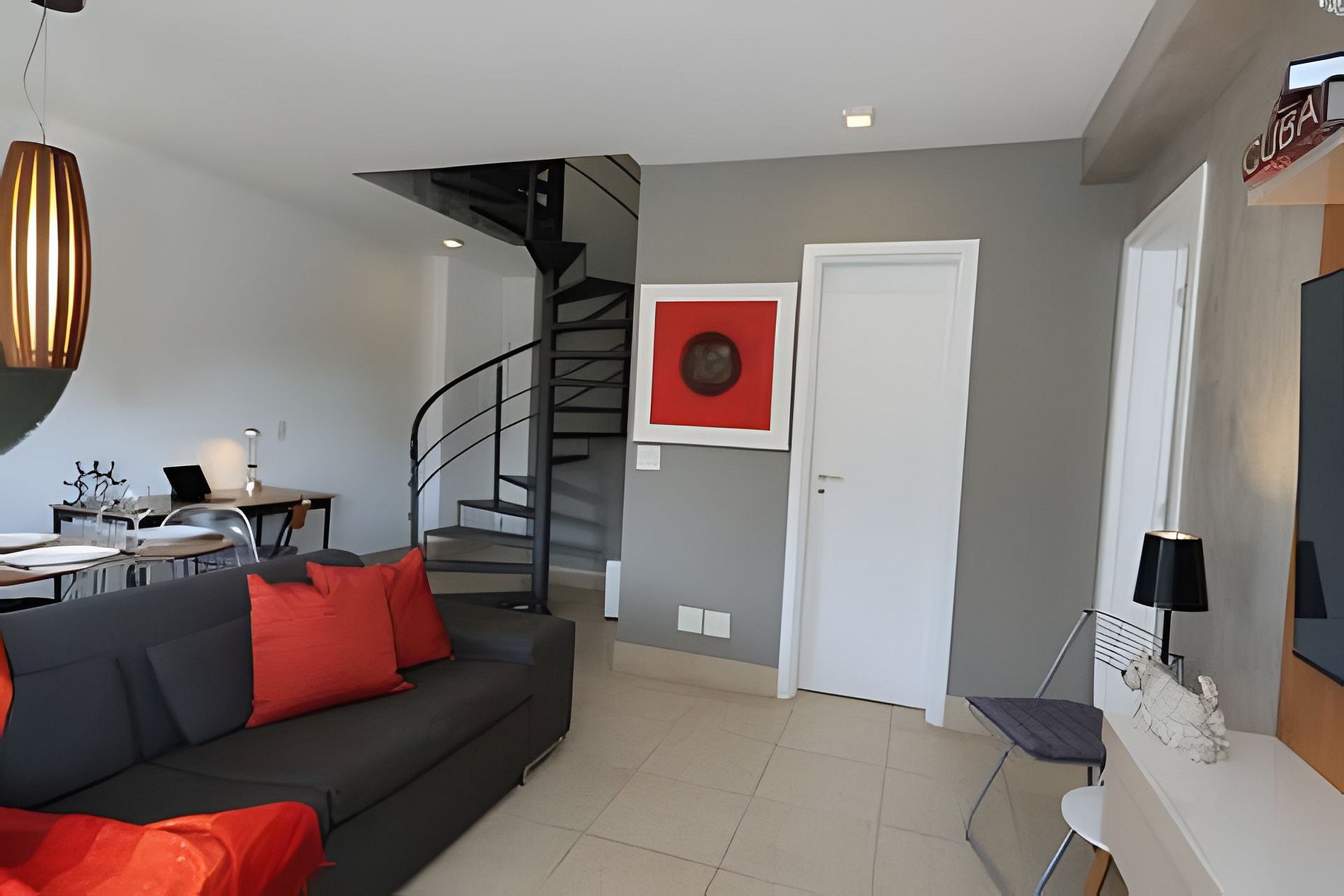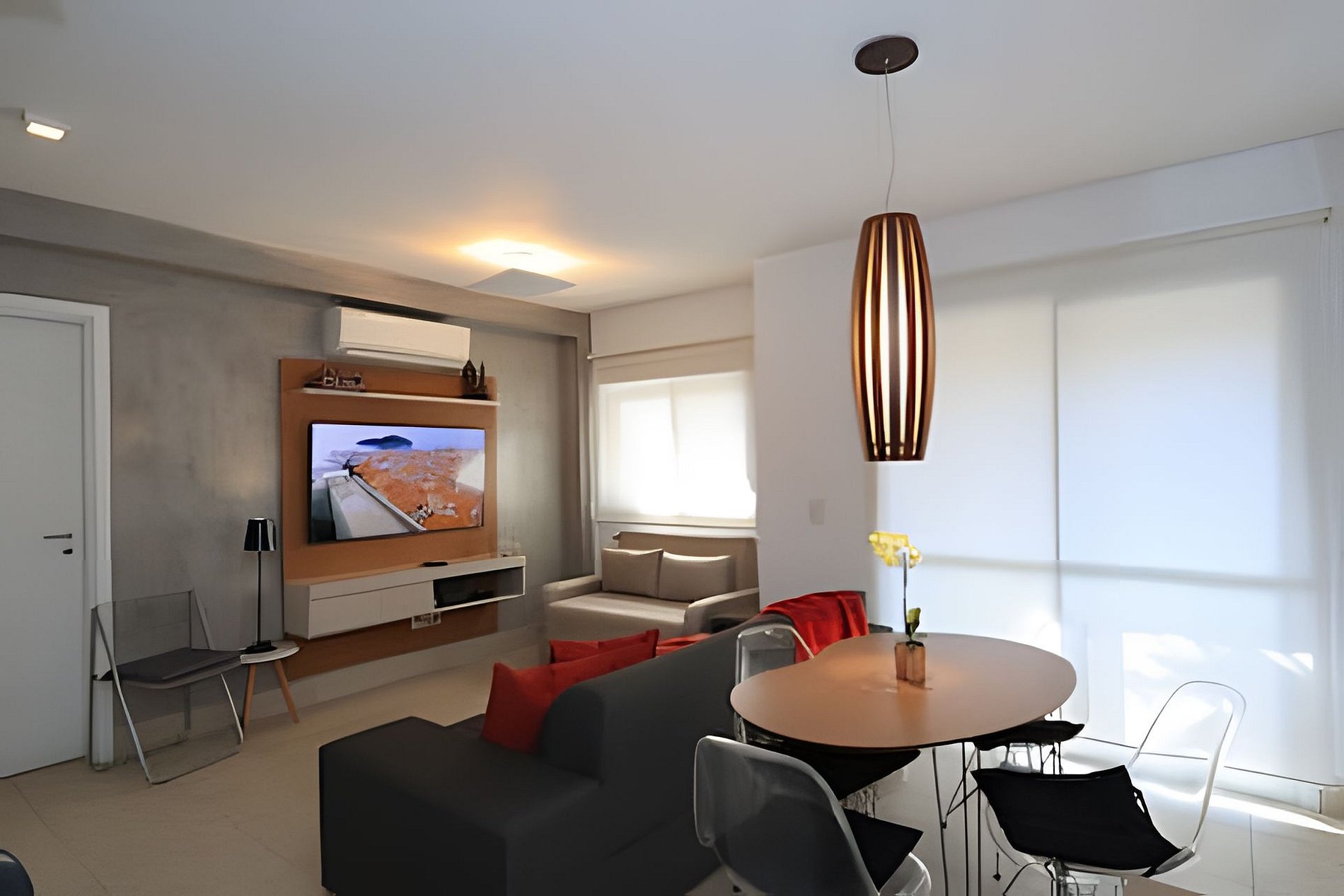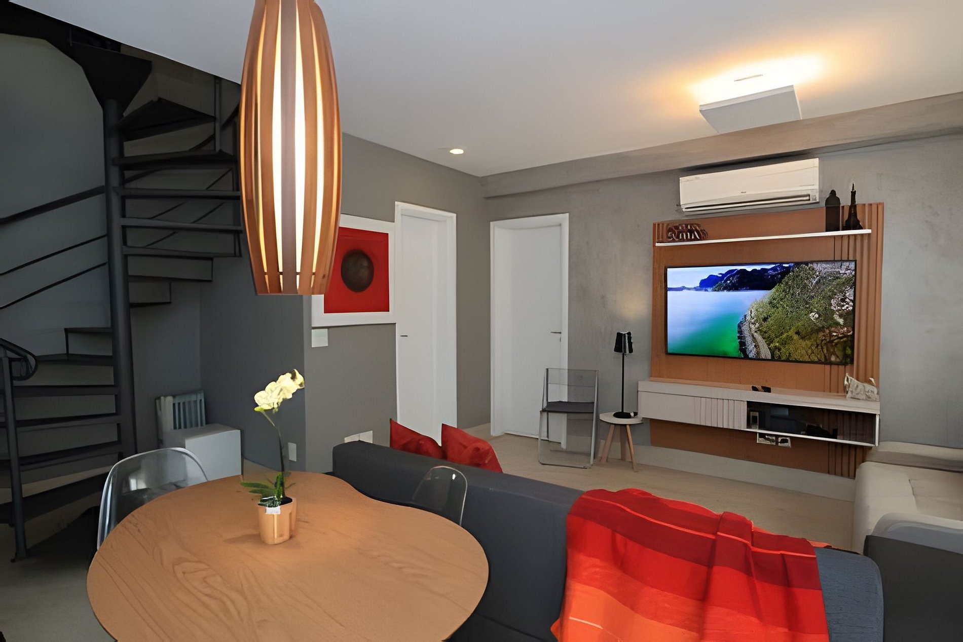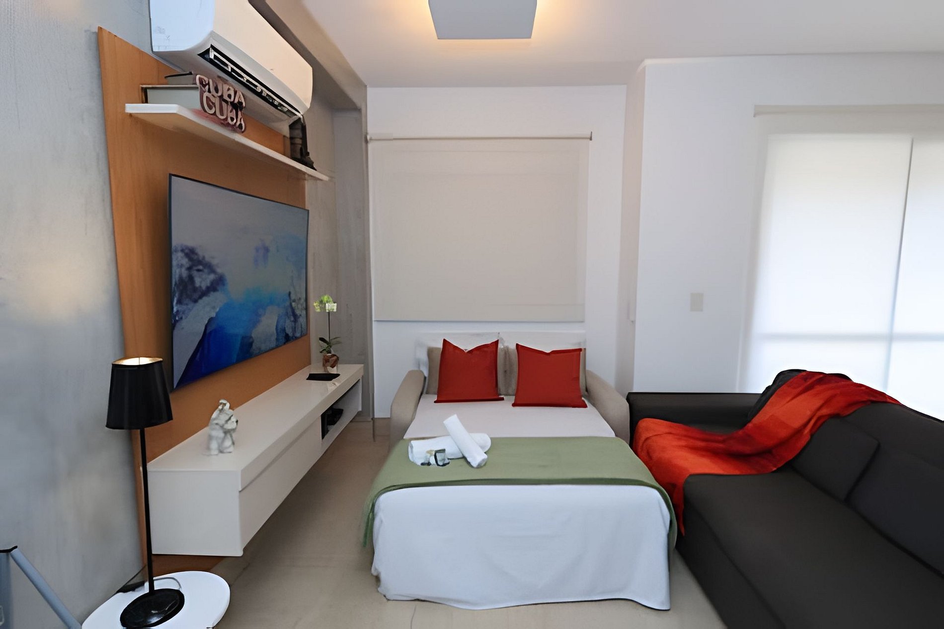 * Sala de Estar: Espaçosa, com sofá e sofá cama que se transforma em uma cama de casal e TV de 55’ para uma experiência de cinema em casa.