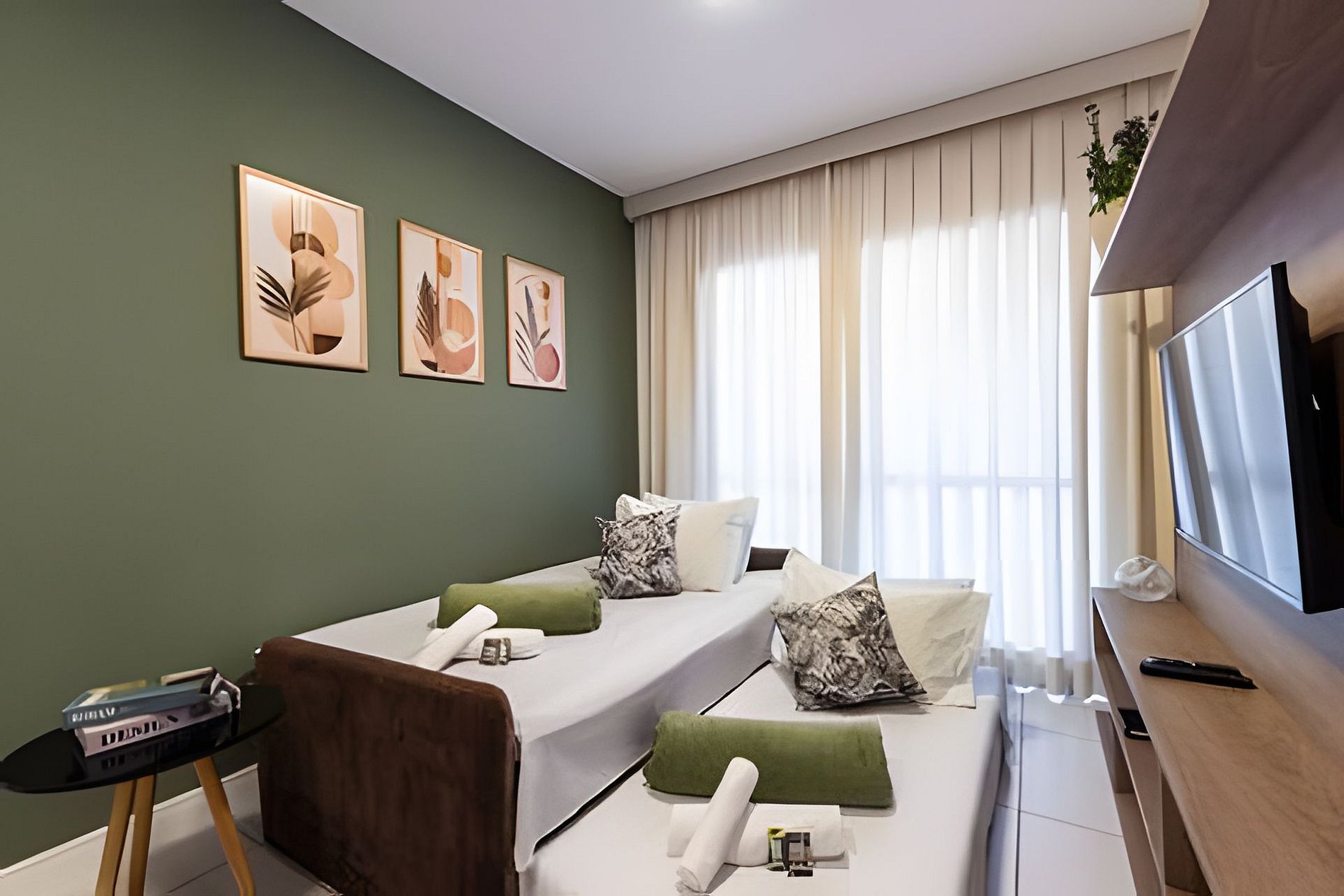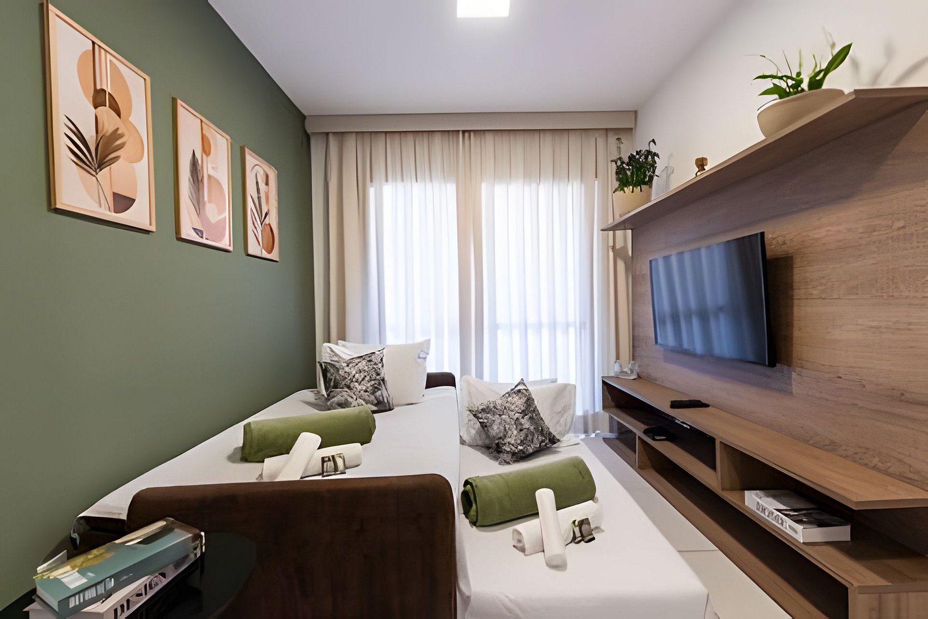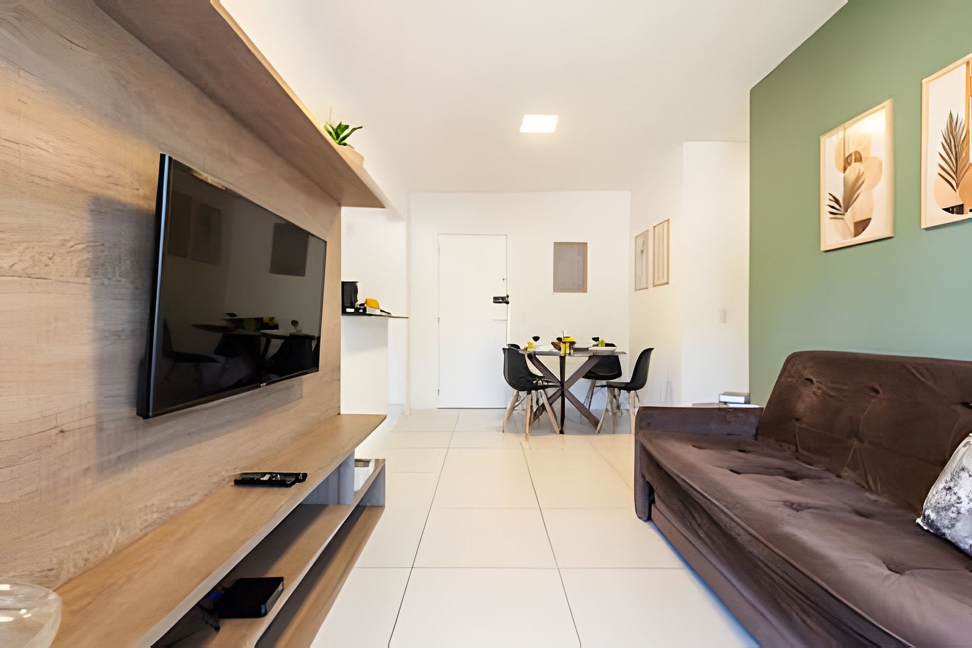 * Sala de Estar: Ampla e acolhedora, equipada com Smart TV e um sofá cama, ideal para momentos de relaxamento.