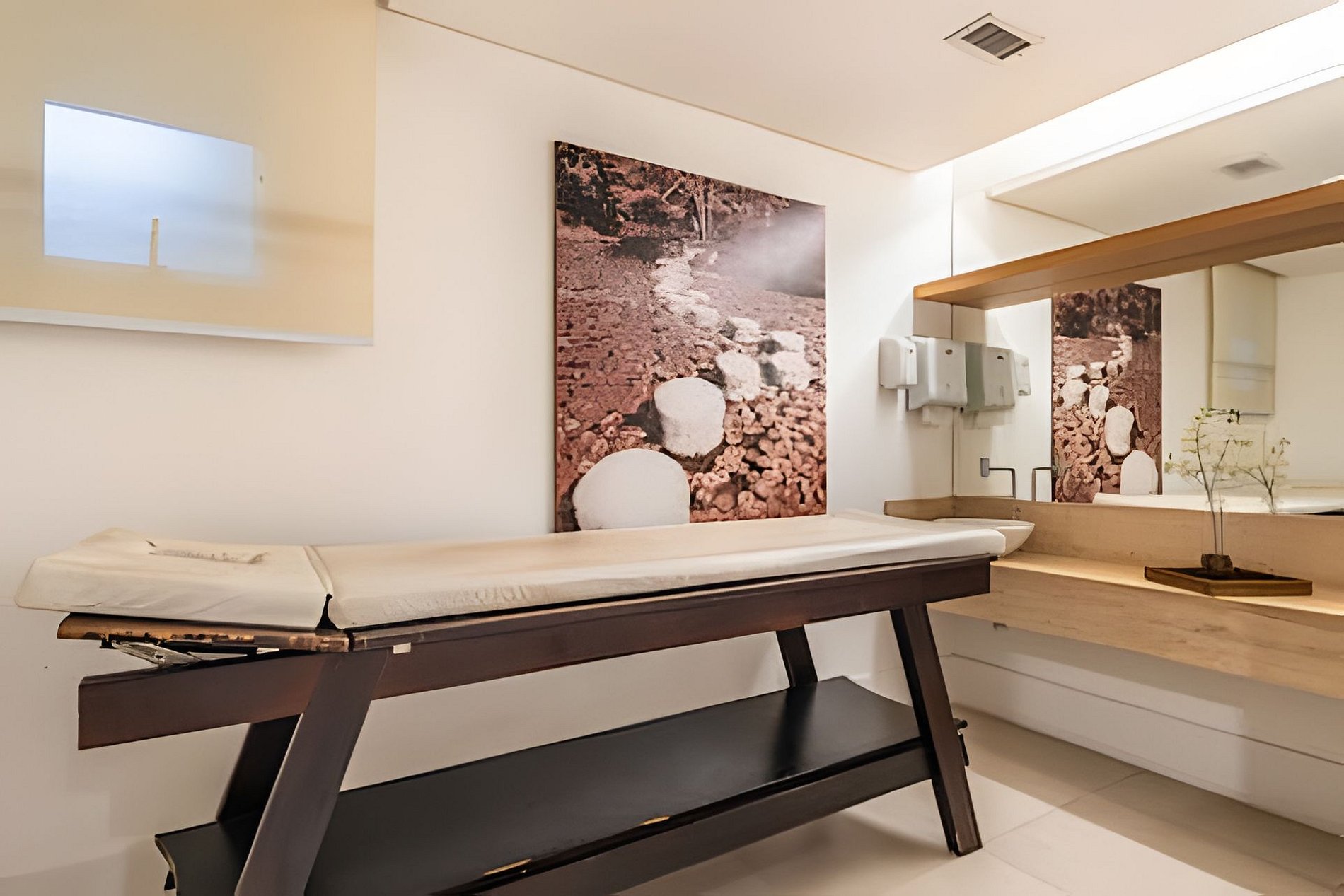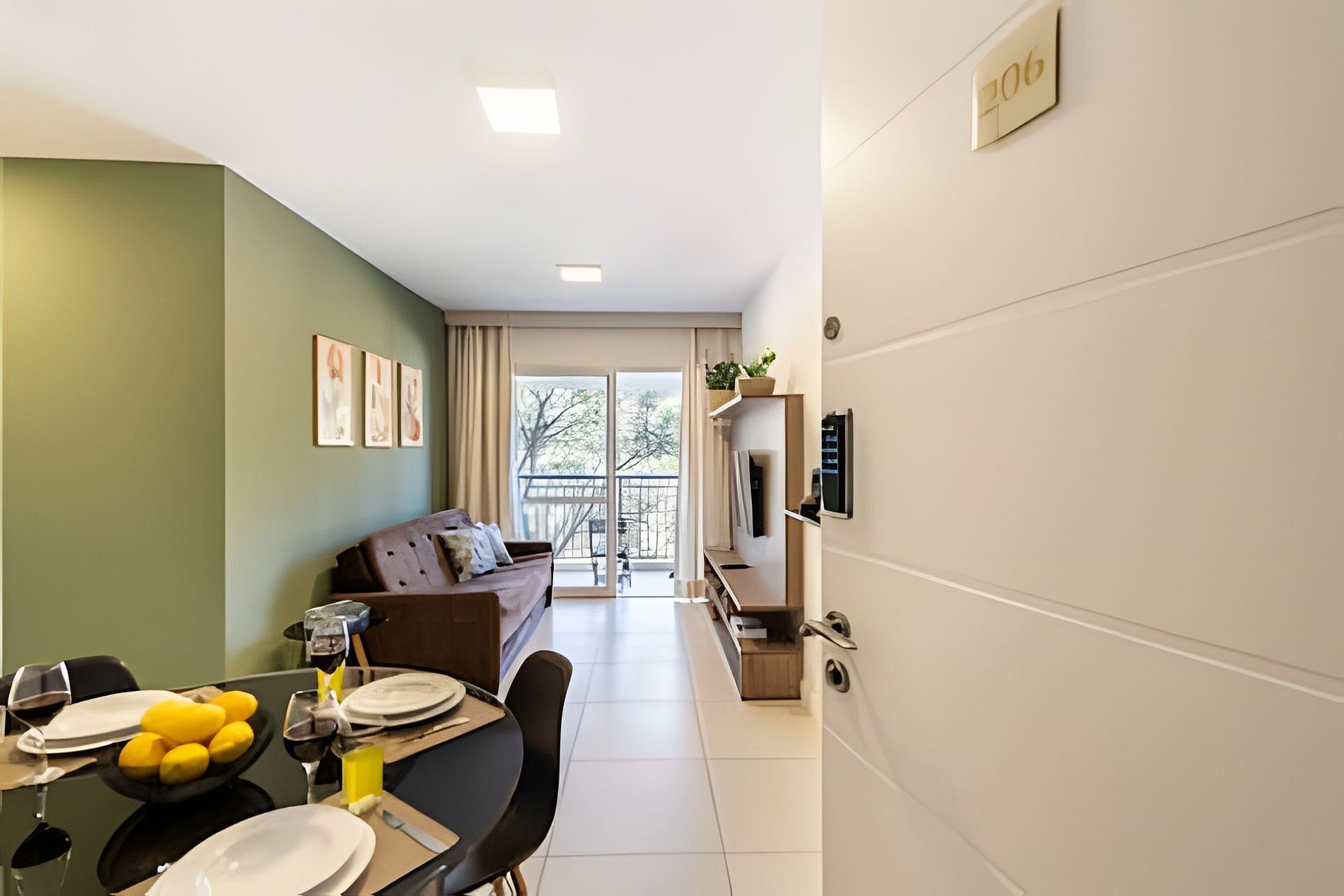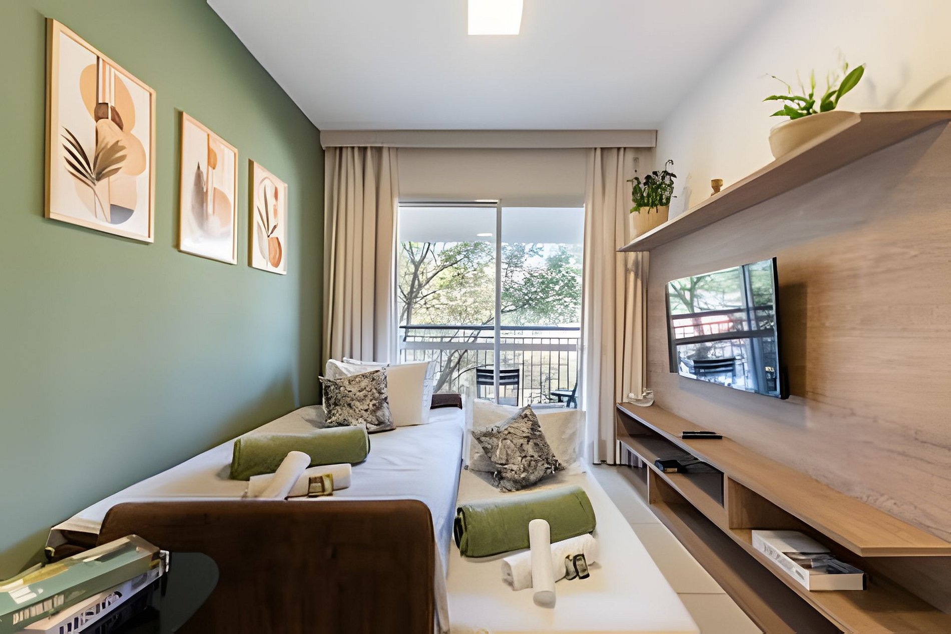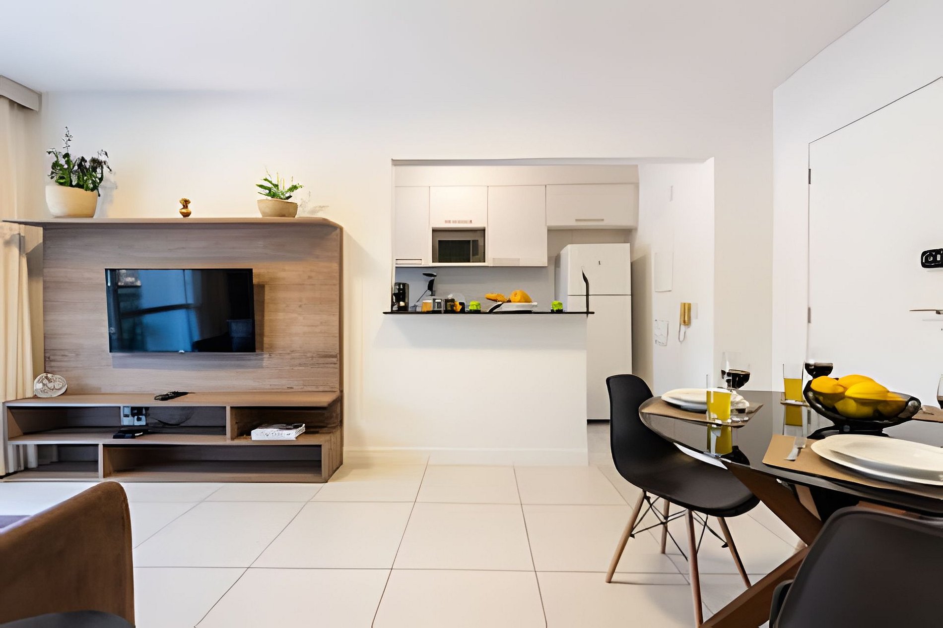 * Sala de Estar: Ampla e acolhedora, equipada com Smart TV e um sofá cama, ideal para momentos de relaxamento.