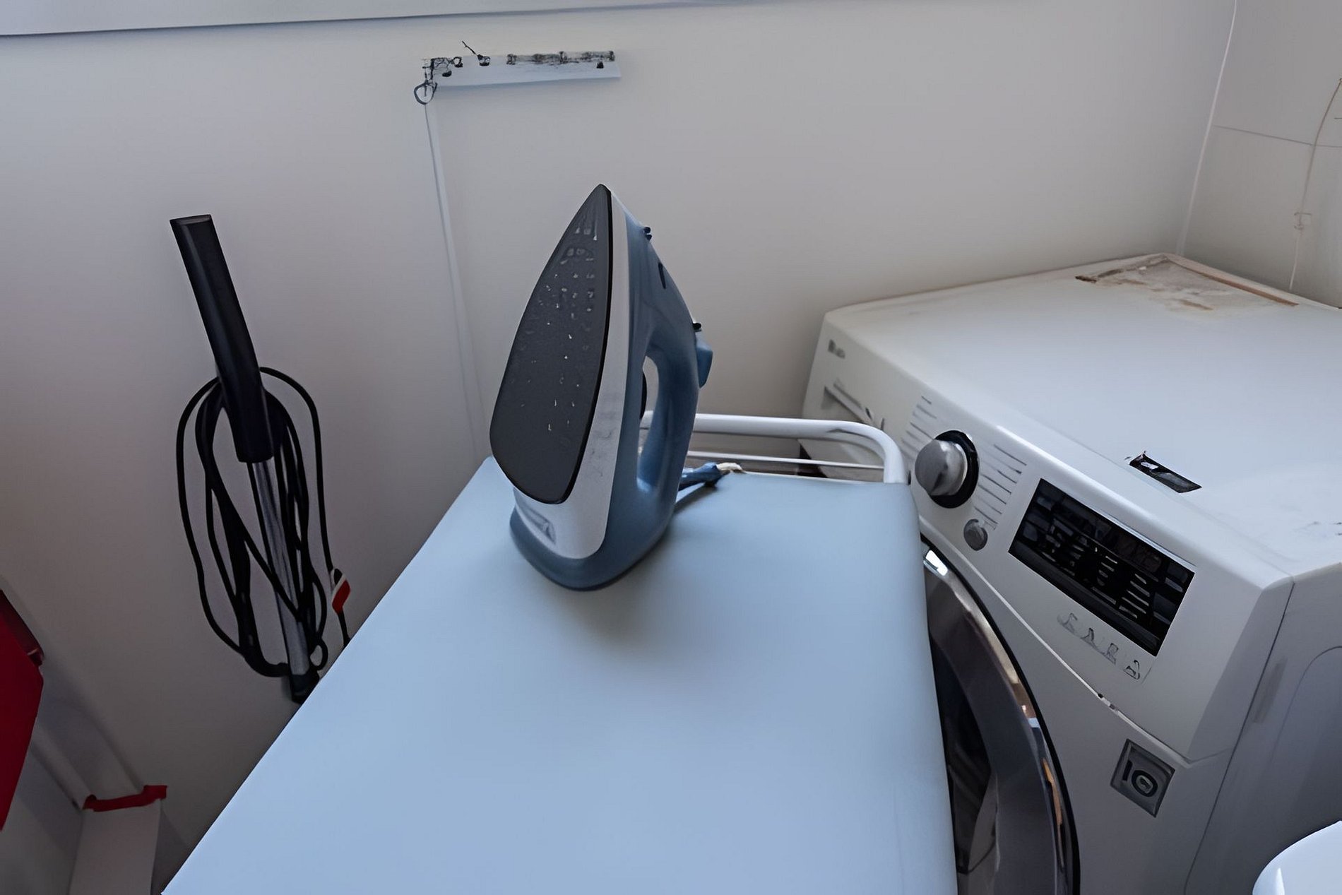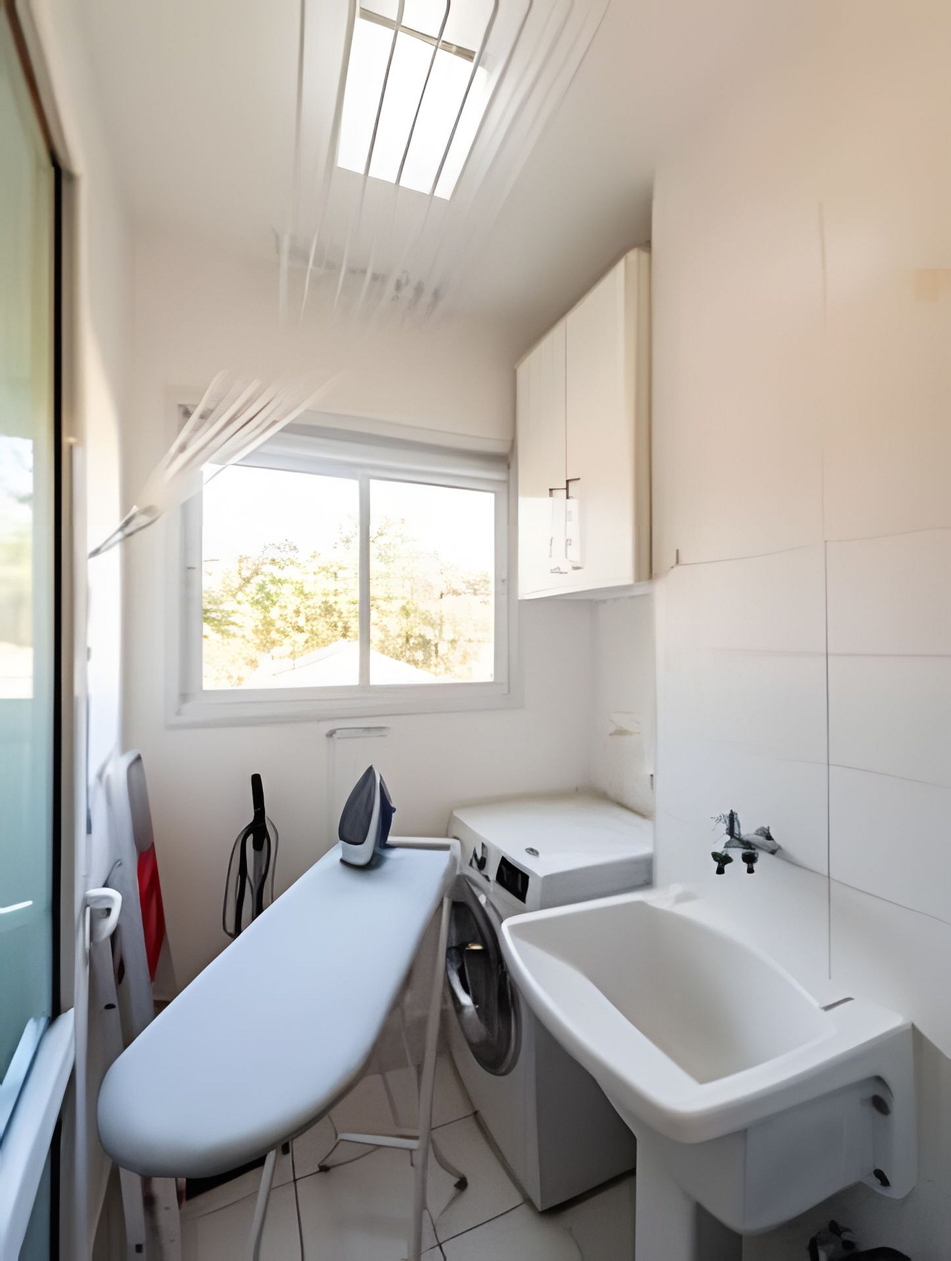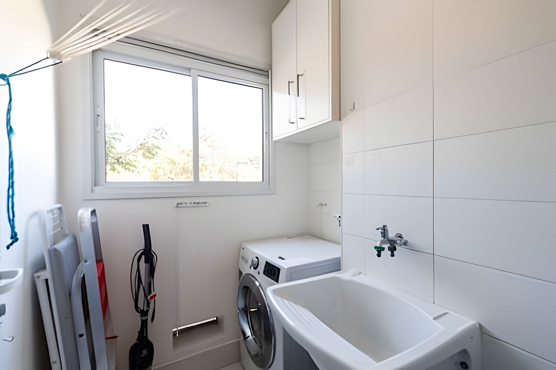 * Área de Serviço: Equipada com máquina de lavar e secar roupas, ferro, varal de teto, cesto de roupas e lixeira para sua conveniência.