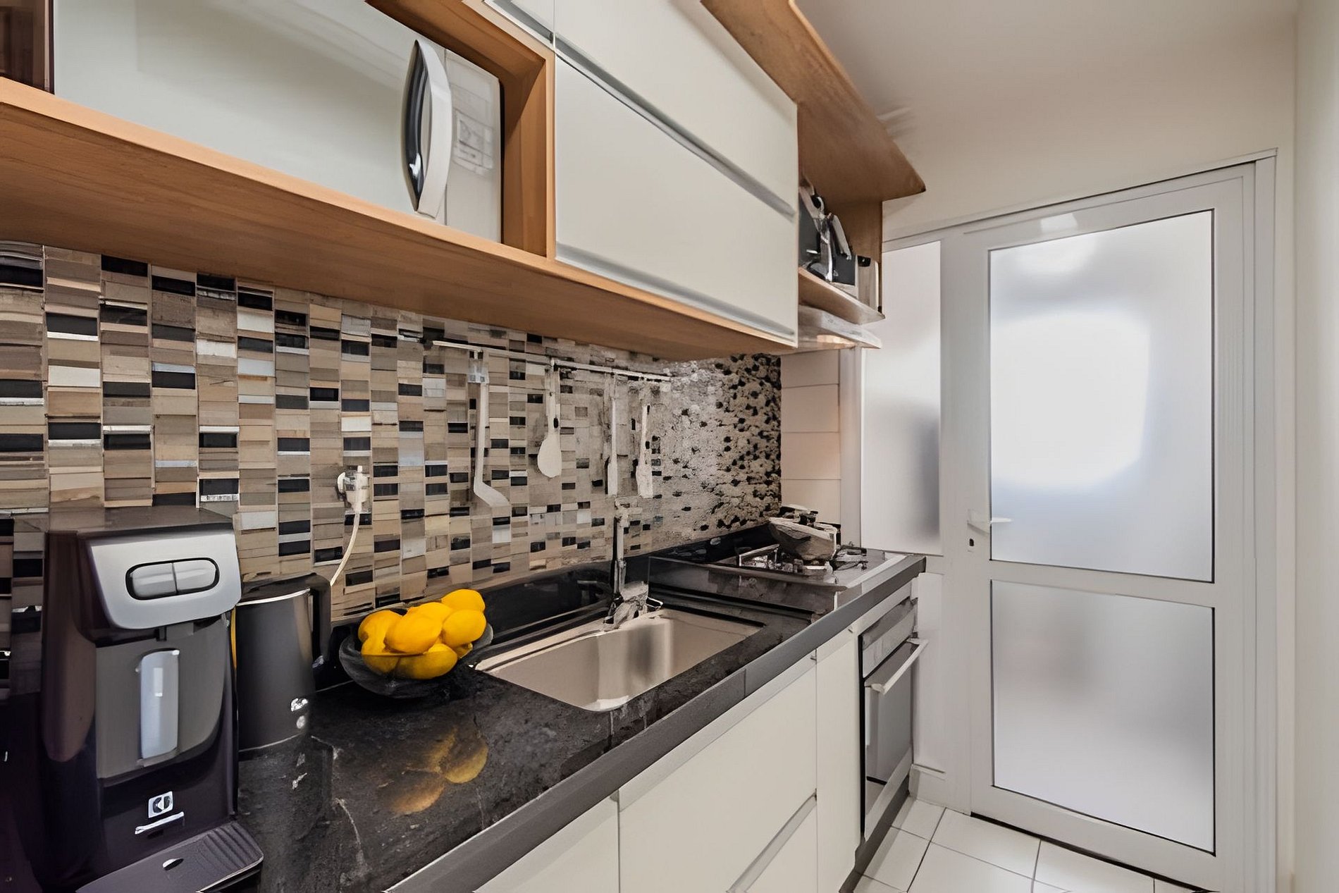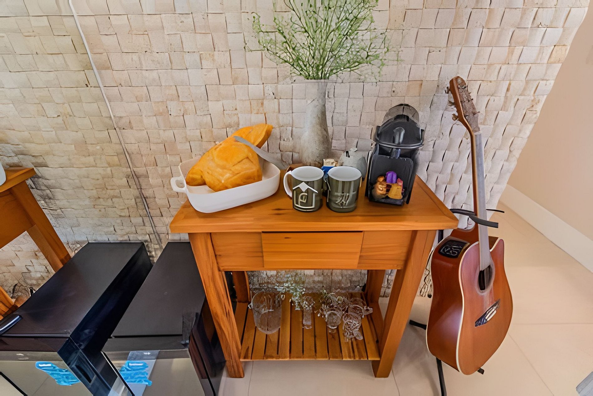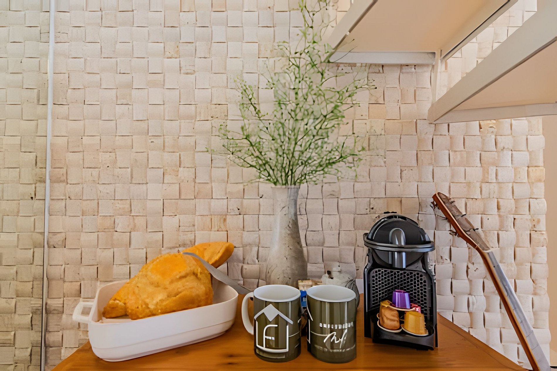 *Cozinha Completa: Equipada com eletrodomésticos de última geração (fogão, forno, micro-ondas, air fryer, cafeteira Nespresso, liquidificador, sanduicheira, torradeira, exaustor e filtro de água), além de todos os utensílios necessários para preparar suas refeições favoritas.