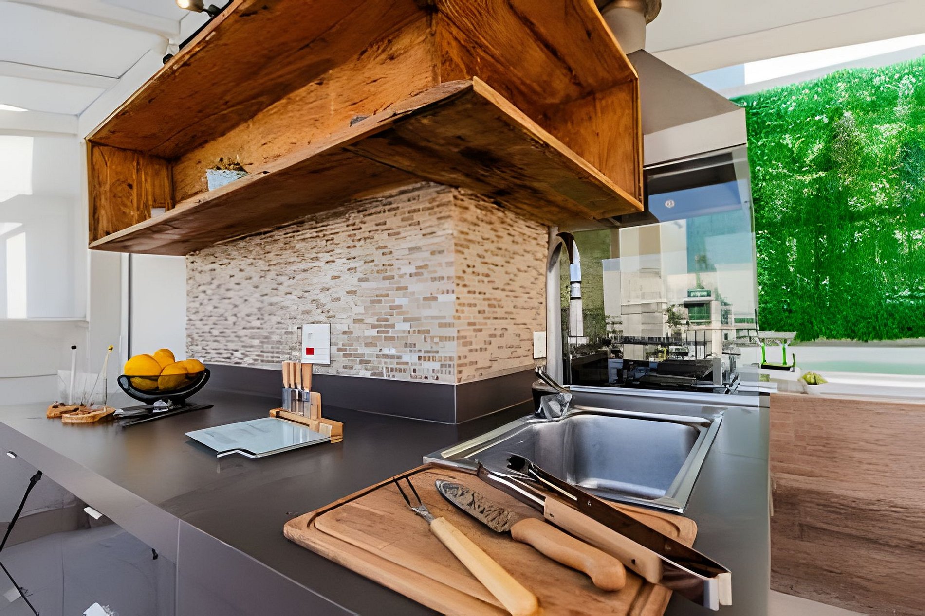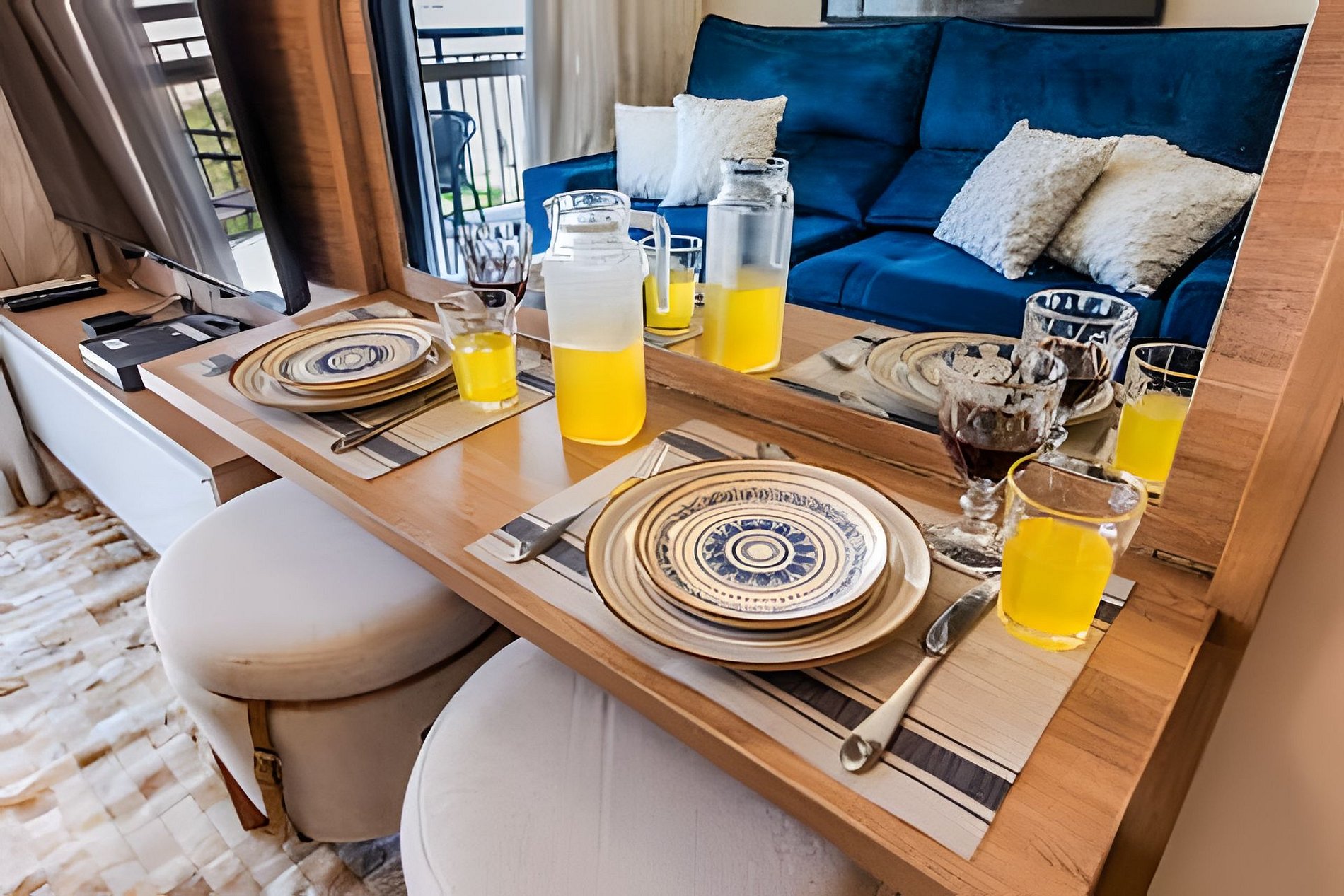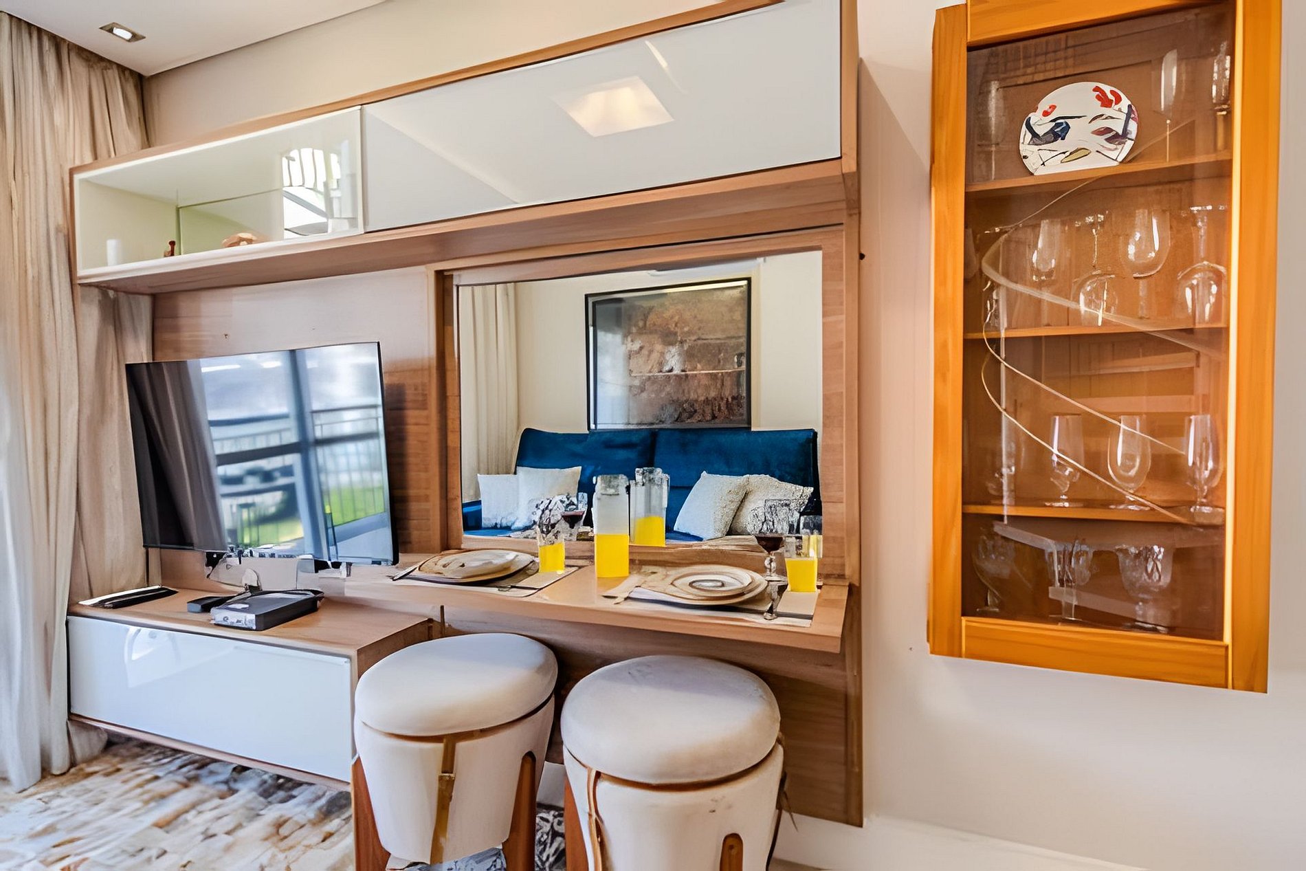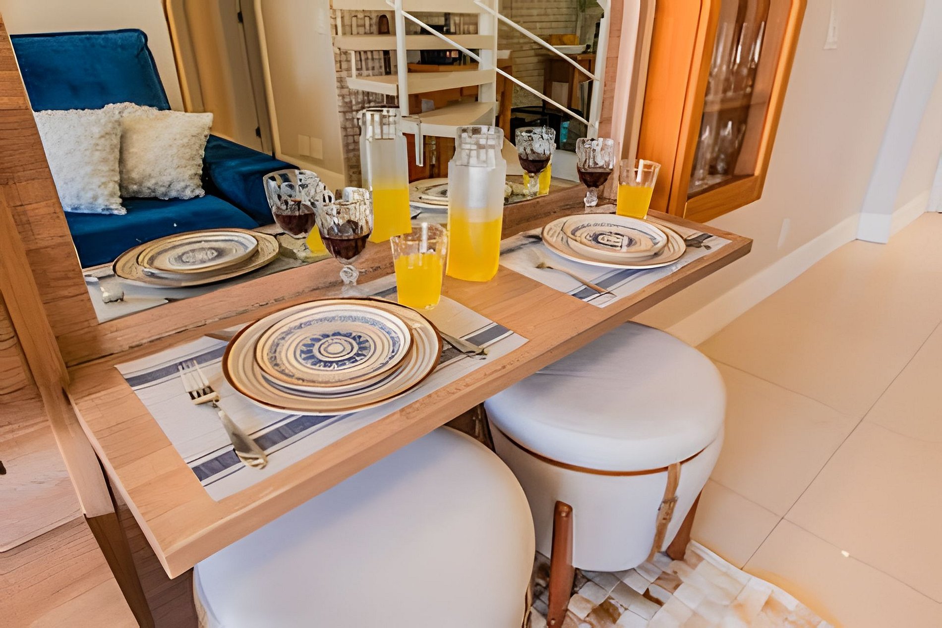 *Cozinha Completa: Equipada com eletrodomésticos de última geração (fogão, forno, micro-ondas, air fryer, cafeteira Nespresso, liquidificador, sanduicheira, torradeira, exaustor e filtro de água), além de todos os utensílios necessários para preparar suas refeições favoritas.