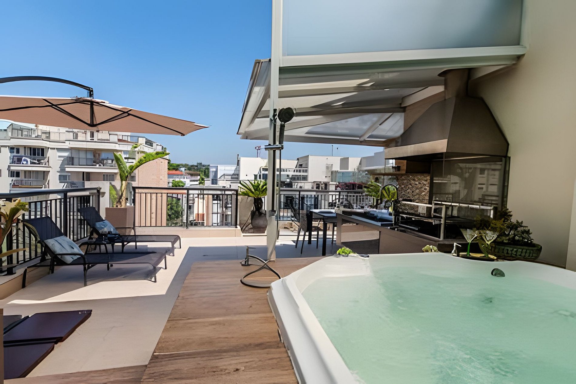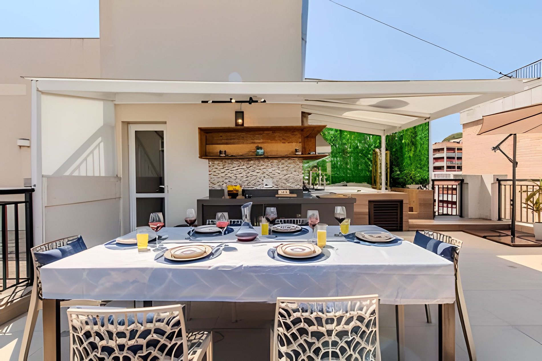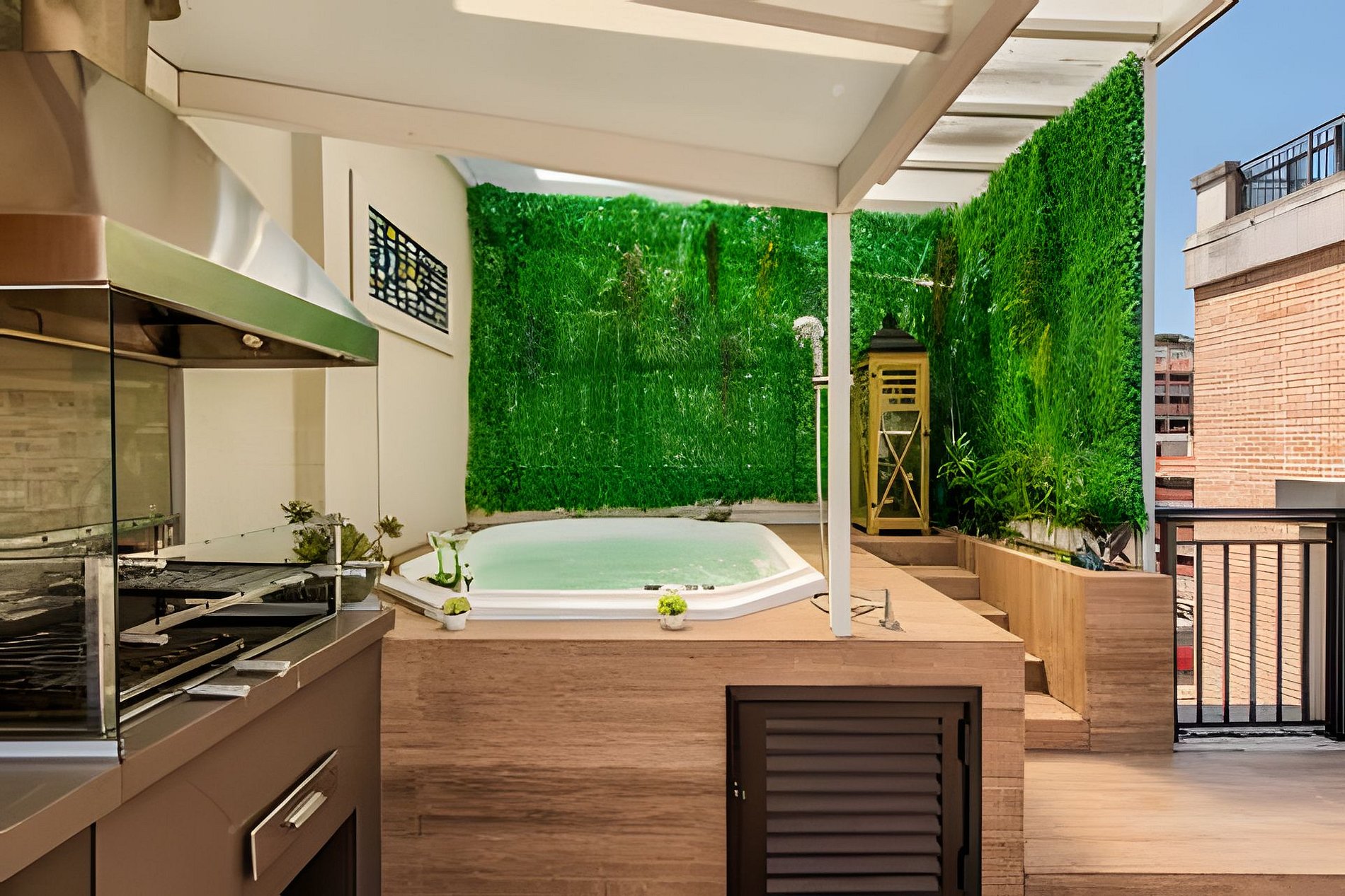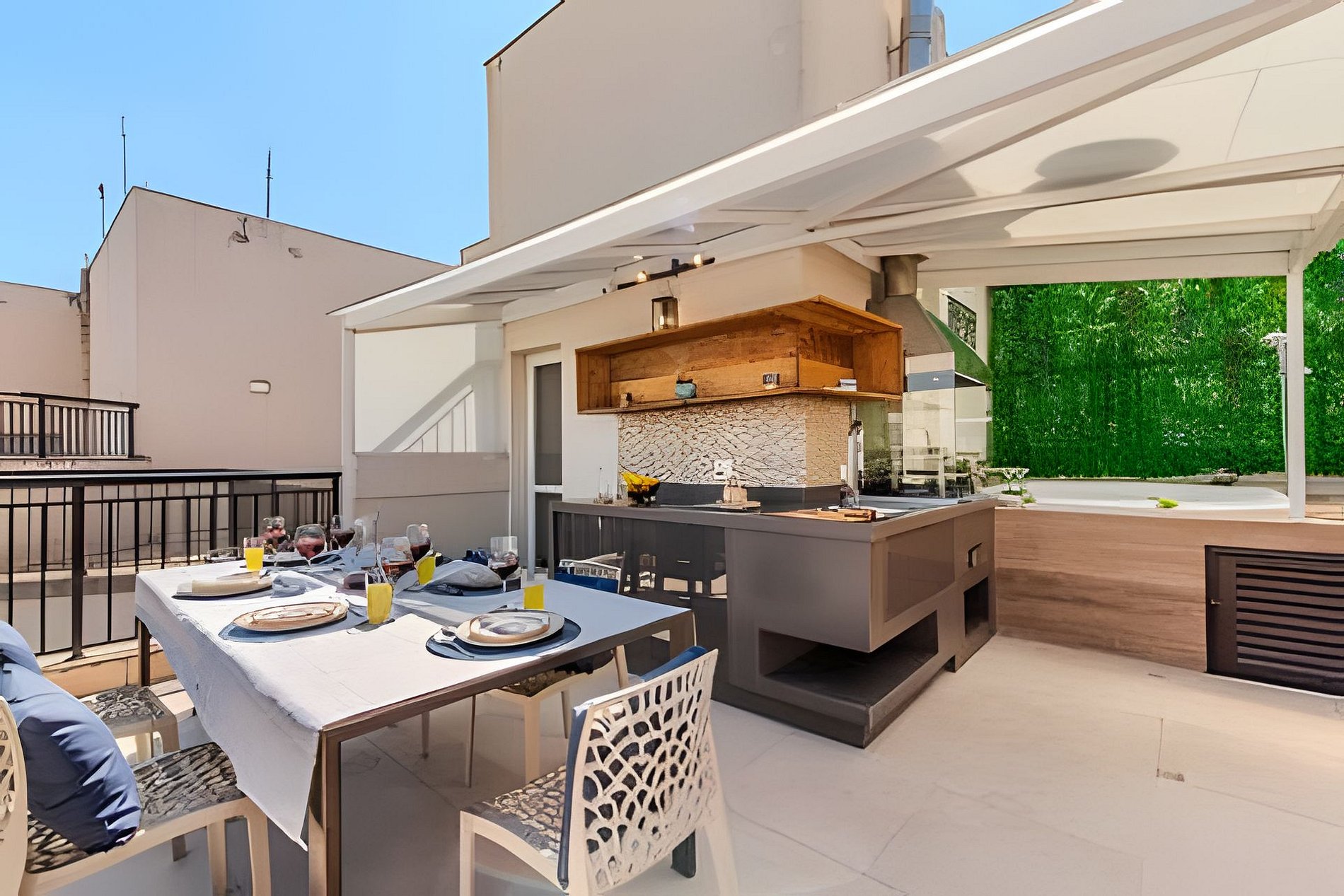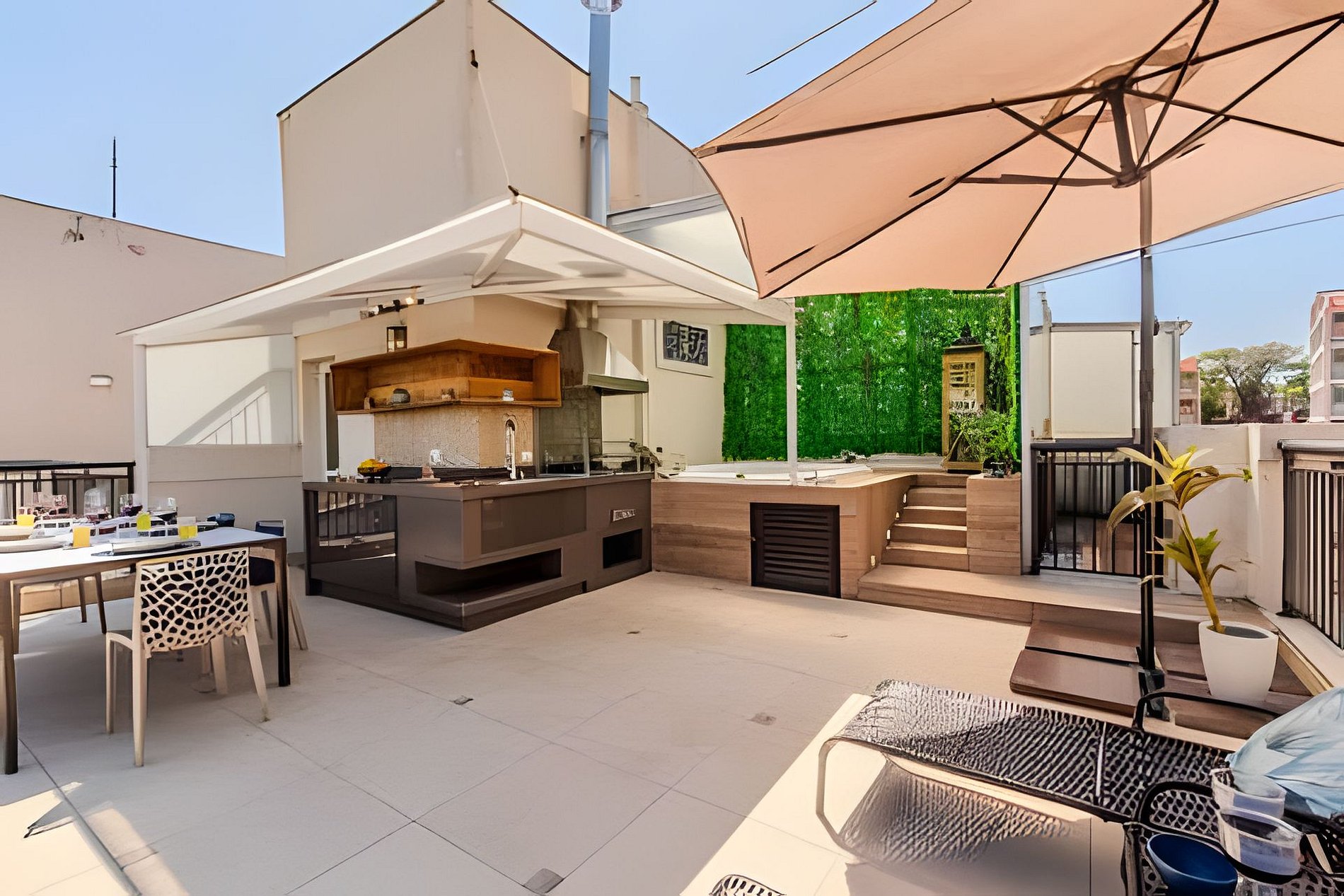 *No piso superior: desfrute da área de lazer privativa com jacuzzi e churrasqueira à disposição para uso livre e privativo.