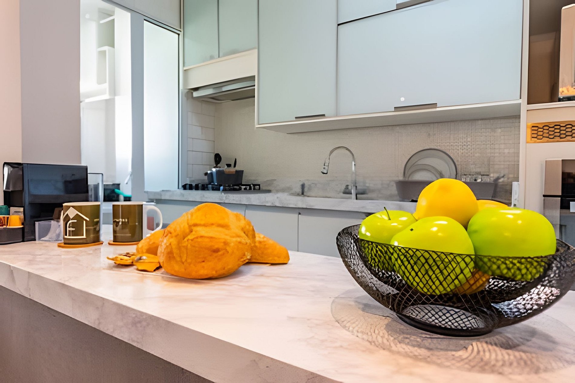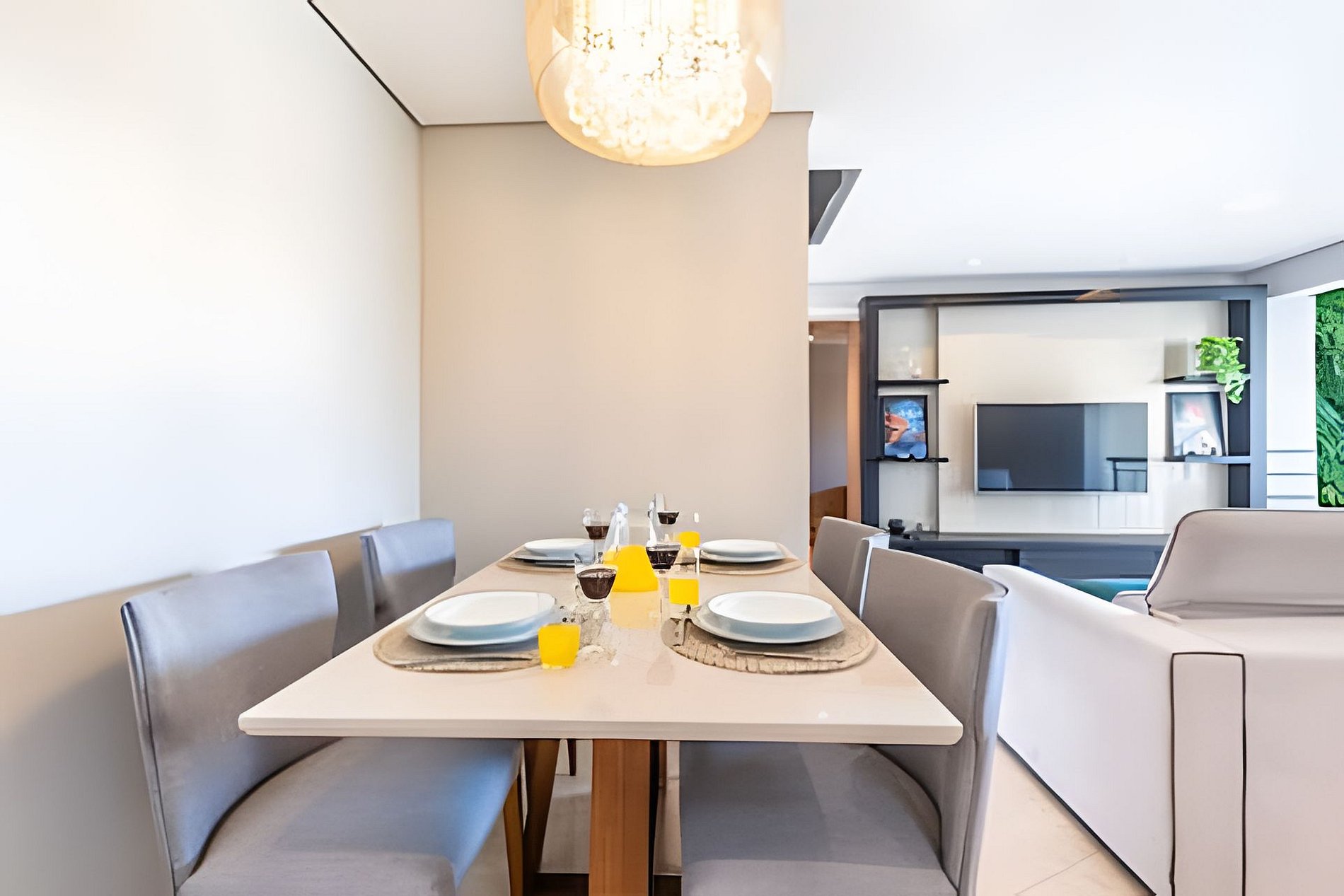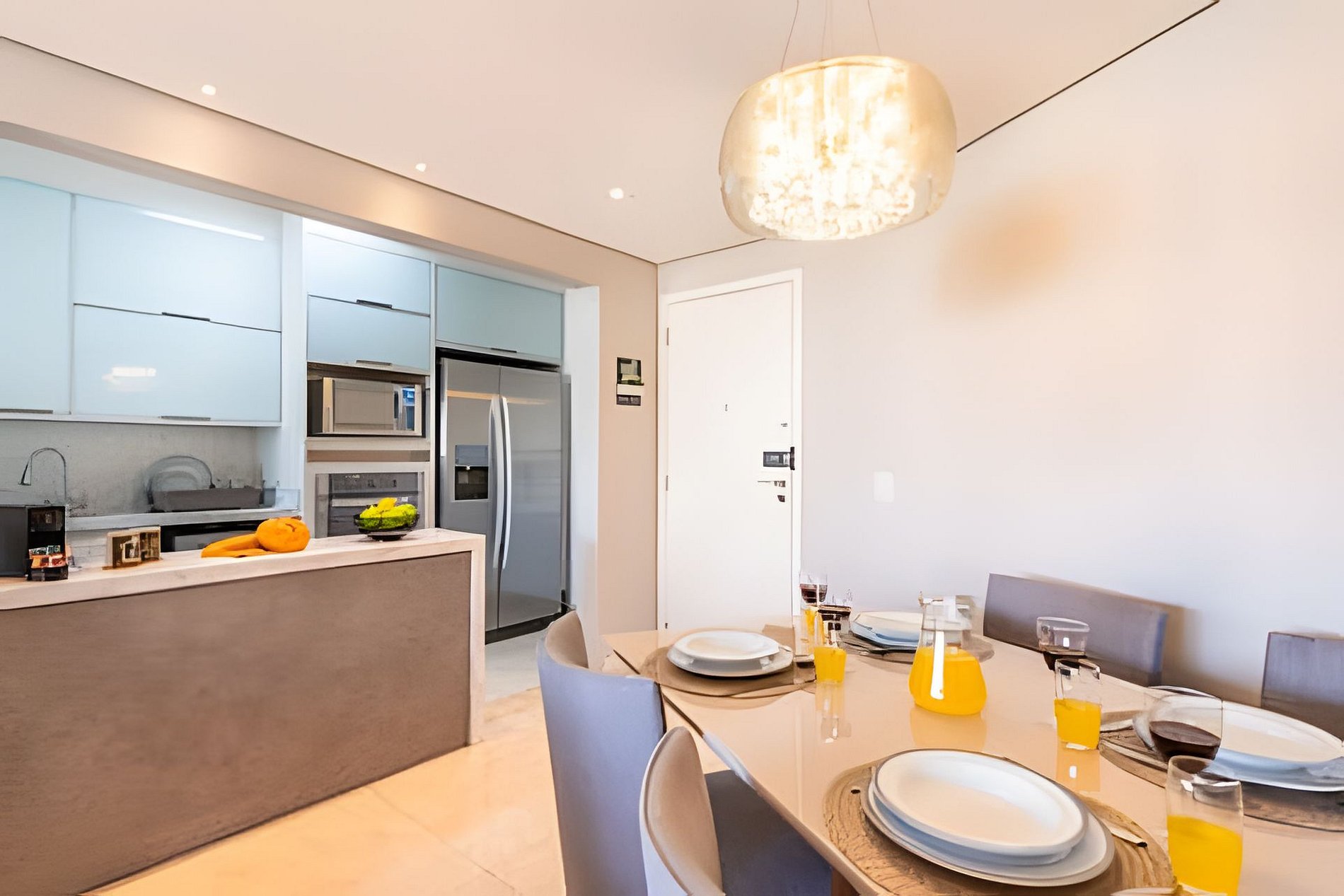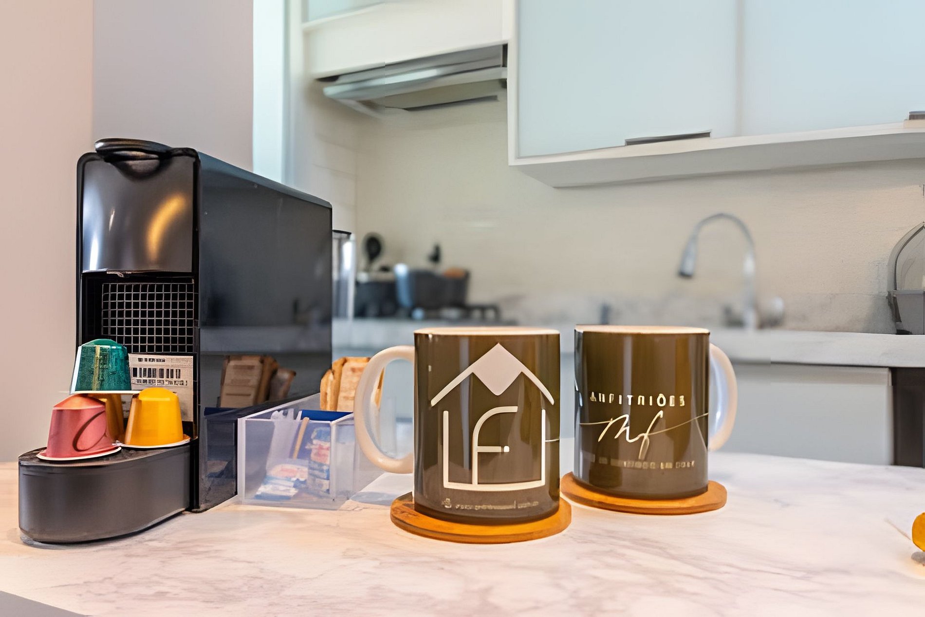 * Cozinha Completa: Equipamentos de última geração, incluindo máquina de lavar louças, fogão, forno elétrico, air-fryer, sanduicheira, torradeira, liquidificador, filtro de água e todos os utensílios necessários.