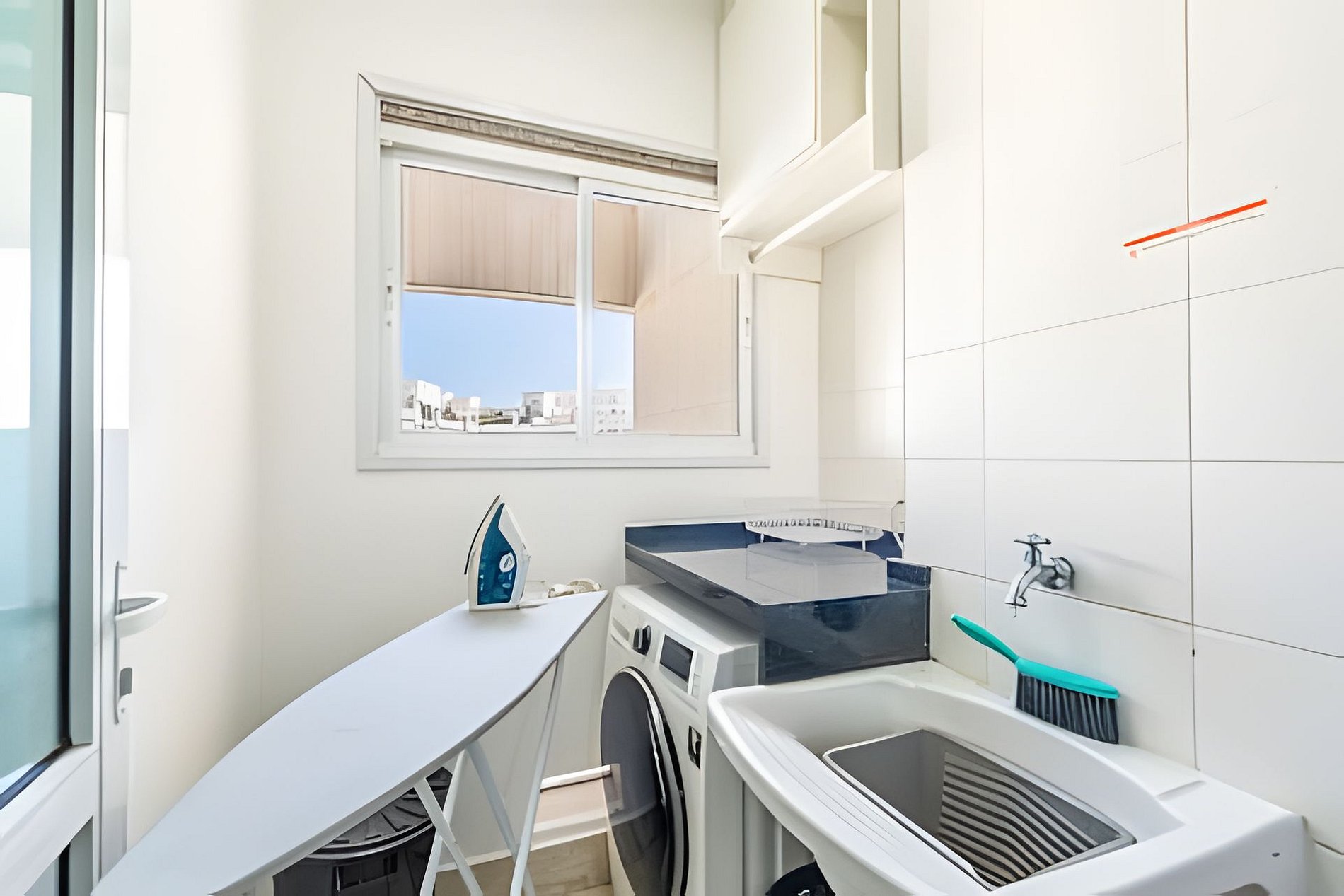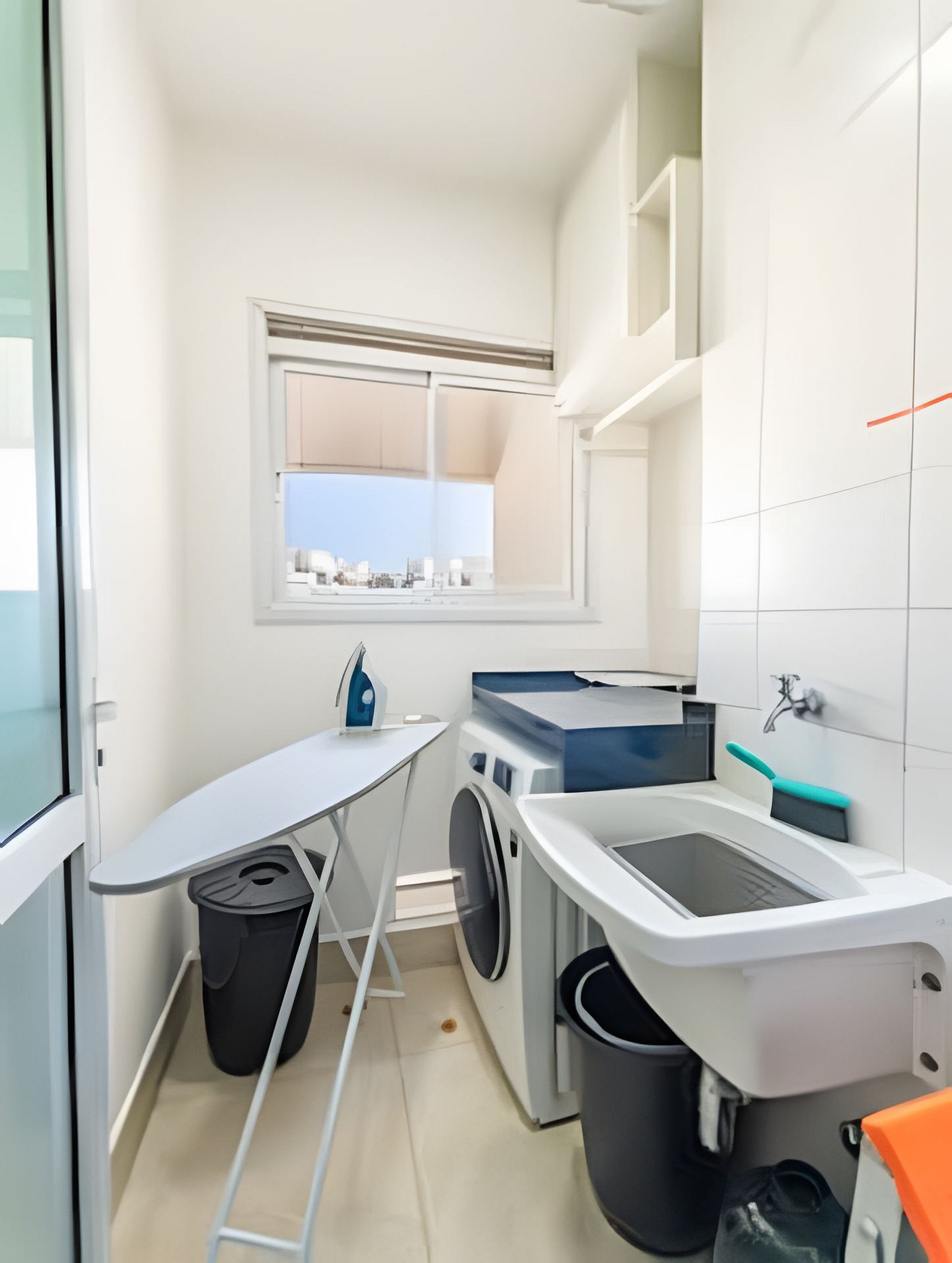 * Área de Serviço: Com máquina de lavar e secar e varal.