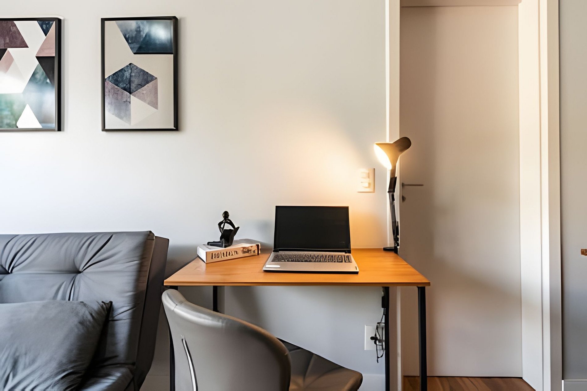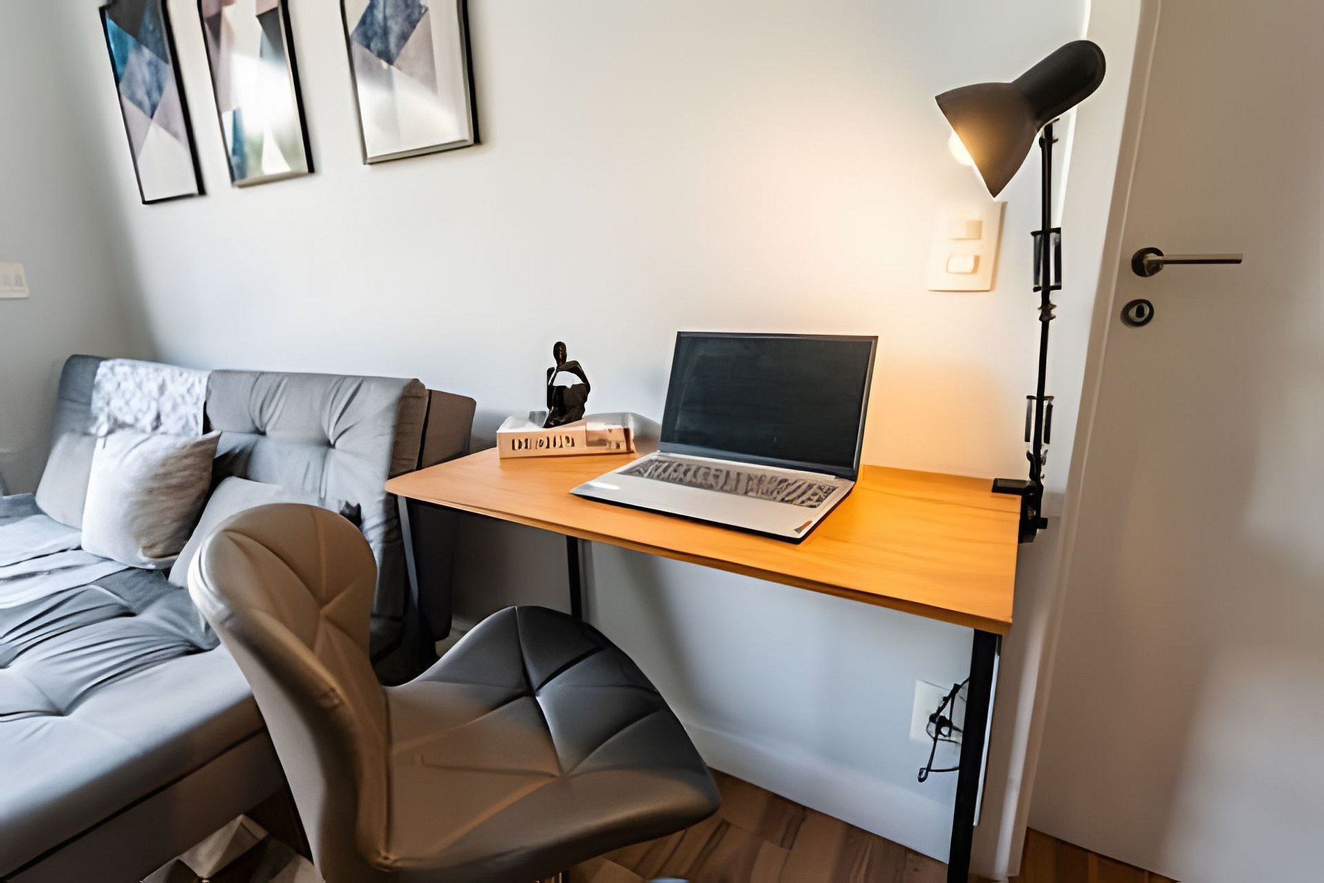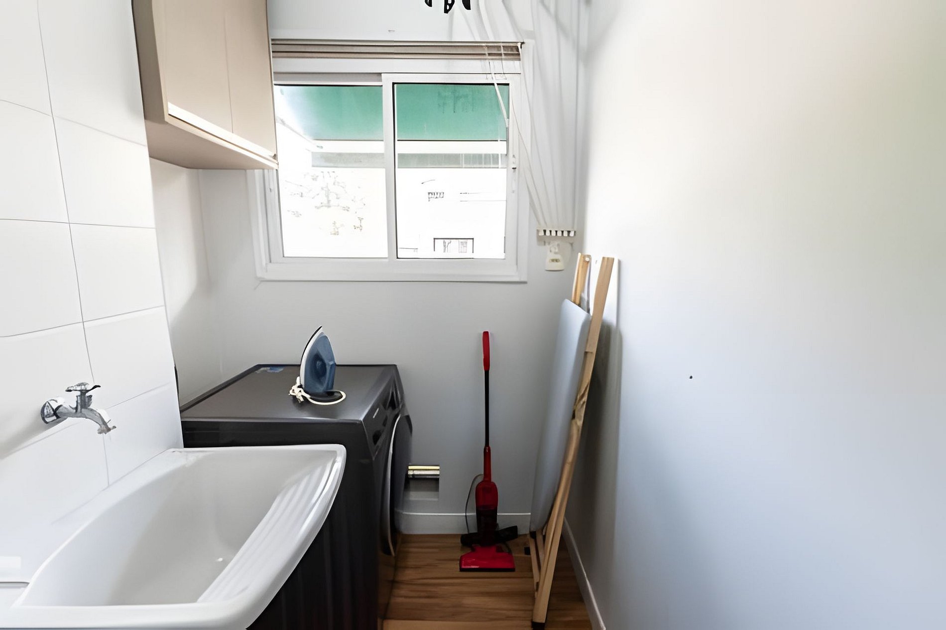 * Área de Serviço: Equipada com máquina de lavar e secar roupas, ferro, varal de teto e lixeira para sua conveniência. * Espaços de Trabalho: Um local dedicado ao home office, localizado na sala de estar.
