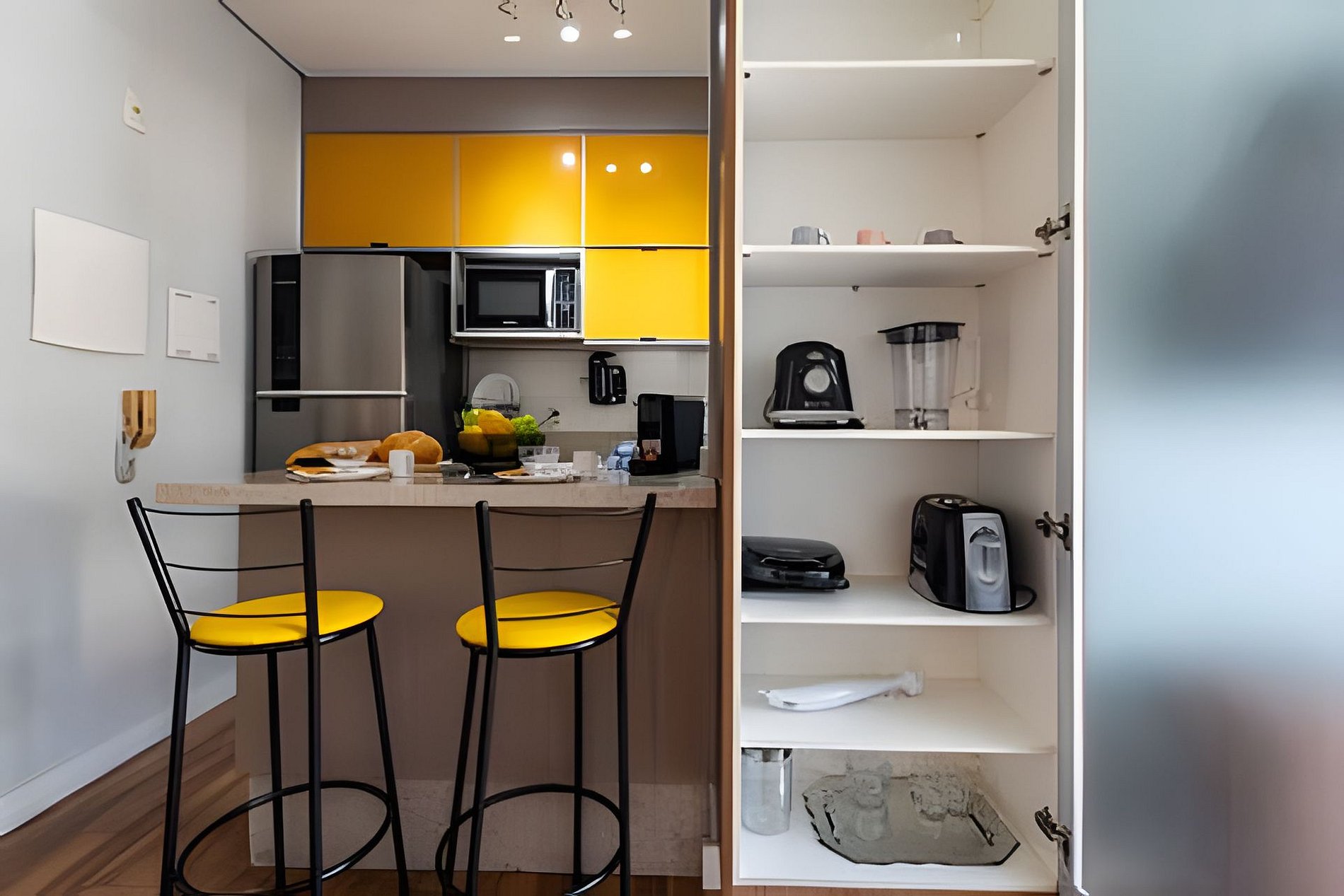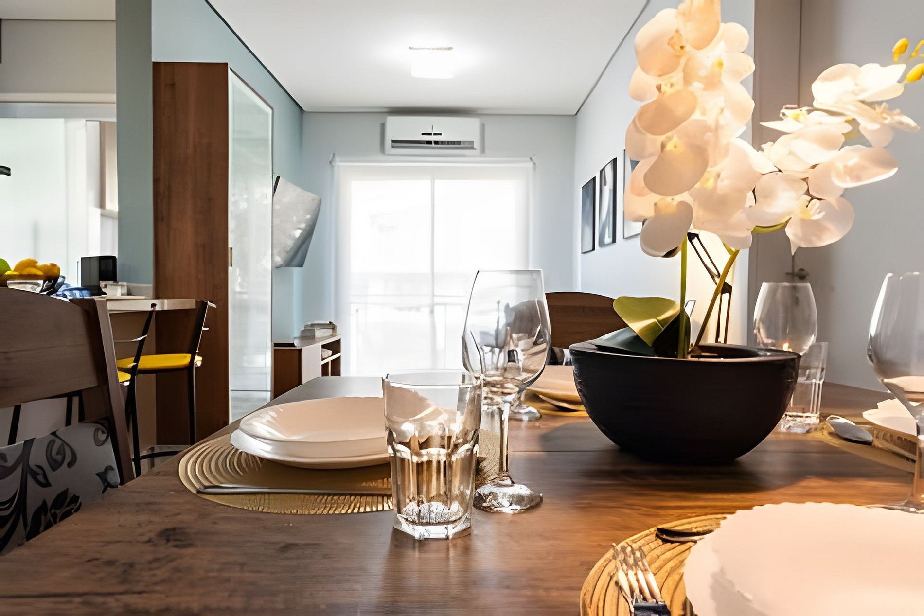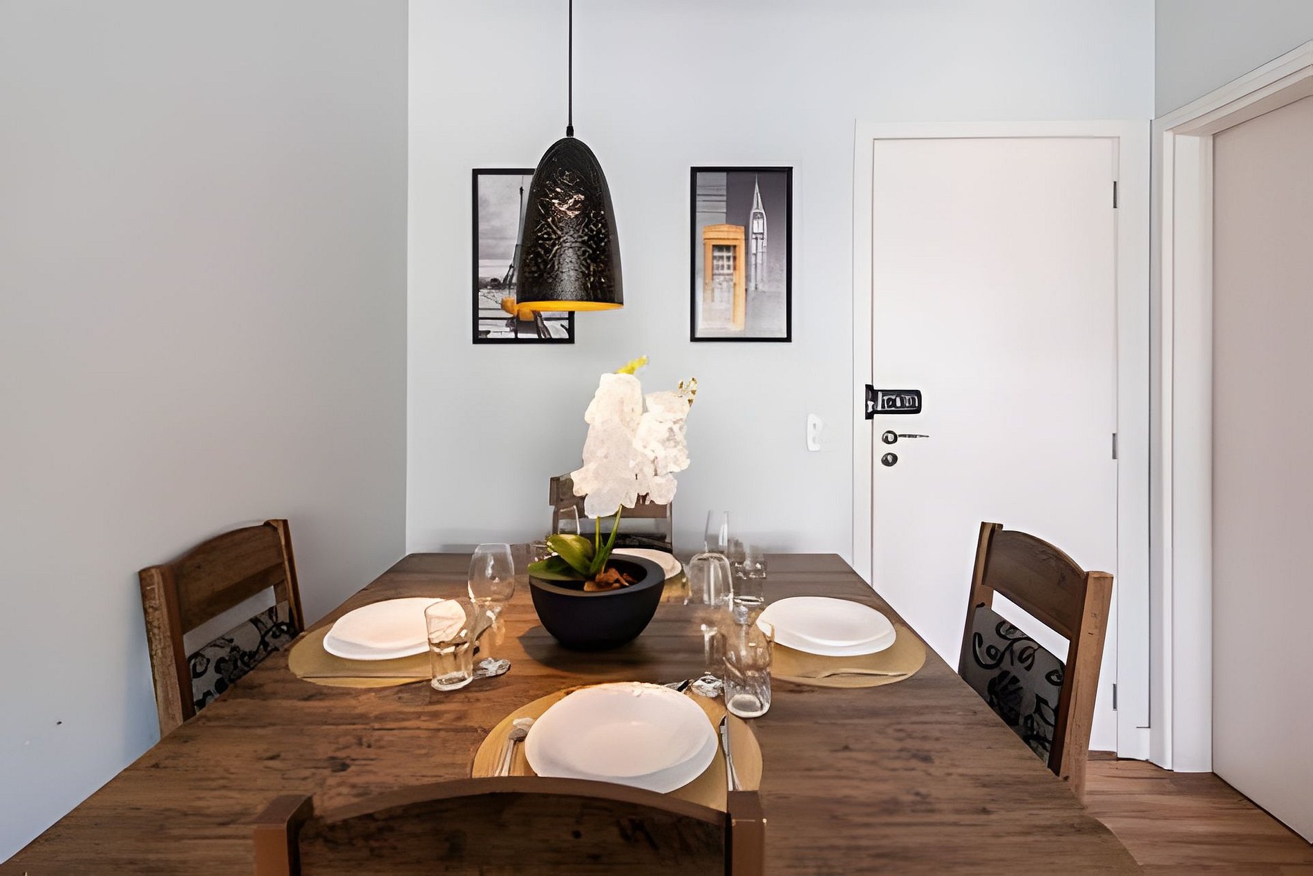 * Sala de Jantar: Charmosa e funcional, com uma mesa que acomoda 4 cadeiras, além de uma bancada espaçosa com 2 cadeiras altas, perfeita para lanches e refeições altas.