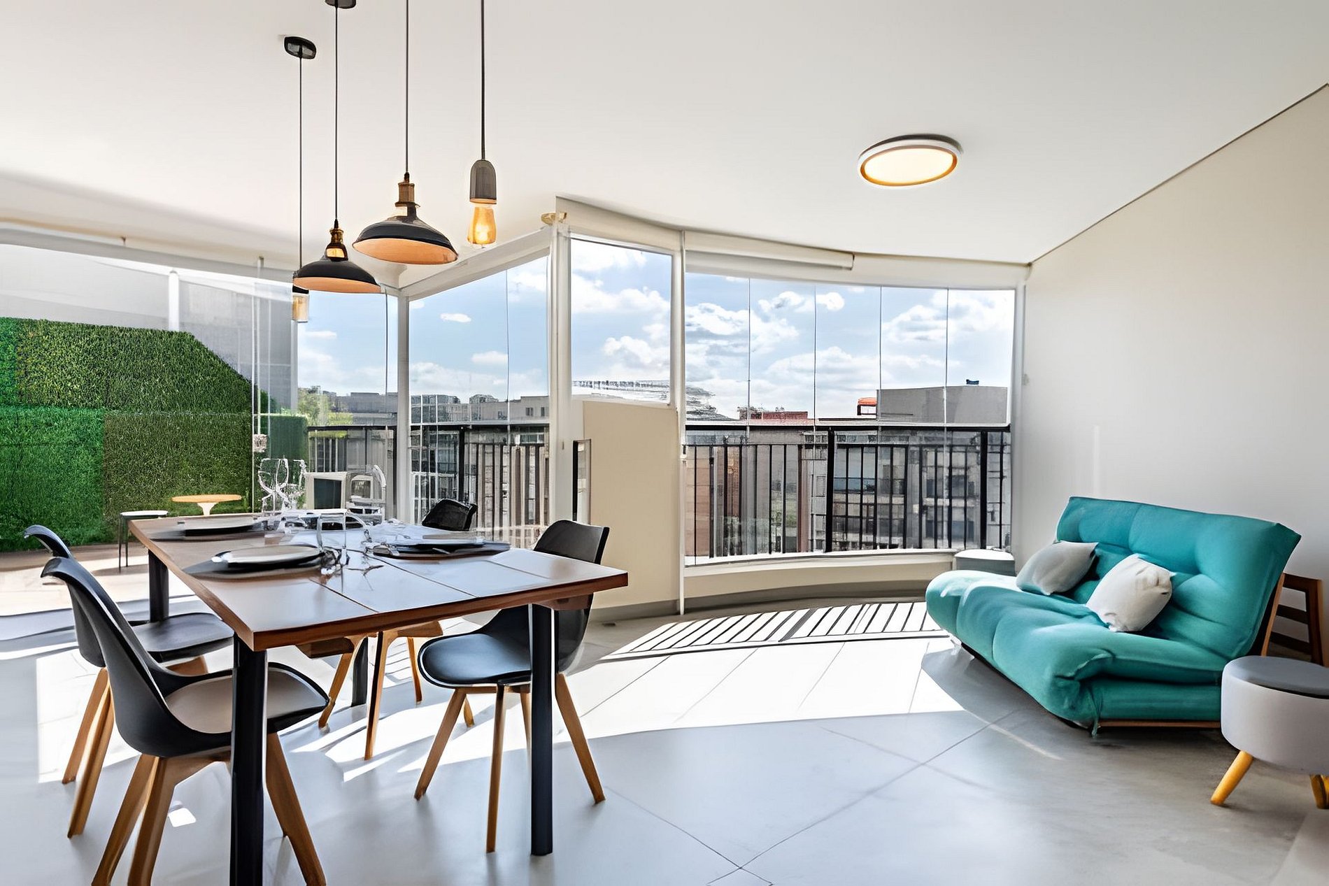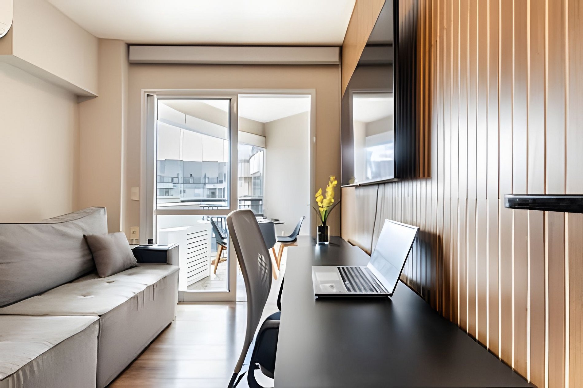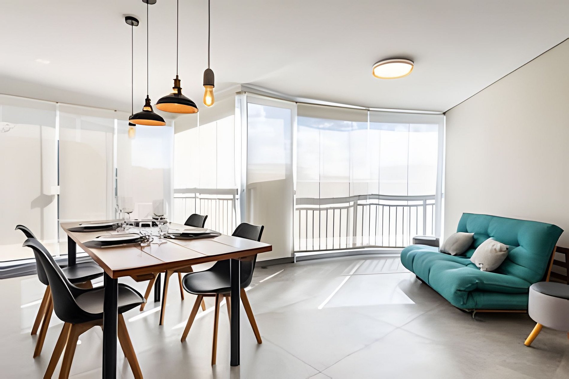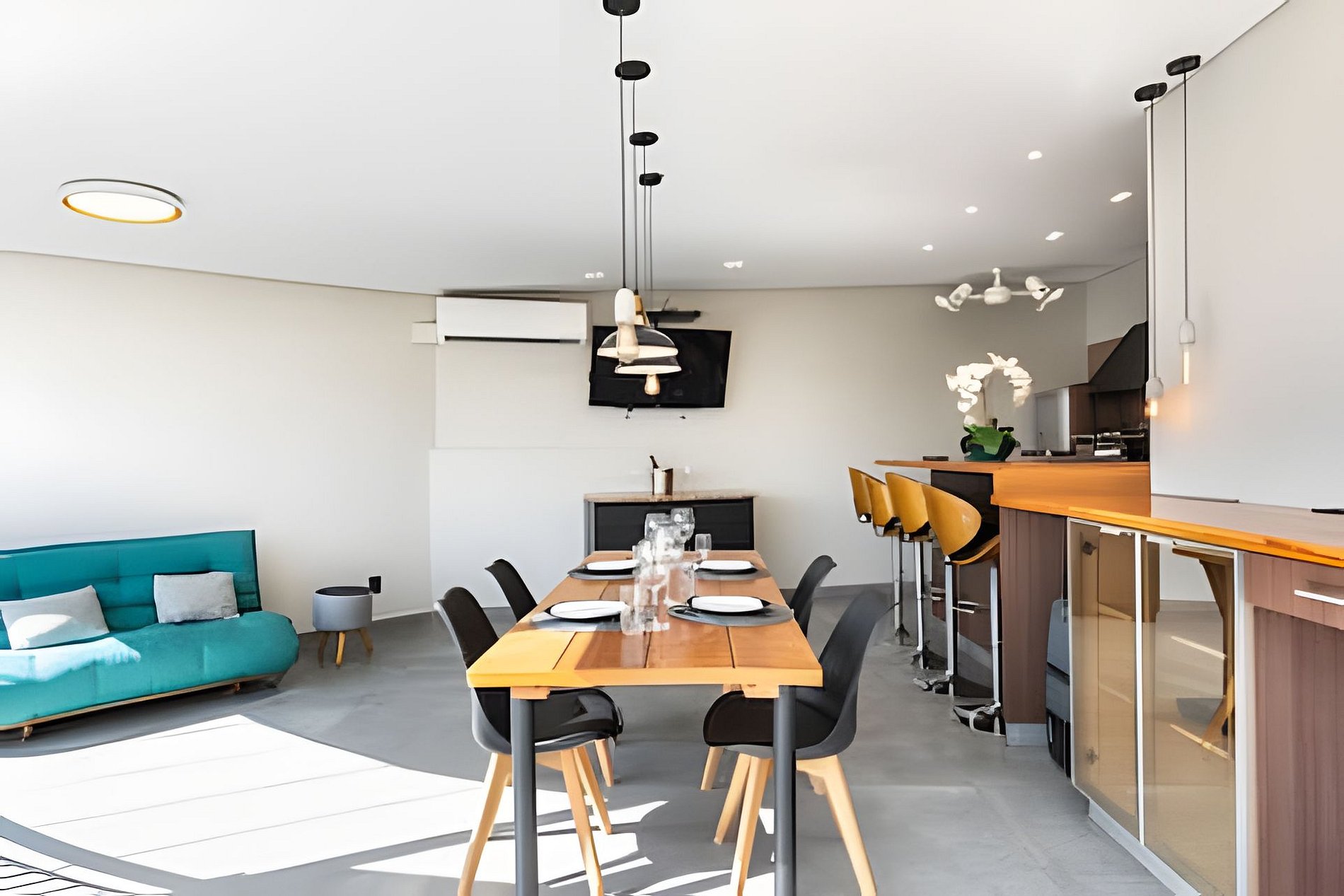 * Sala de Estar: Espaçosa, com sofá que se transforma em uma cama de casal e TV de 55’ para uma experiência de cinema em casa.