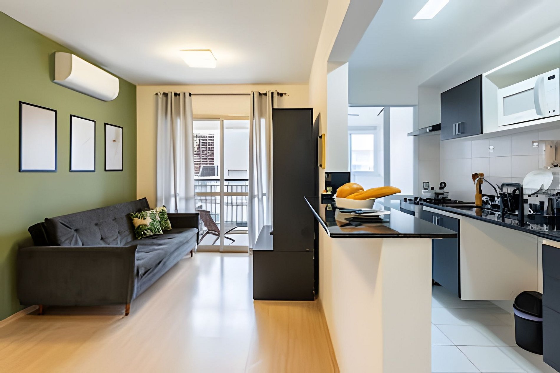 * Sala de Estar: Ampla e acolhedora, equipada com Smart TV e um sofá cama, ideal para momentos de relaxamento.