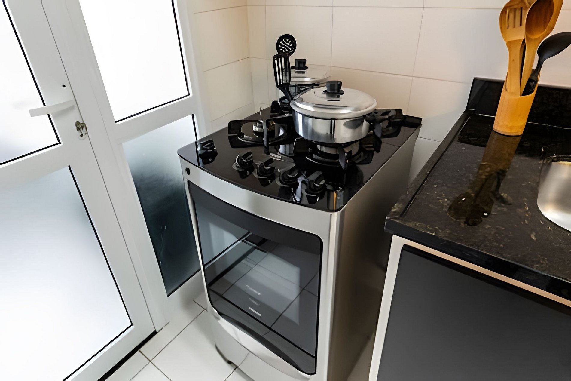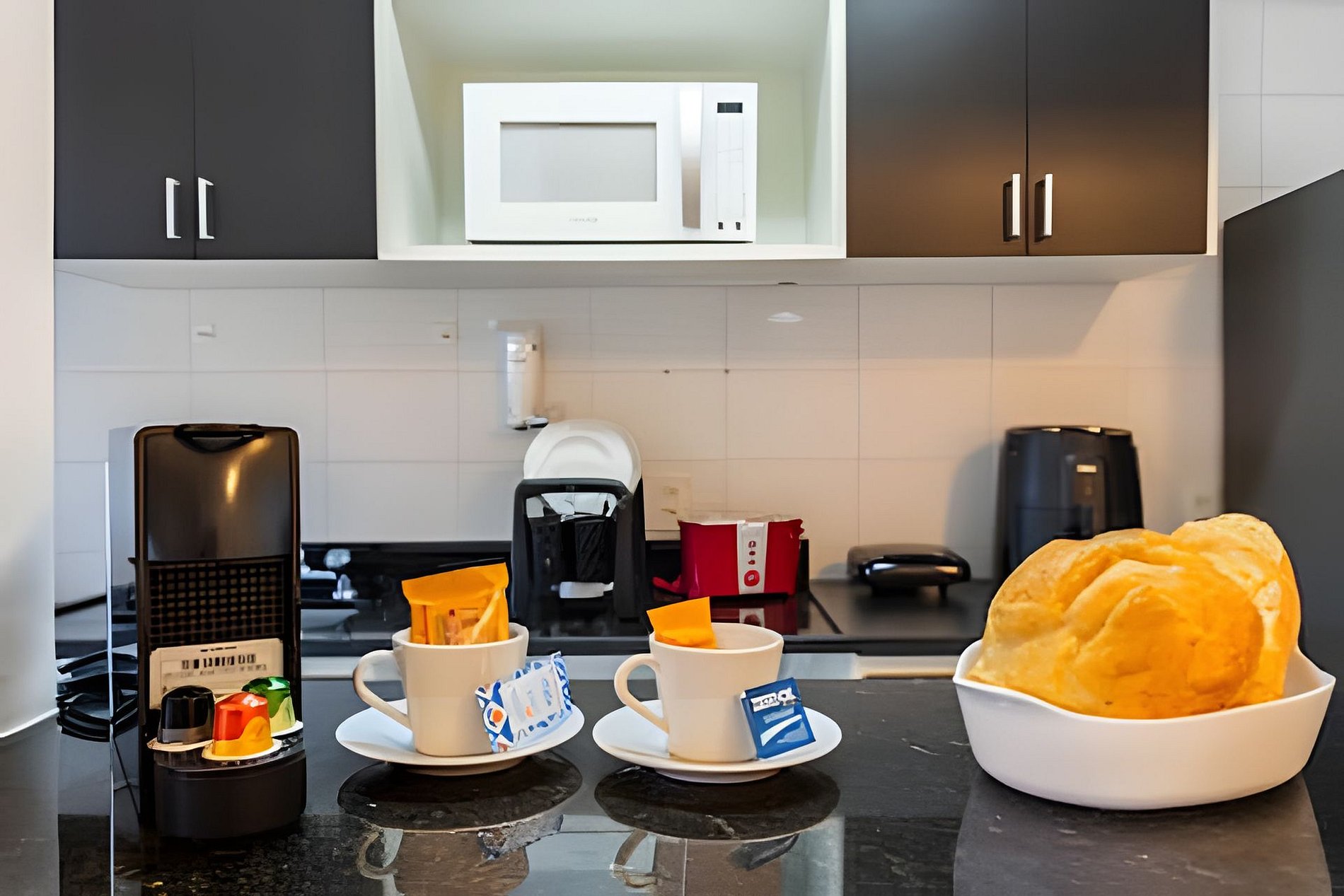 * Cozinha Completa: Com eletrodomésticos modernos (fogão, forno, exaustor, micro-ondas, cafeteira Nespresso, liquidificador, sanduicheira, torradeira, filtro de água) e todos os utensílios necessários para preparar suas refeições favoritas.