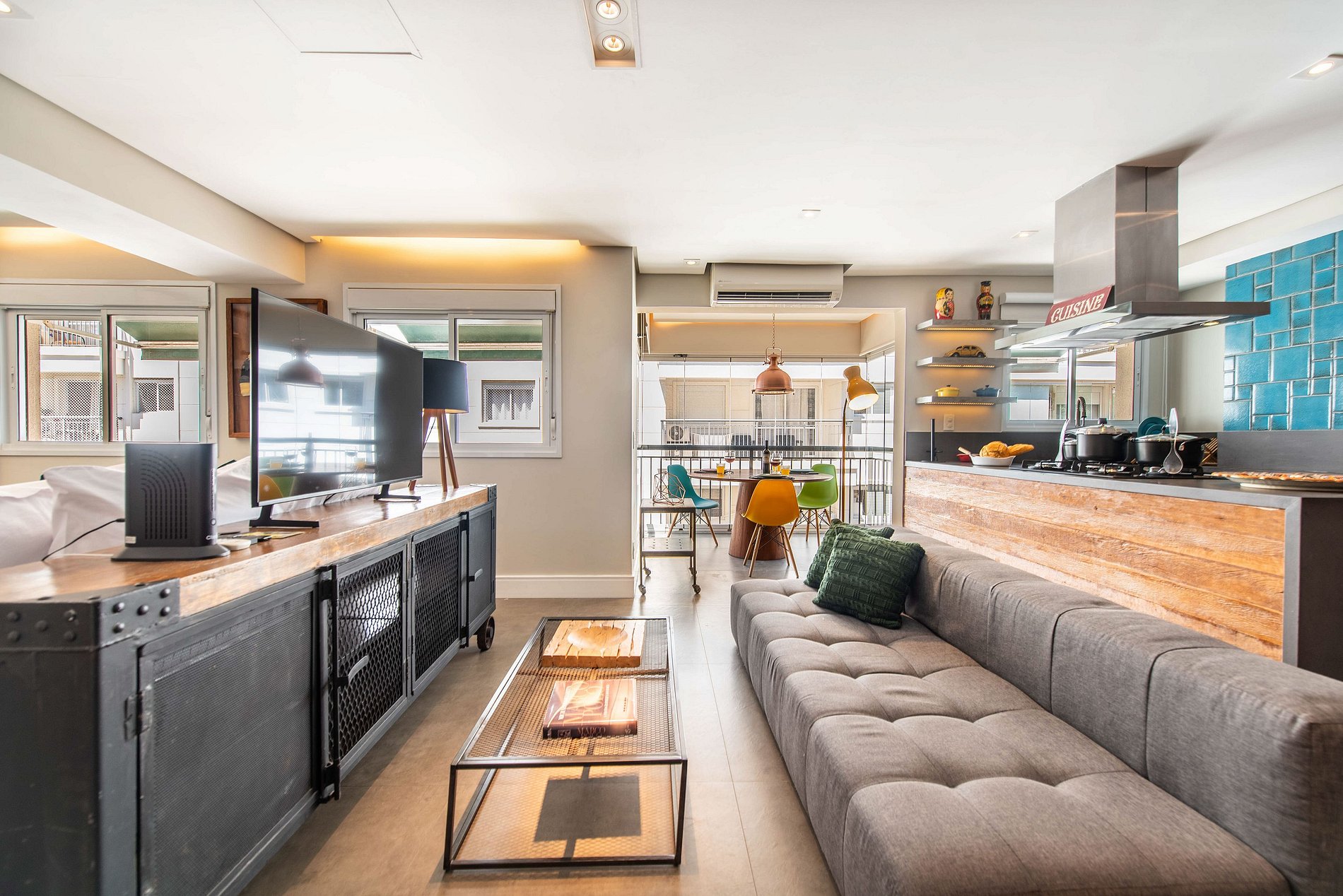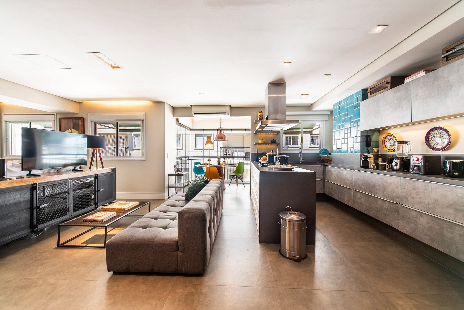 * Sala de Estar Integrada: Acolhedora, equipada com TV 50' e um sofá, ideal para momentos de relaxamento.