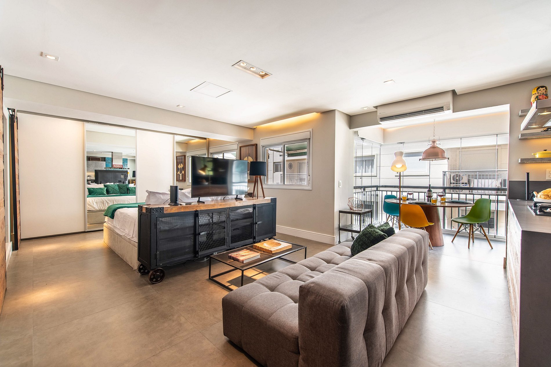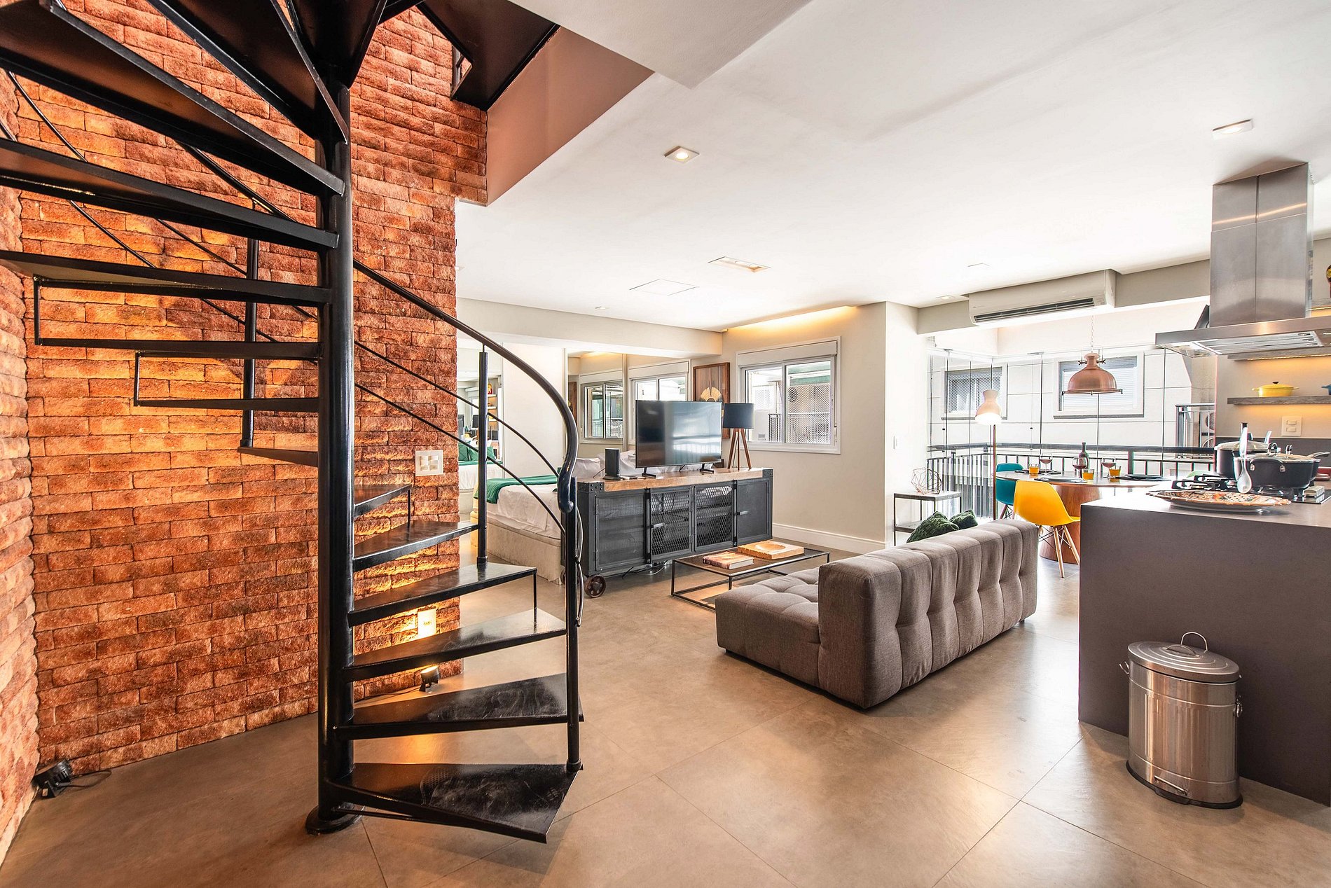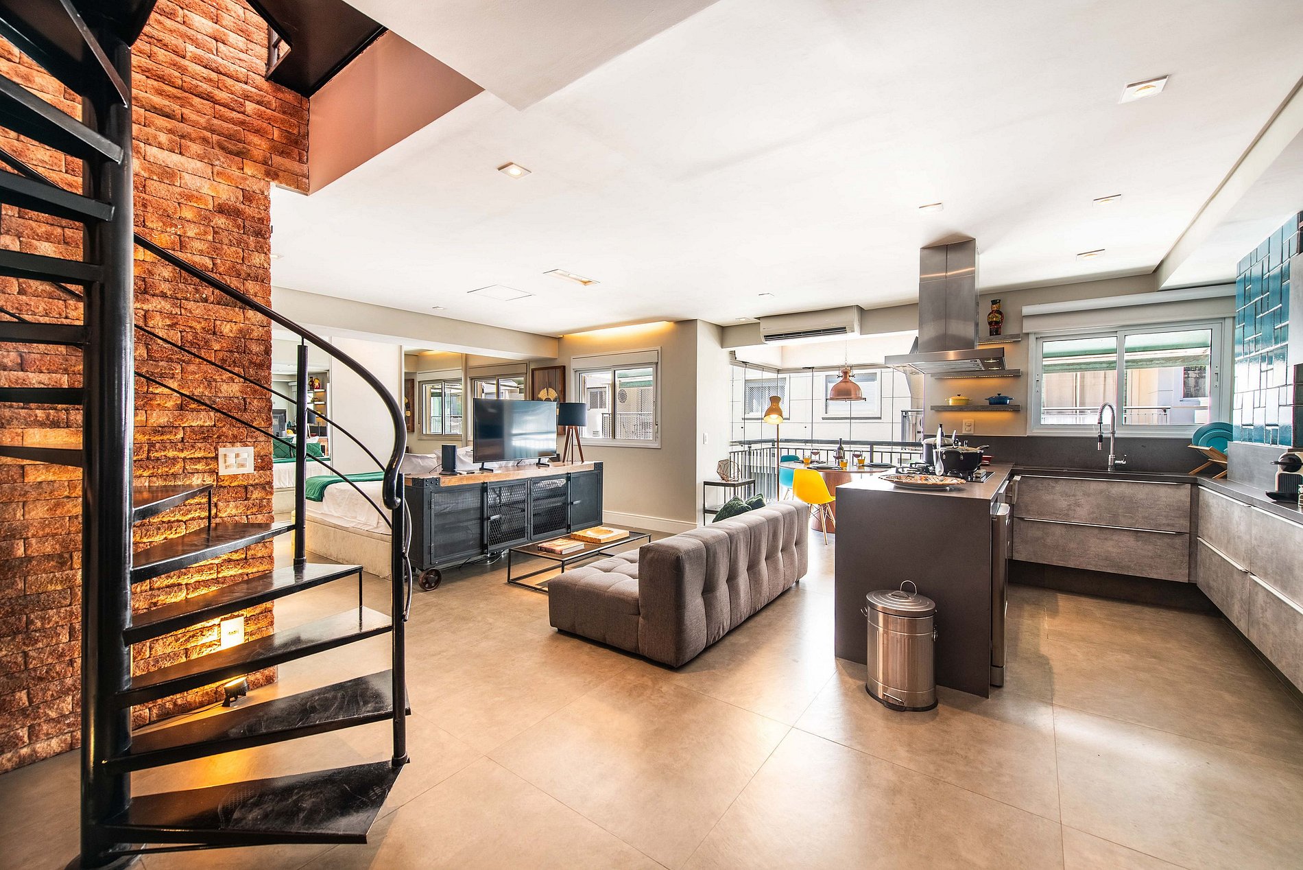 * Sala de Estar Integrada: Acolhedora, equipada com TV 50' e um sofá, ideal para momentos de relaxamento.