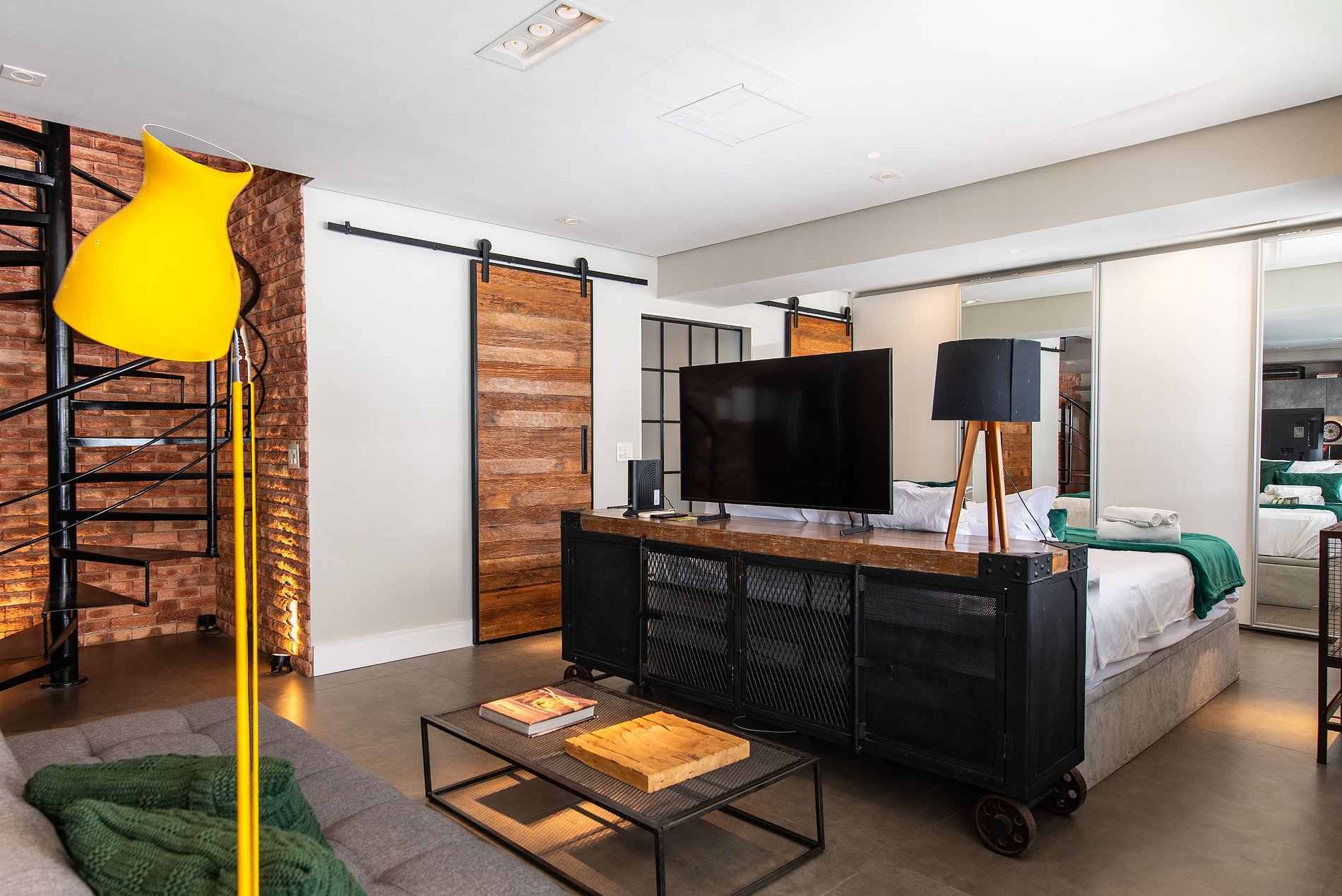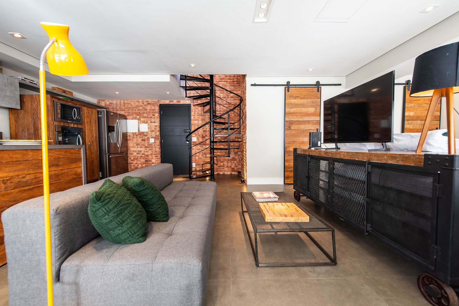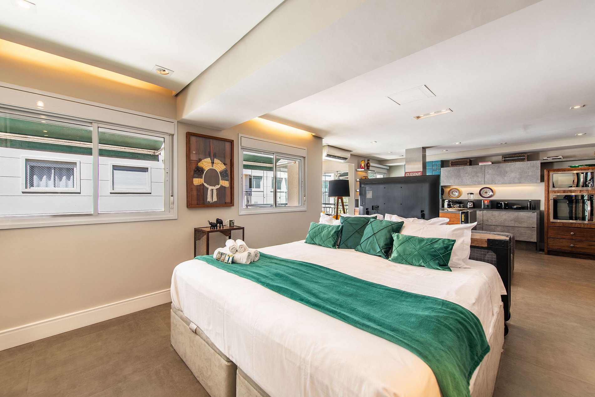 * Sala de Estar Integrada: Acolhedora, equipada com TV 50' e um sofá, ideal para momentos de relaxamento.