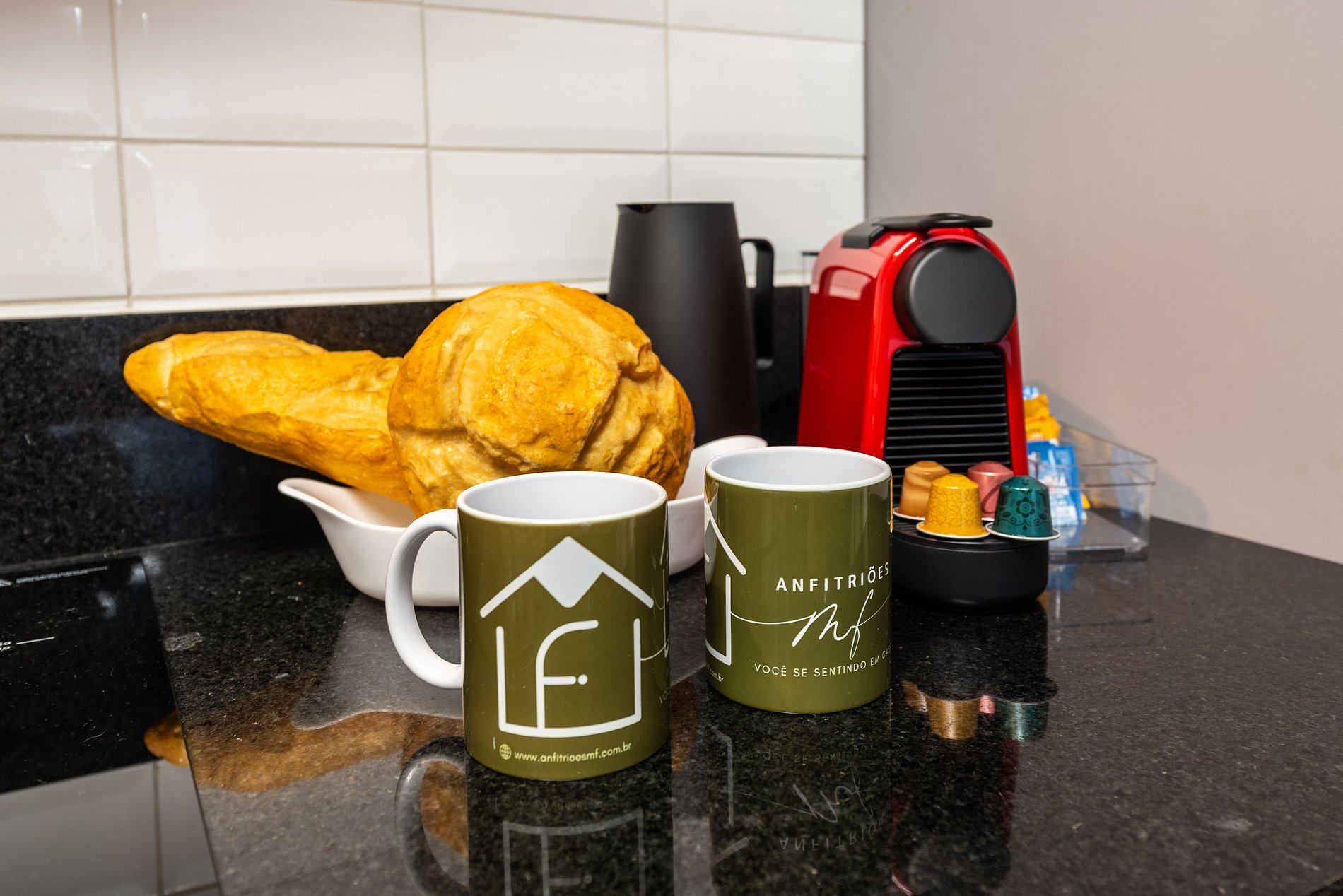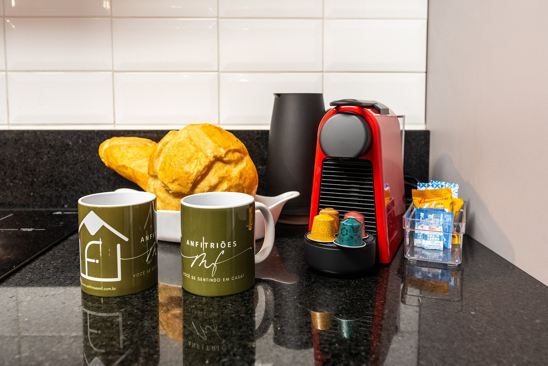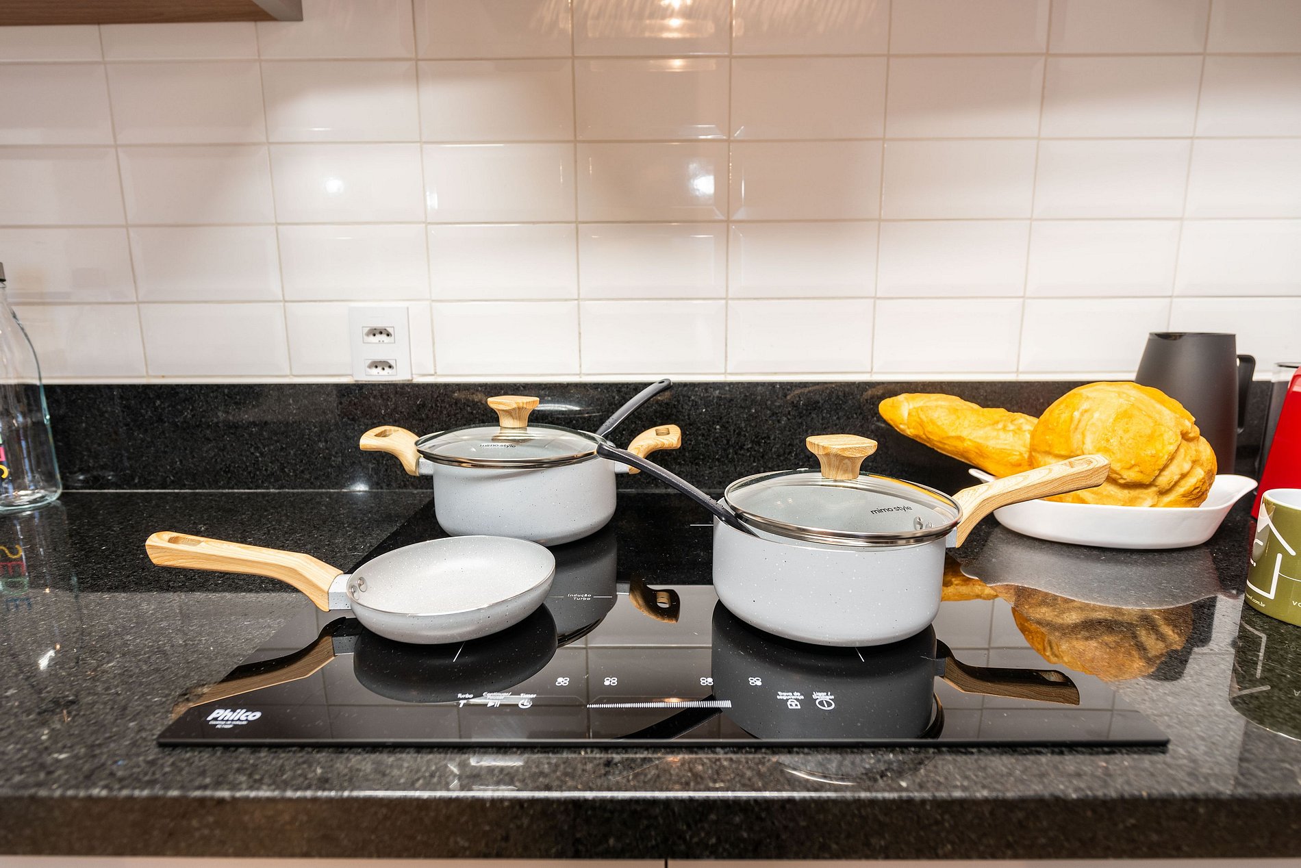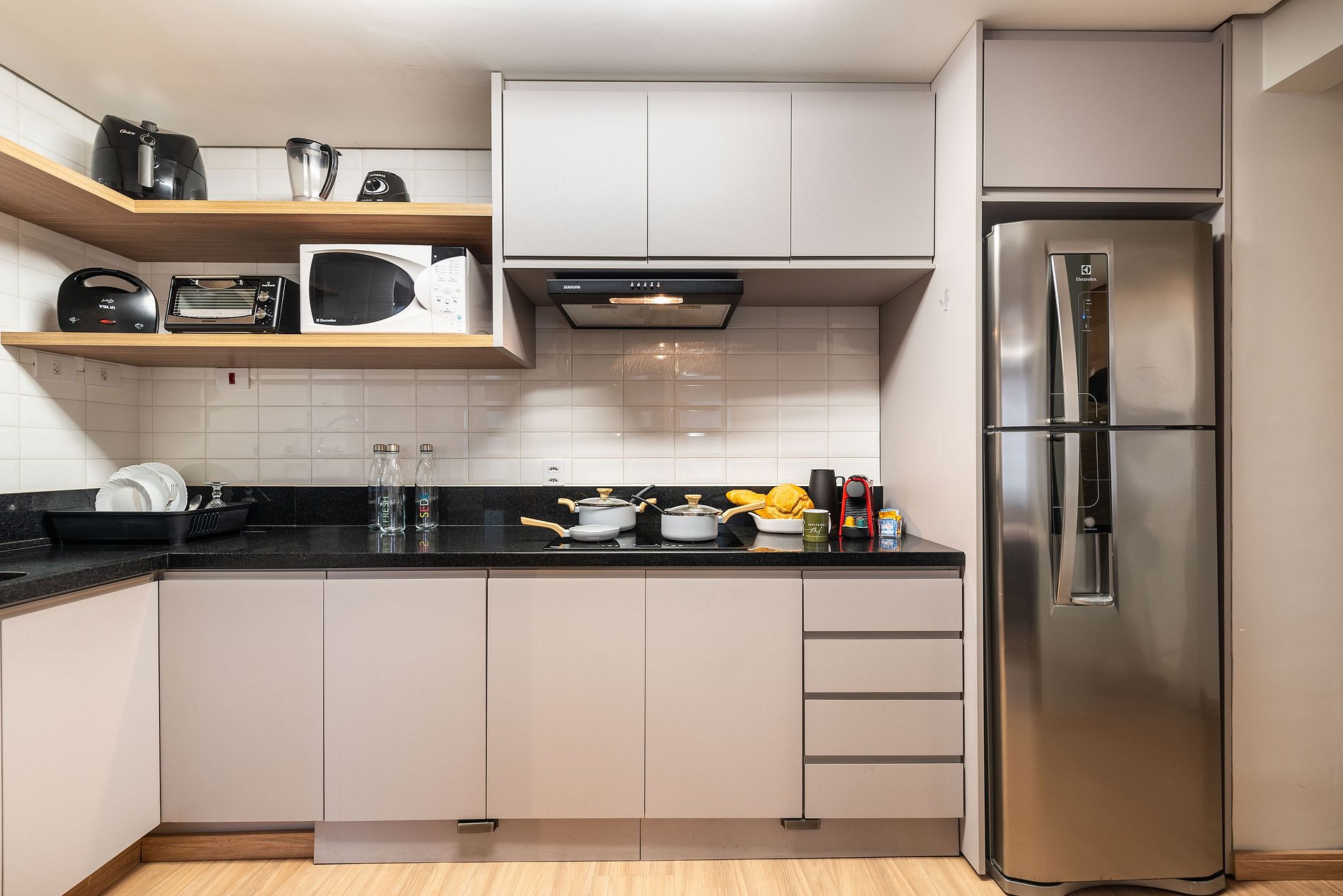 *Cozinha totalmente equipada, com geladeira, fogão por indução, Airfryer, liquidificador, cafeteira Nespresso e utensílios completos