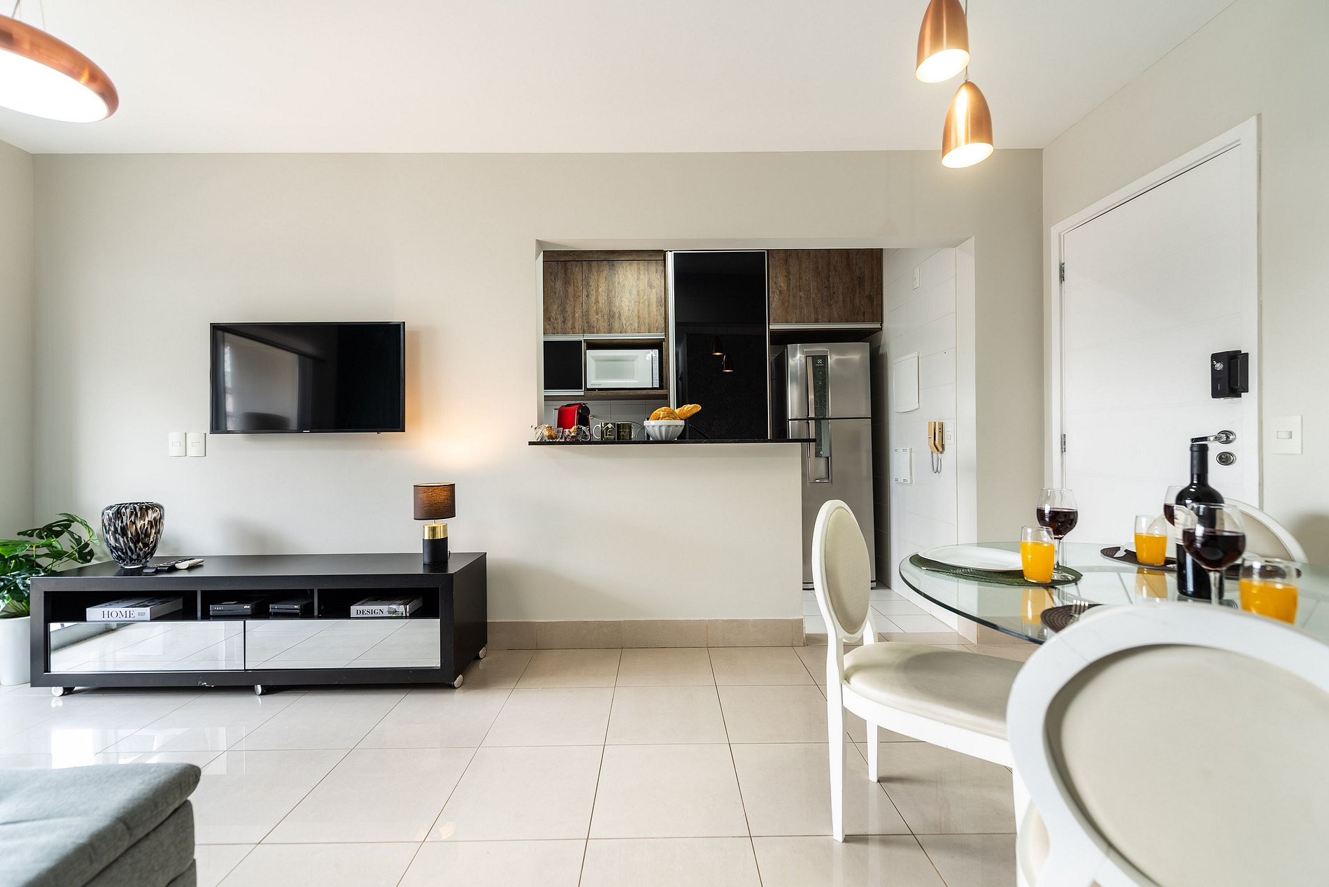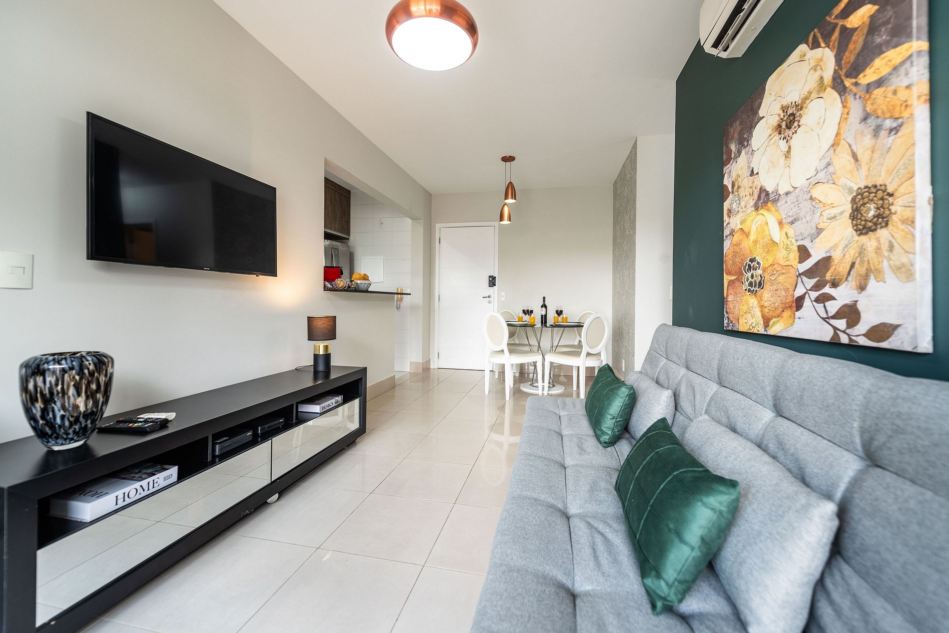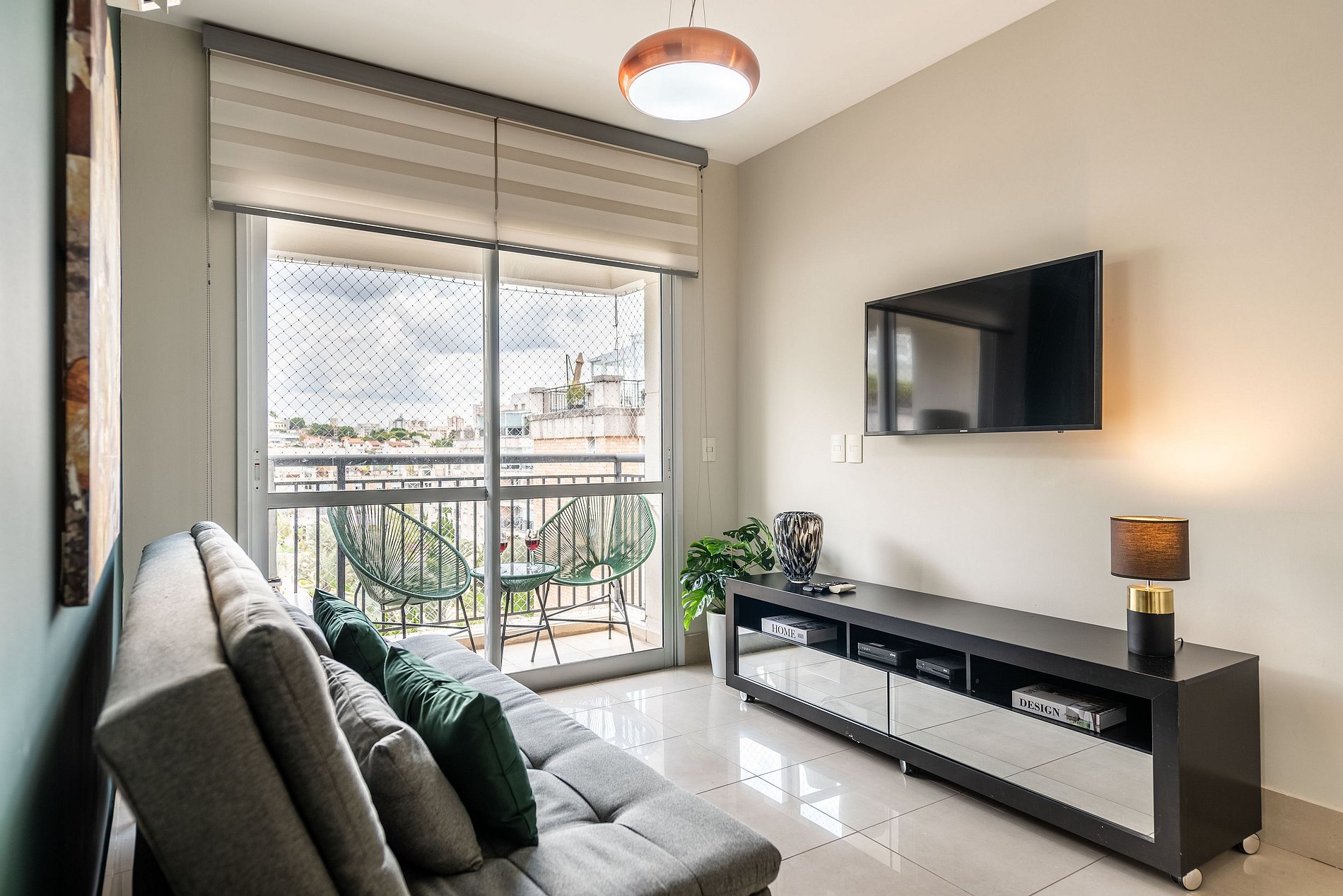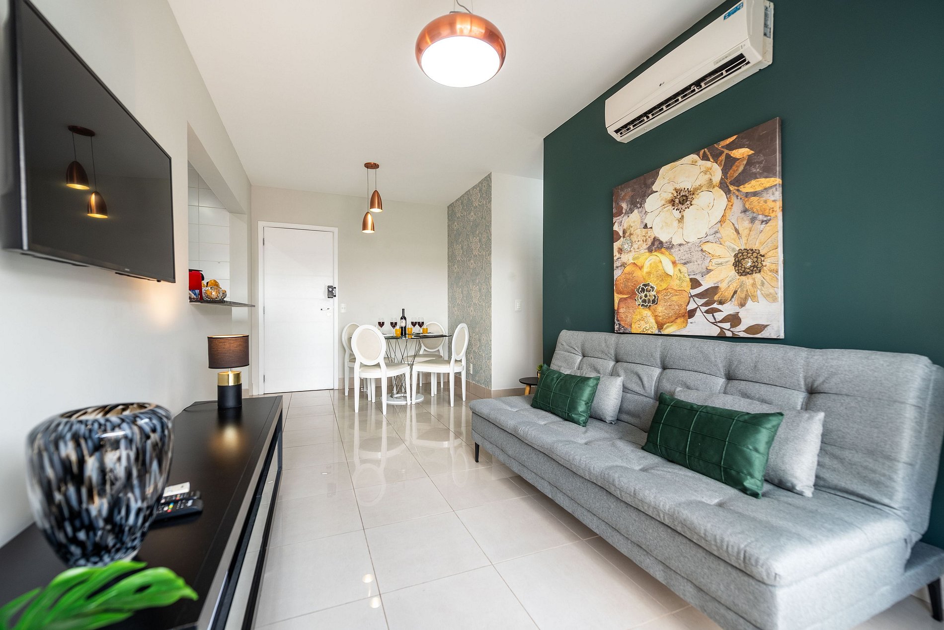 * Sala de Estar: Ampla e acolhedora, equipada com Smart TV e um sofá cama, ideal para momentos de relaxamento.