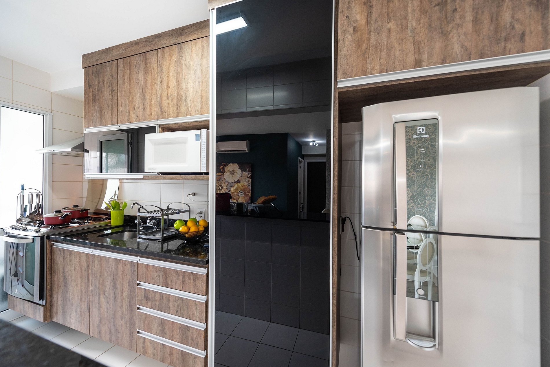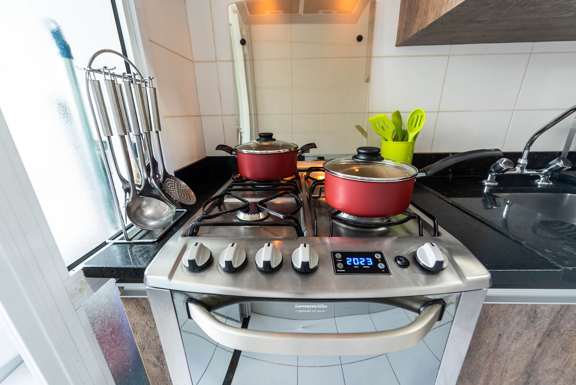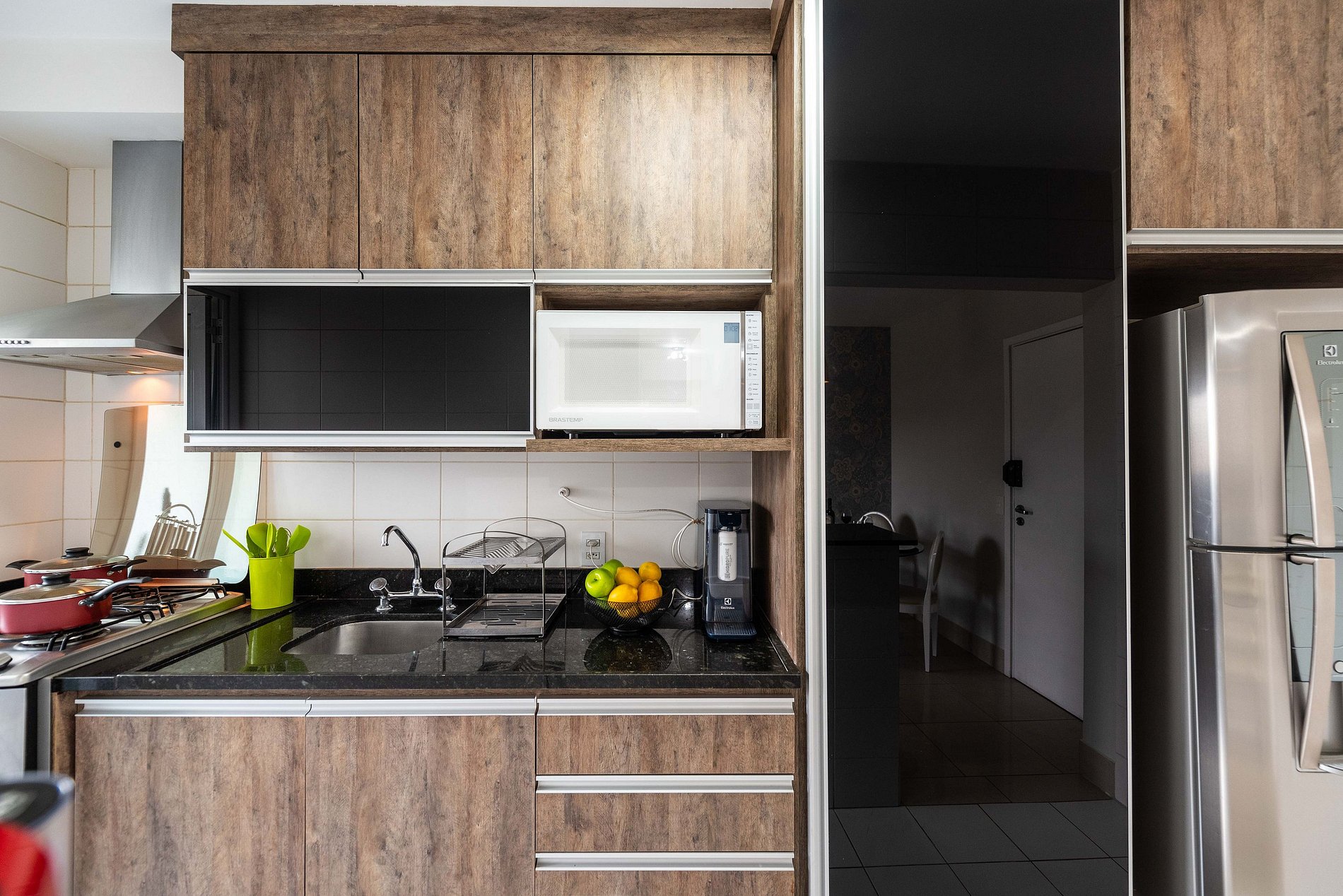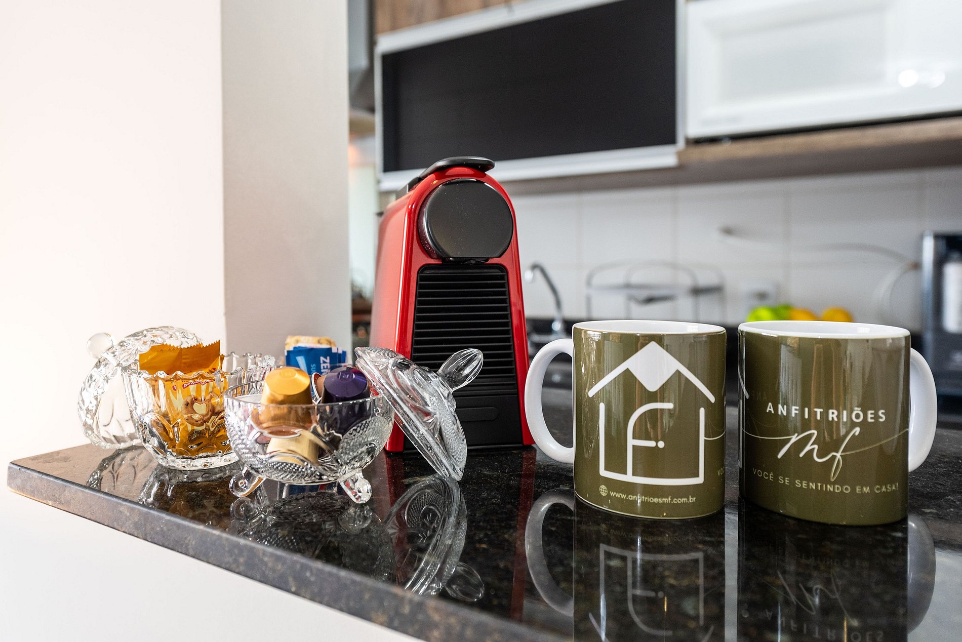 * Cozinha Completa: Com eletrodomésticos modernos (fogão, forno, exaustor, micro-ondas, cafeteira Nespresso, liquidificador, torradeira, filtro de água) e todos os utensílios necessários para preparar suas refeições favoritas.