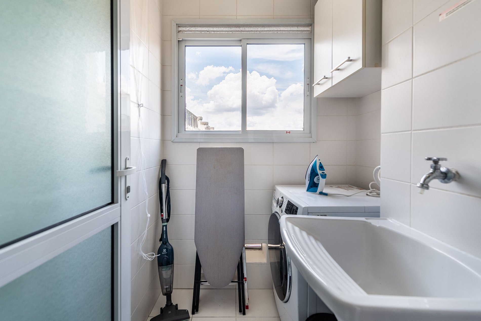* Área de Serviço: Equipada com máquina de lavar e secar roupas, ferro, varal de teto, cesto de roupas e lixeira para sua conveniência.