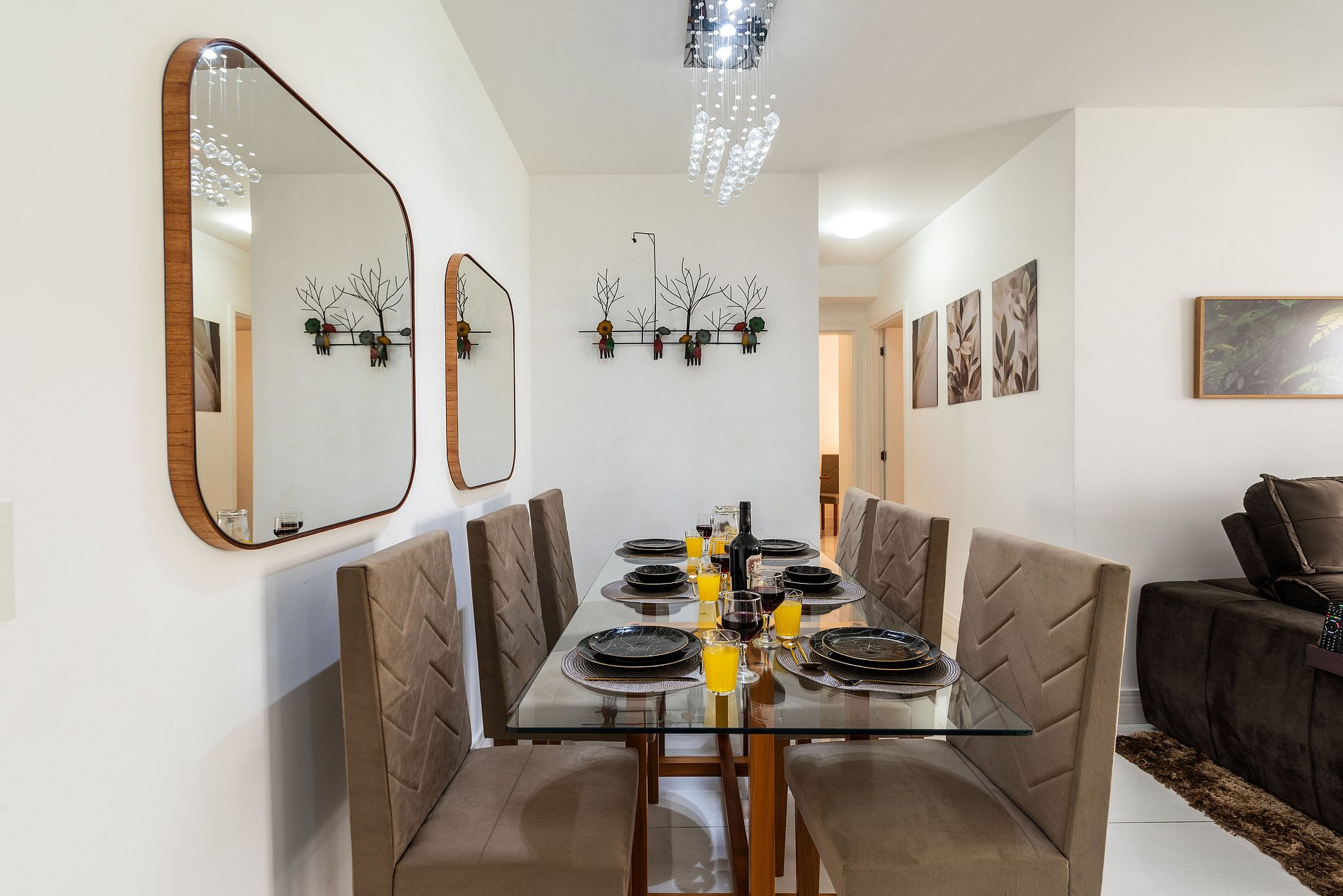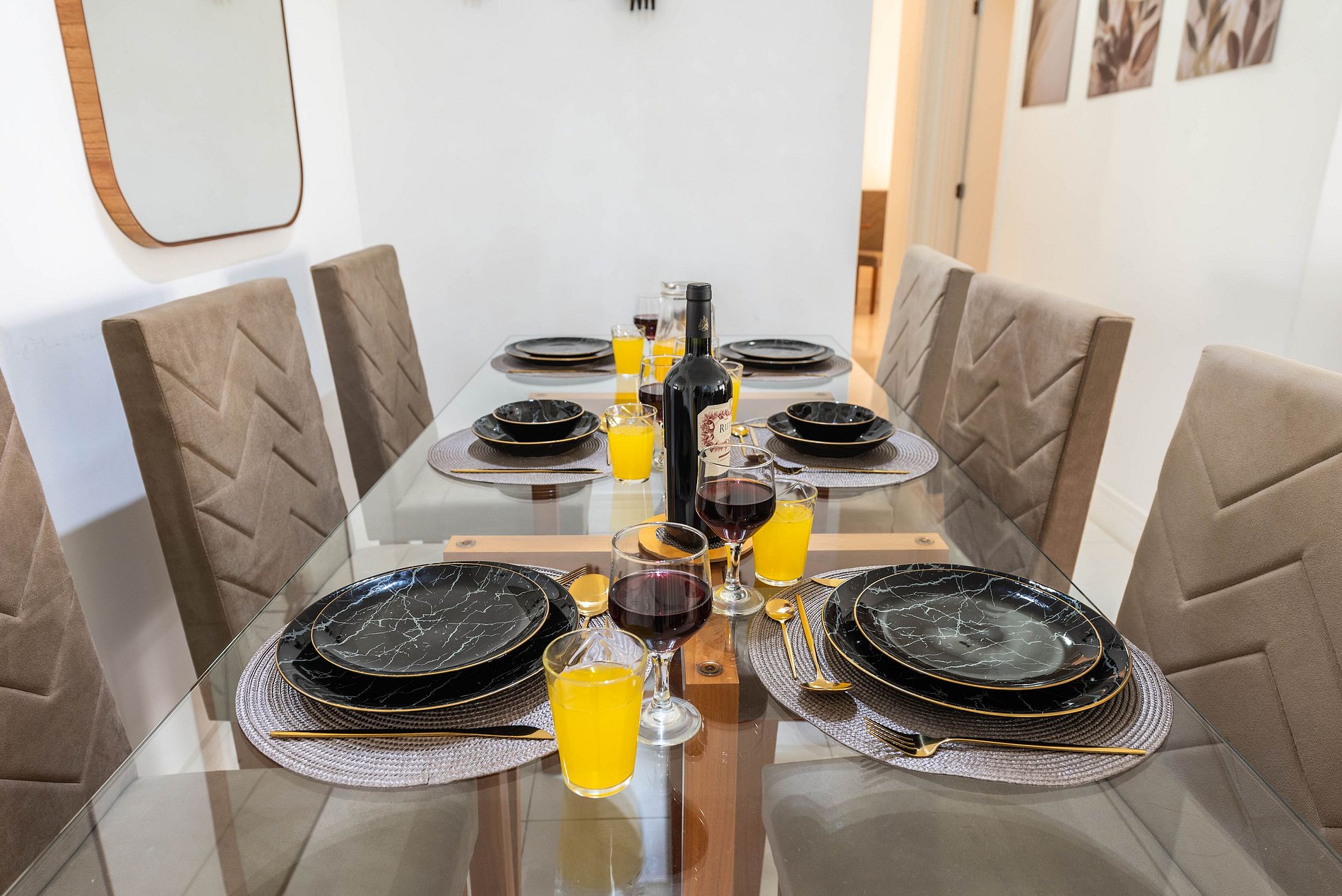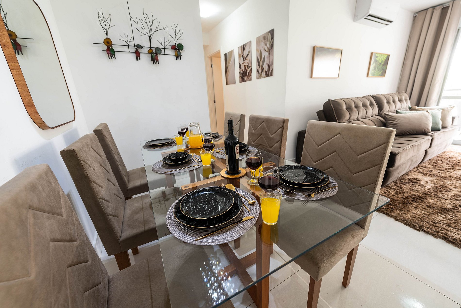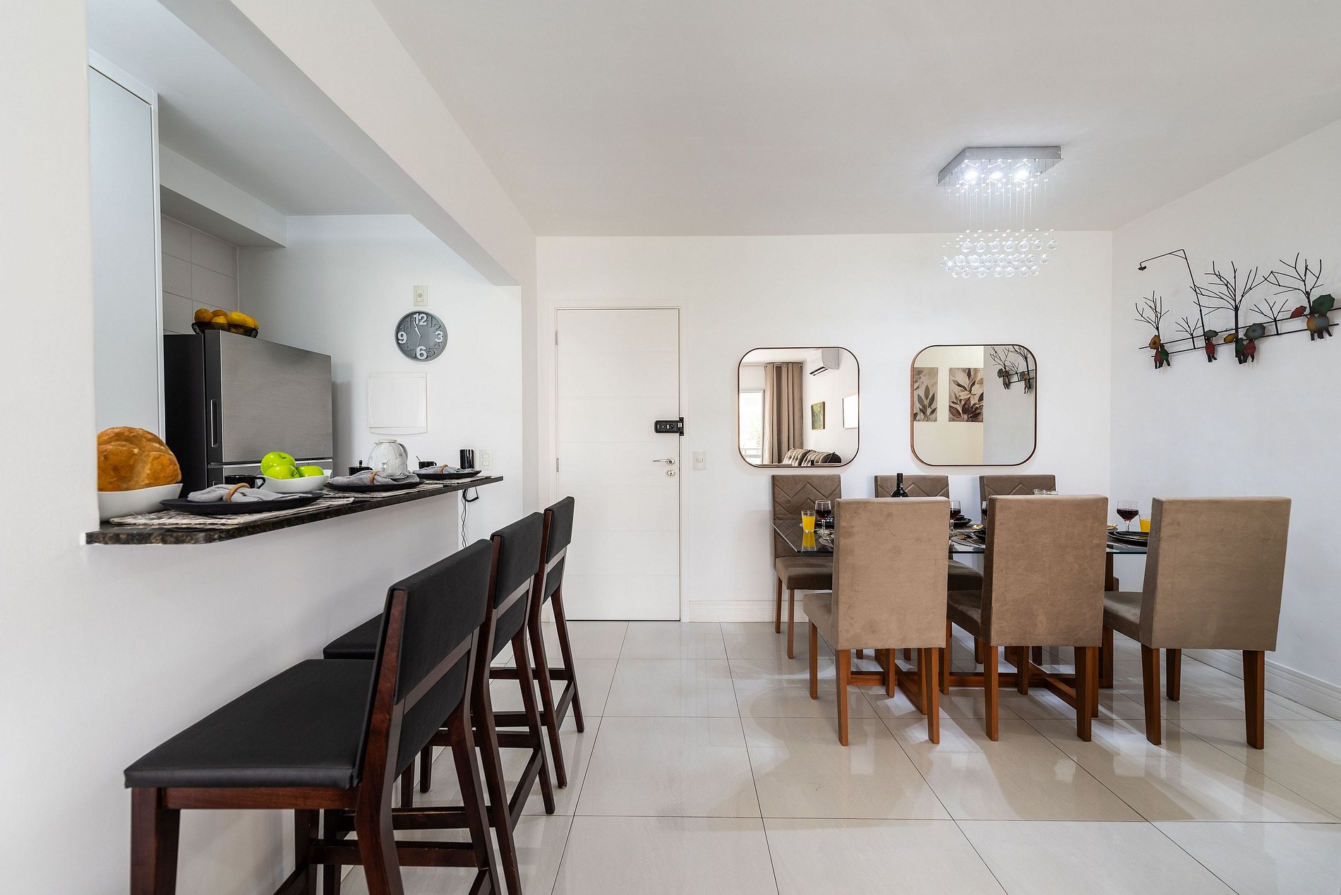* Sala de Jantar: Confortável e elegante, com uma mesa que acomoda seis cadeiras, além de uma bancada espaçosa com três cadeiras altas.