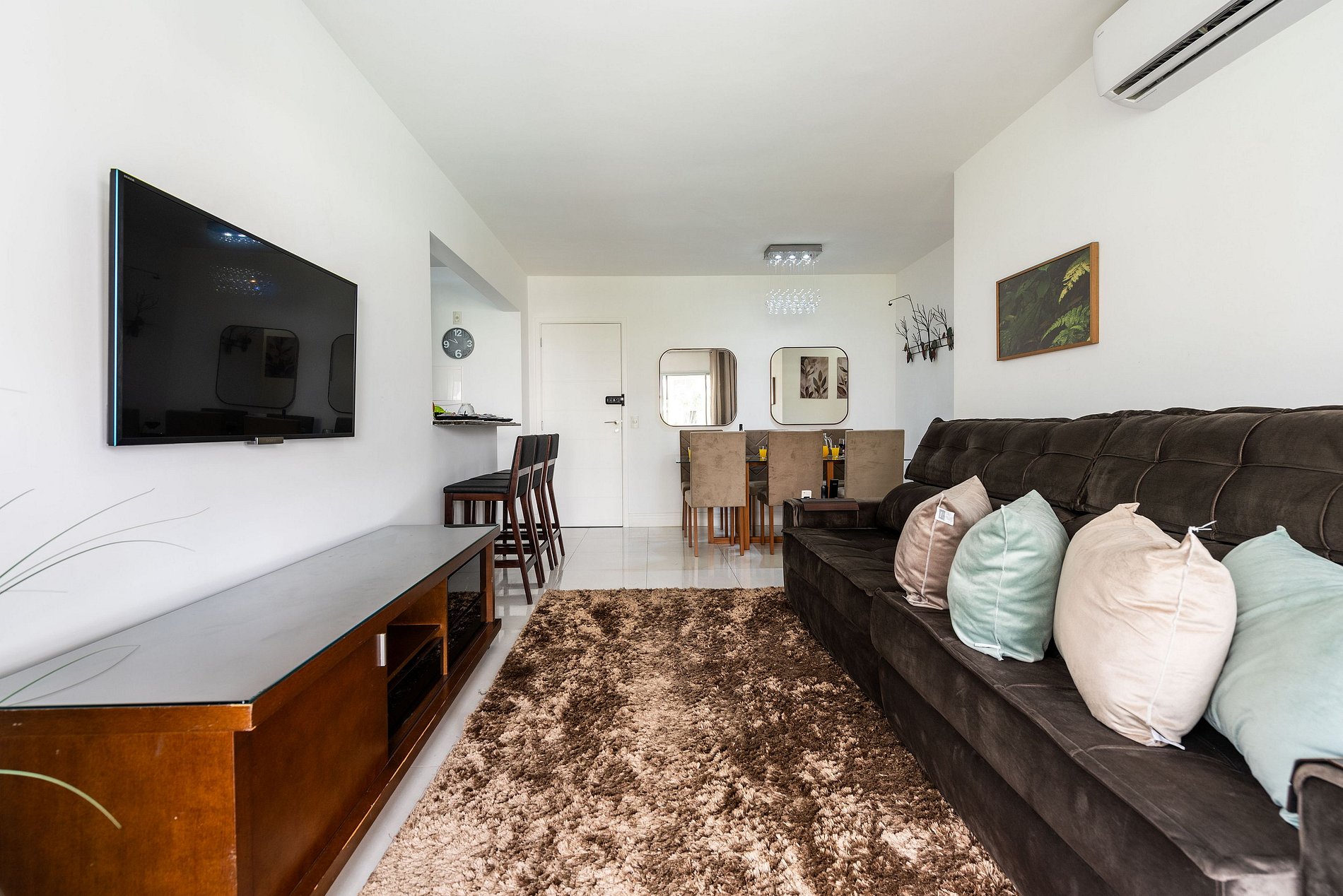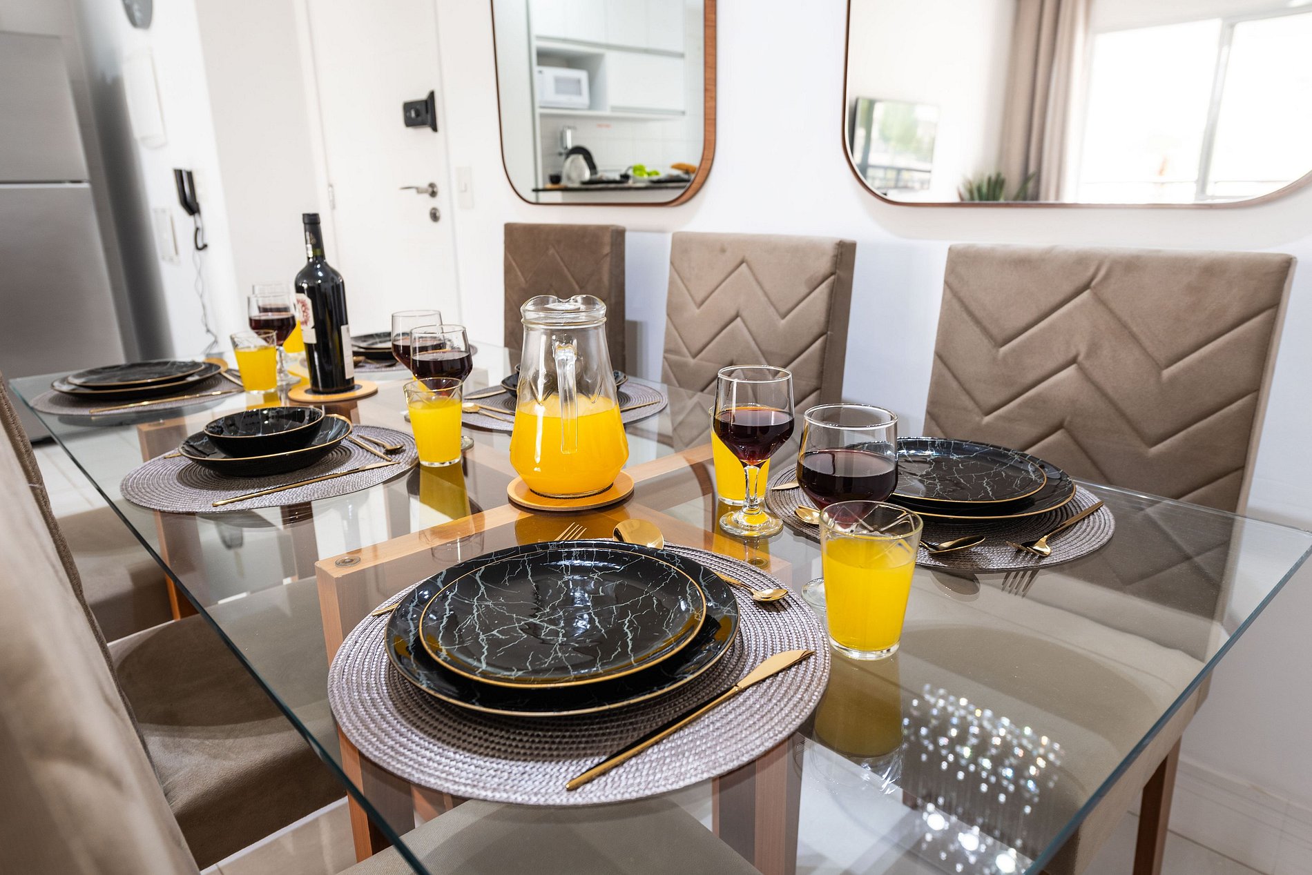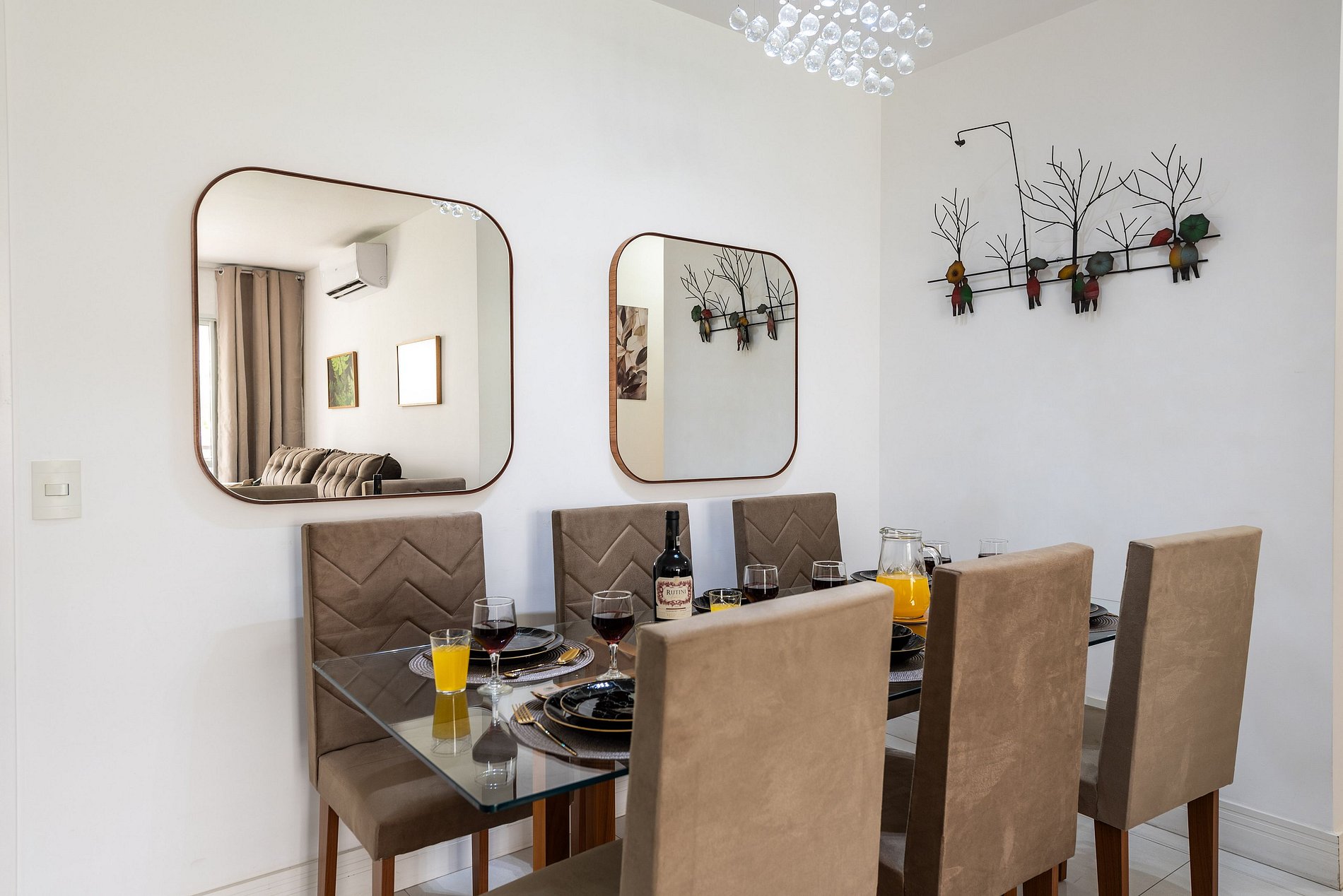 * Sala de Jantar: Confortável e elegante, com uma mesa que acomoda seis cadeiras, além de uma bancada espaçosa com três cadeiras altas.
