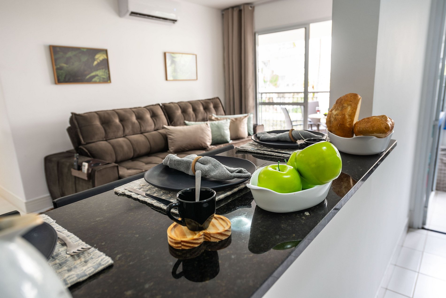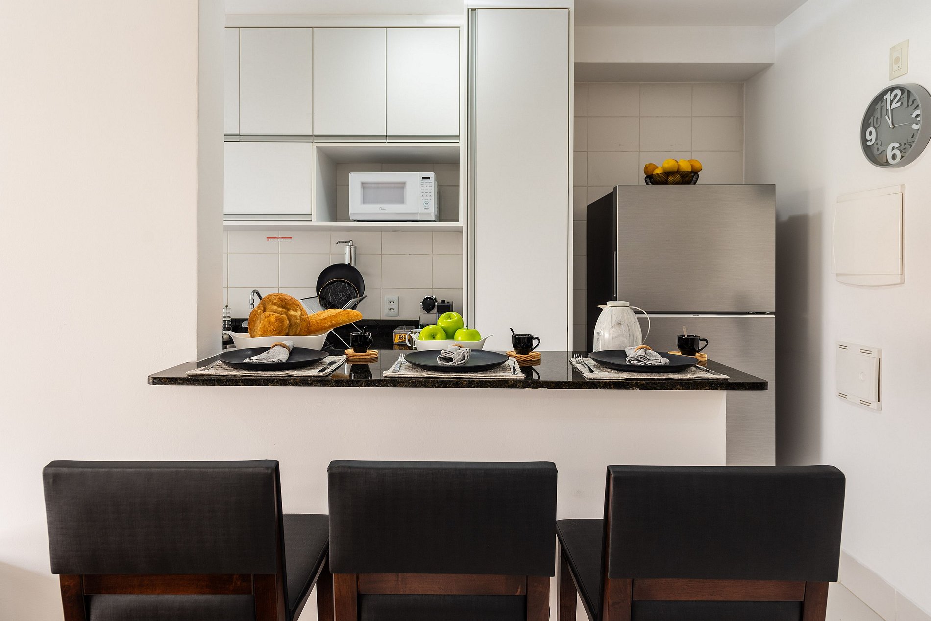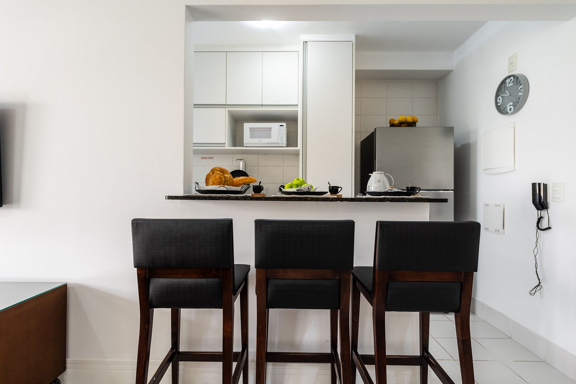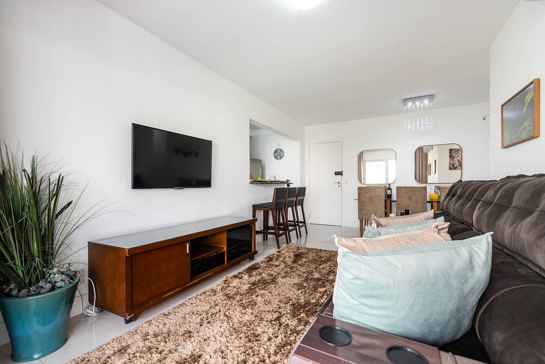 * Sala de Jantar: Confortável e elegante, com uma mesa que acomoda seis cadeiras, além de uma bancada espaçosa com três cadeiras altas.