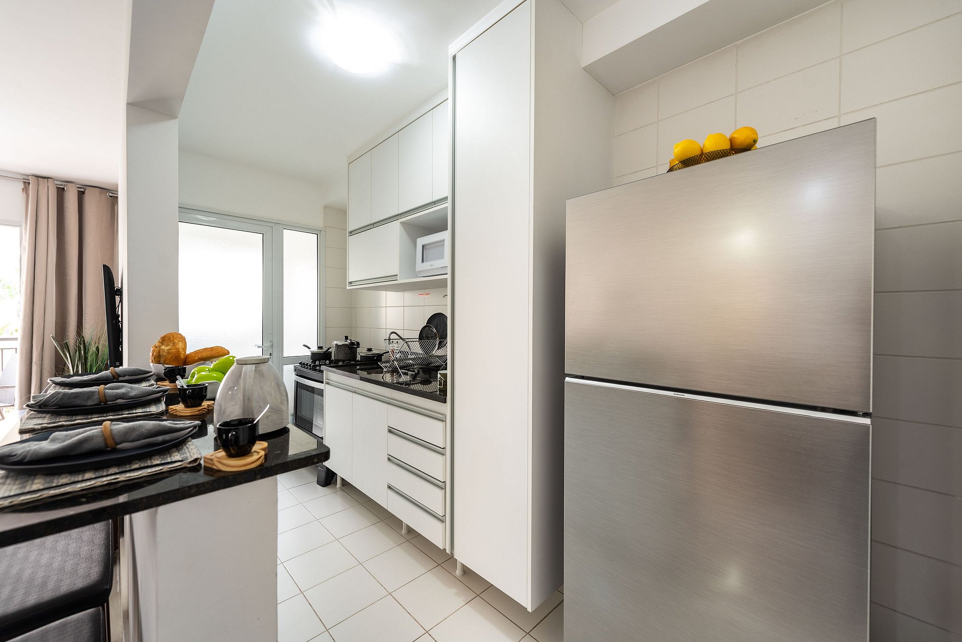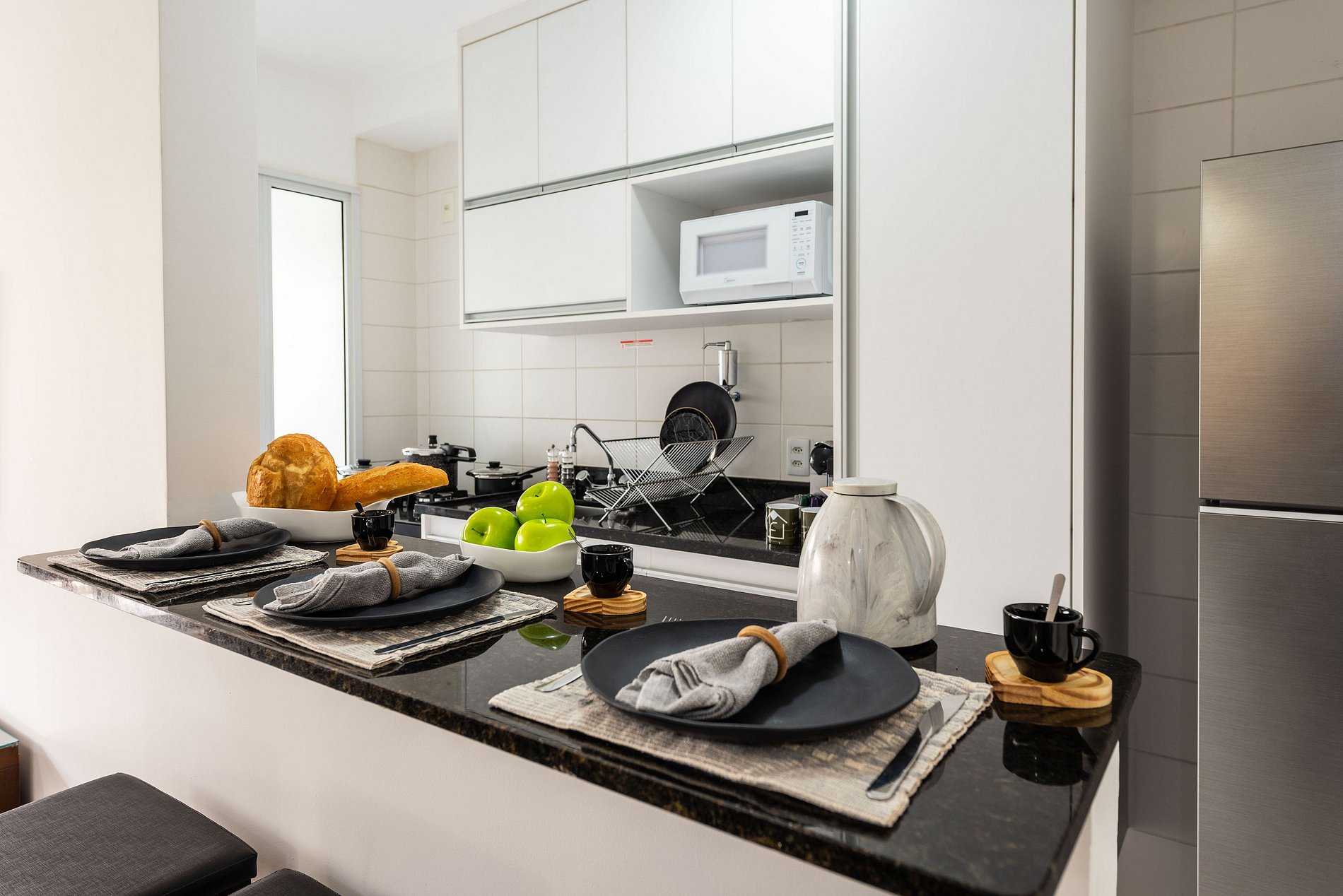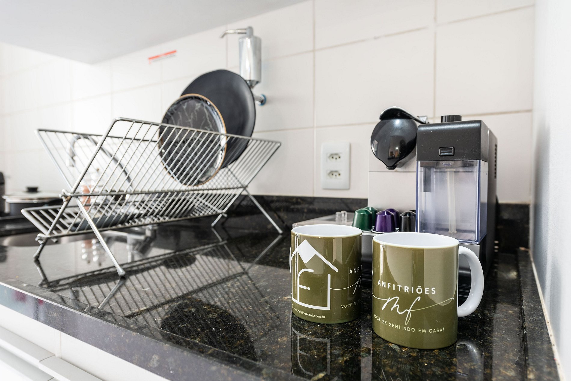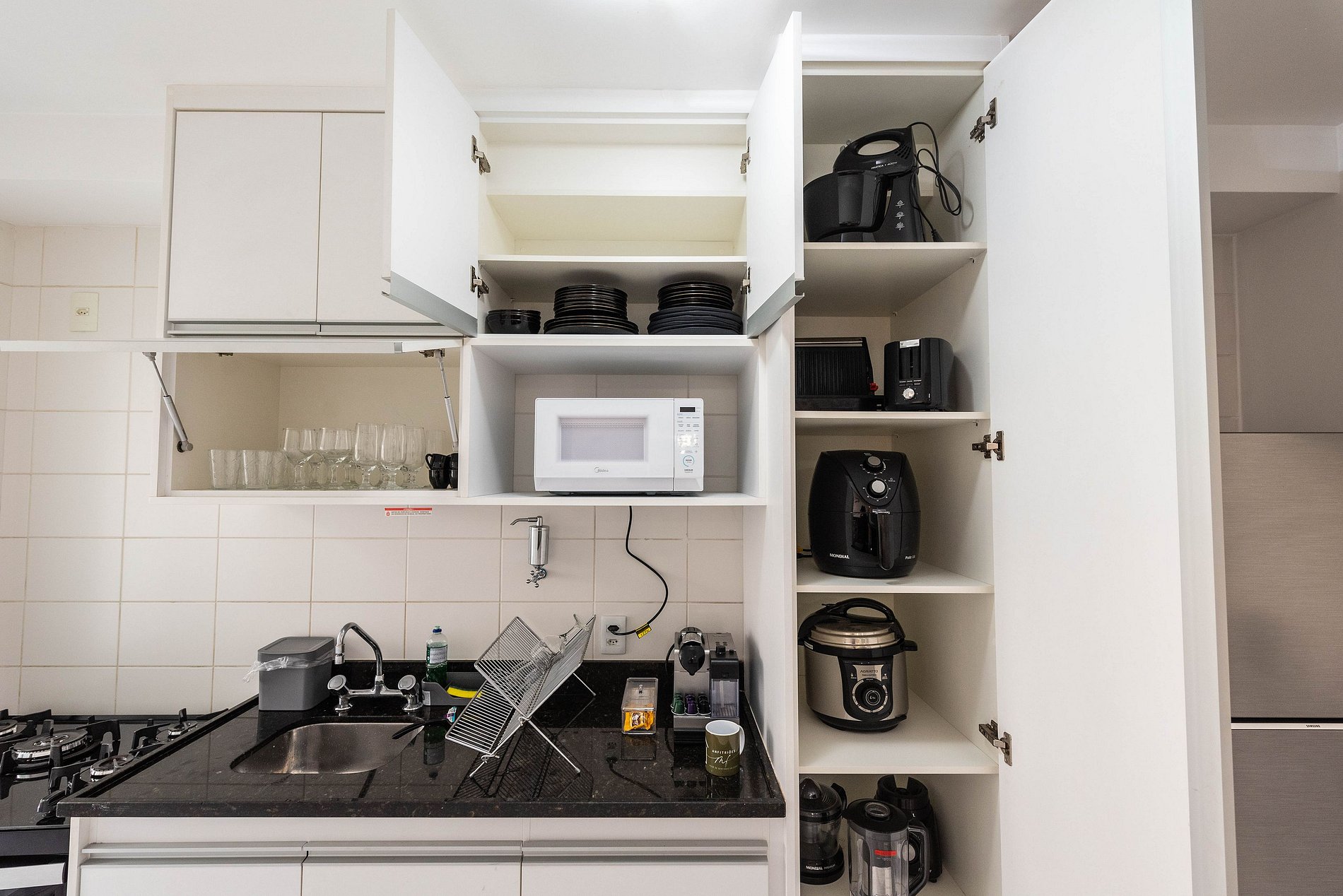 * Cozinha Completa: Equipamentos de última geração, incluindo máquina, fogão, forno, micro-ondas, cafeteira nespresso, air-fryer, torradeira, sanduicheira, liquidificador, filtro de água e todos os utensílios necessários preparar suas refeições favoritas.
