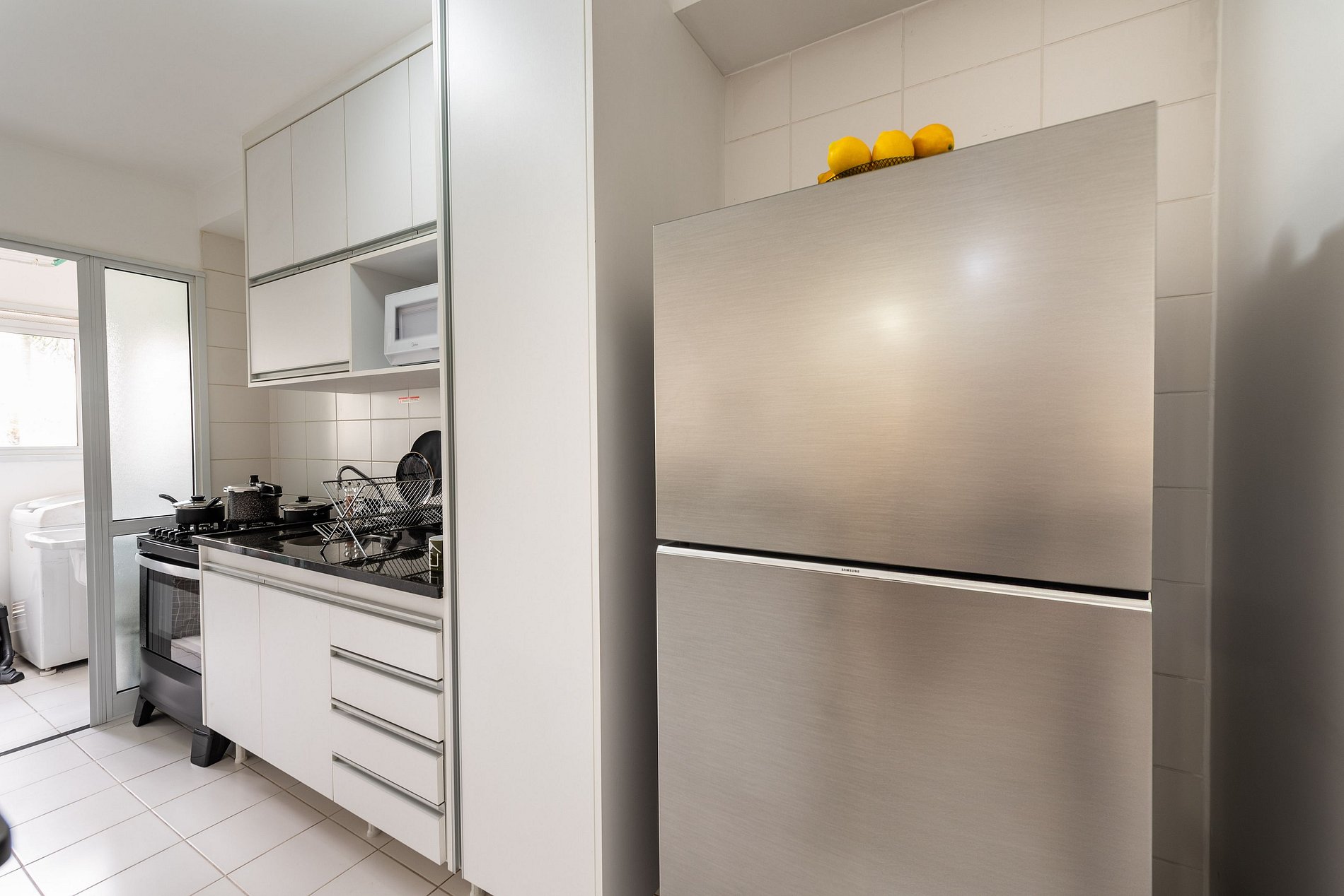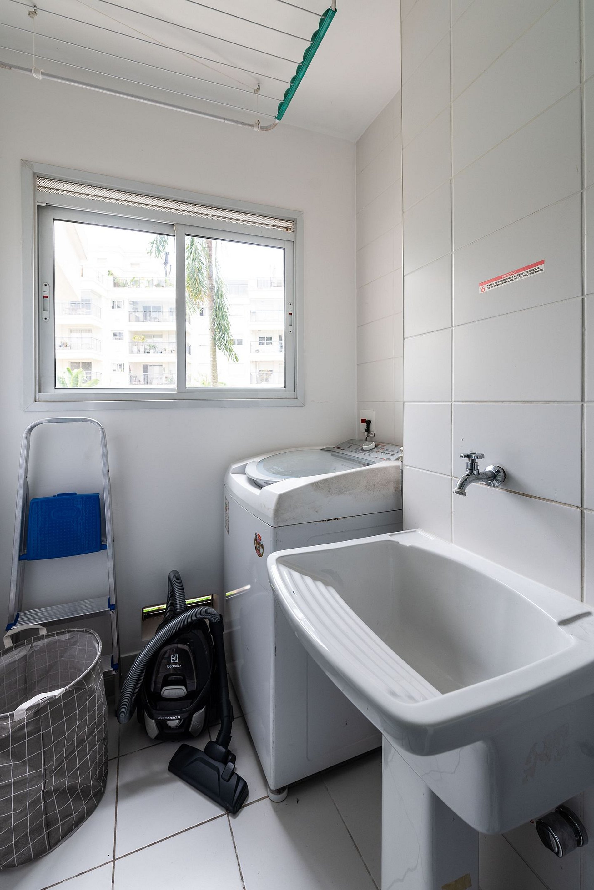 * Área de Serviço: Equipada com máquina de lavar e secar roupa, varal, vaporizador e cesto de roupa.