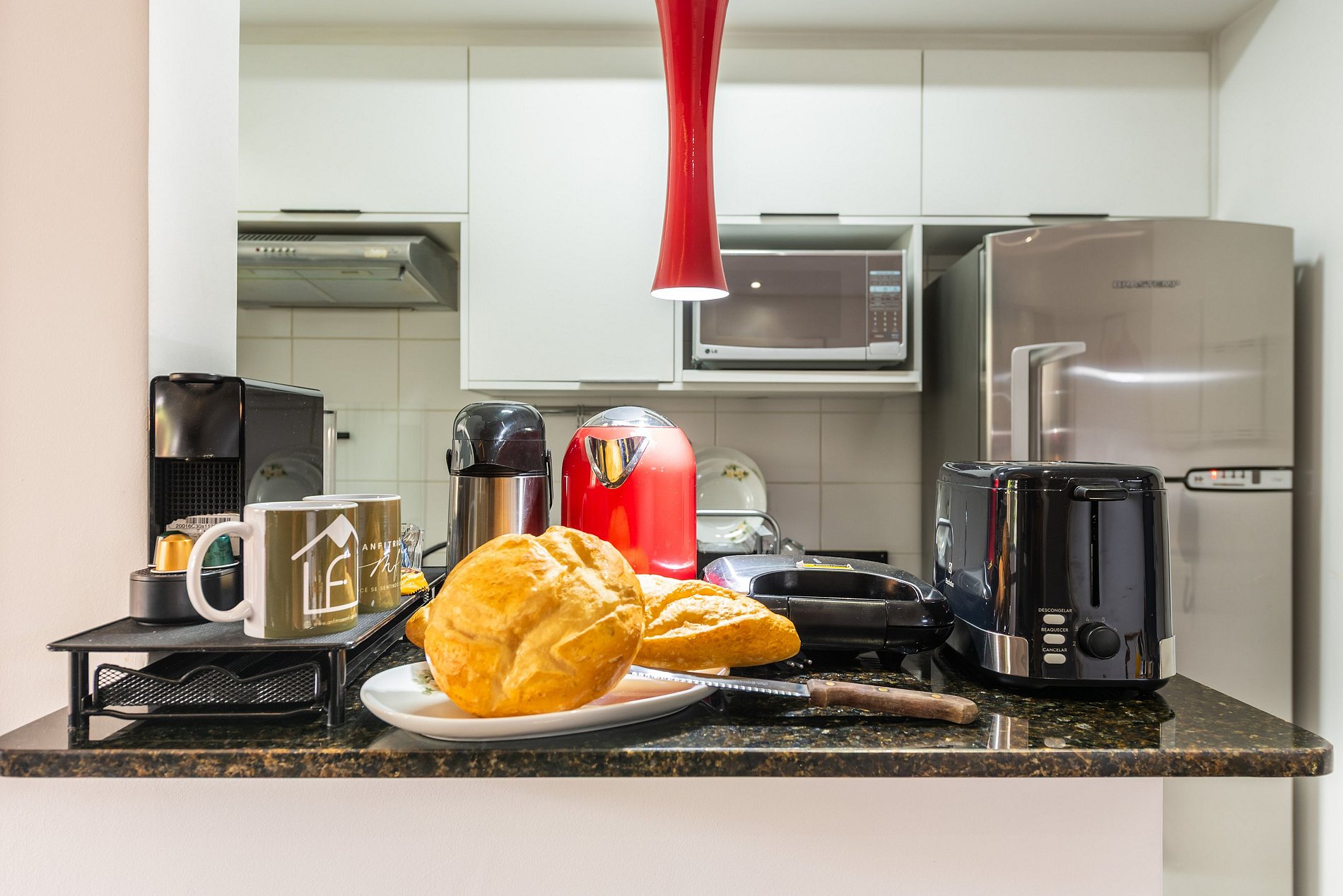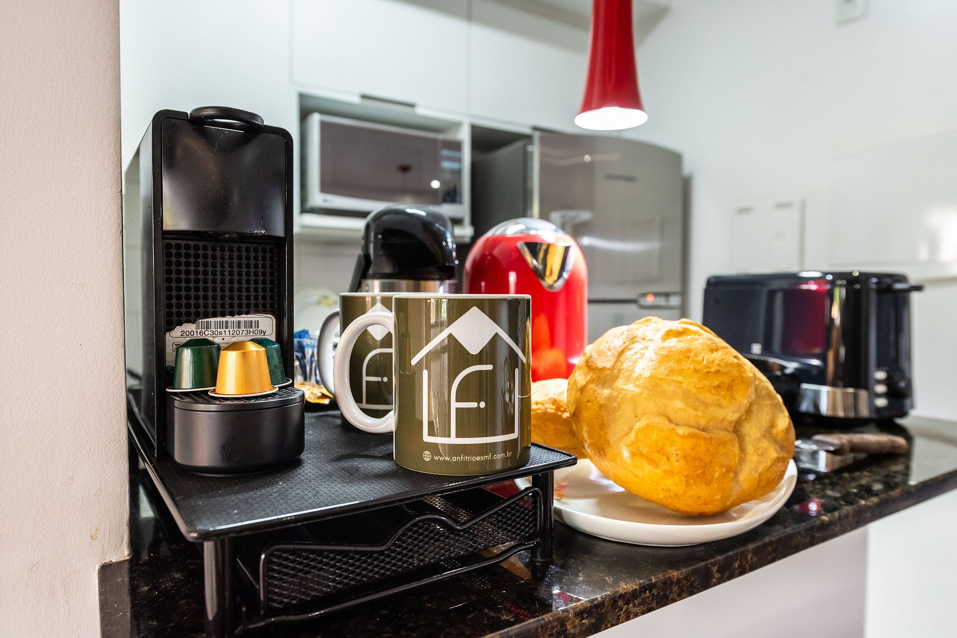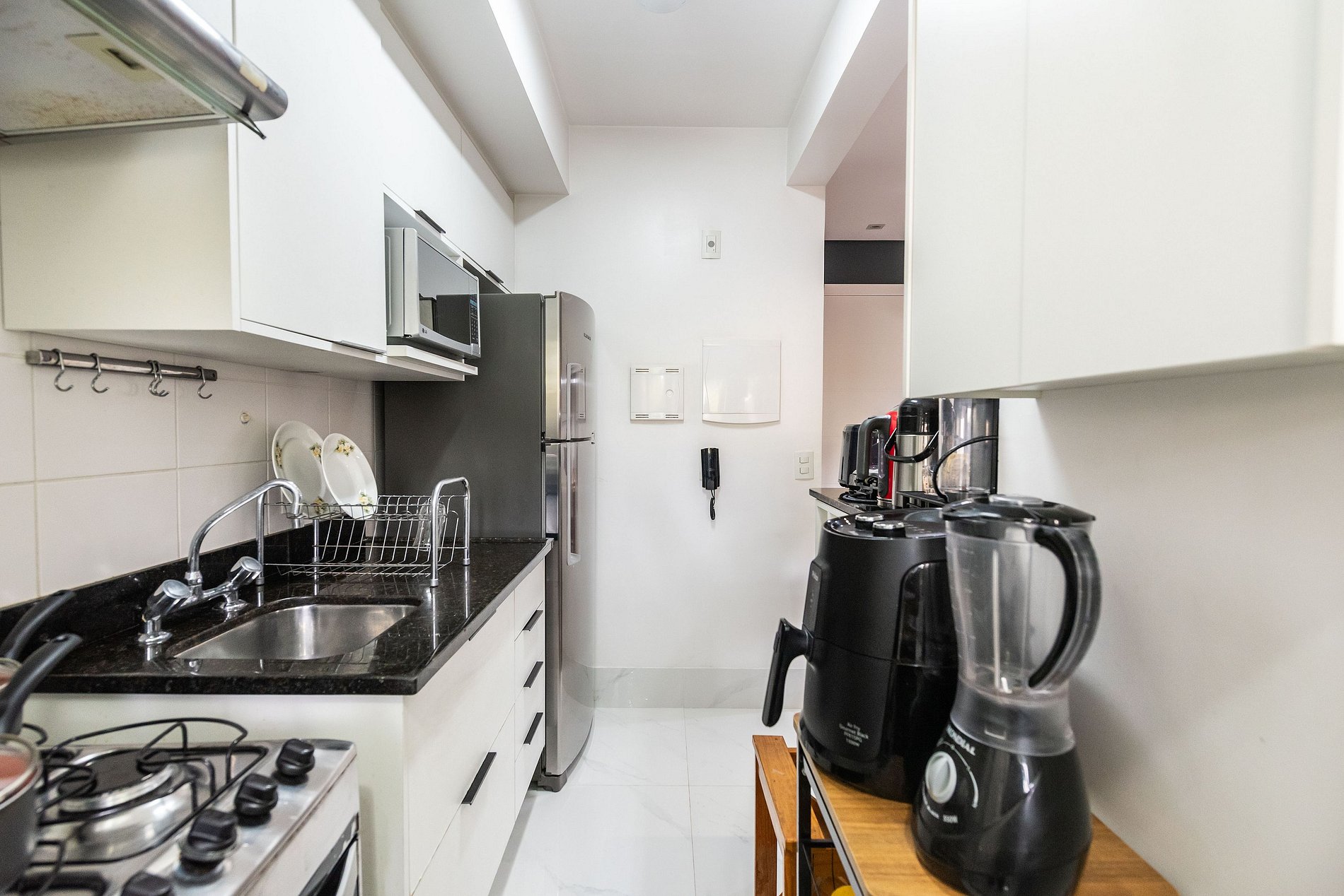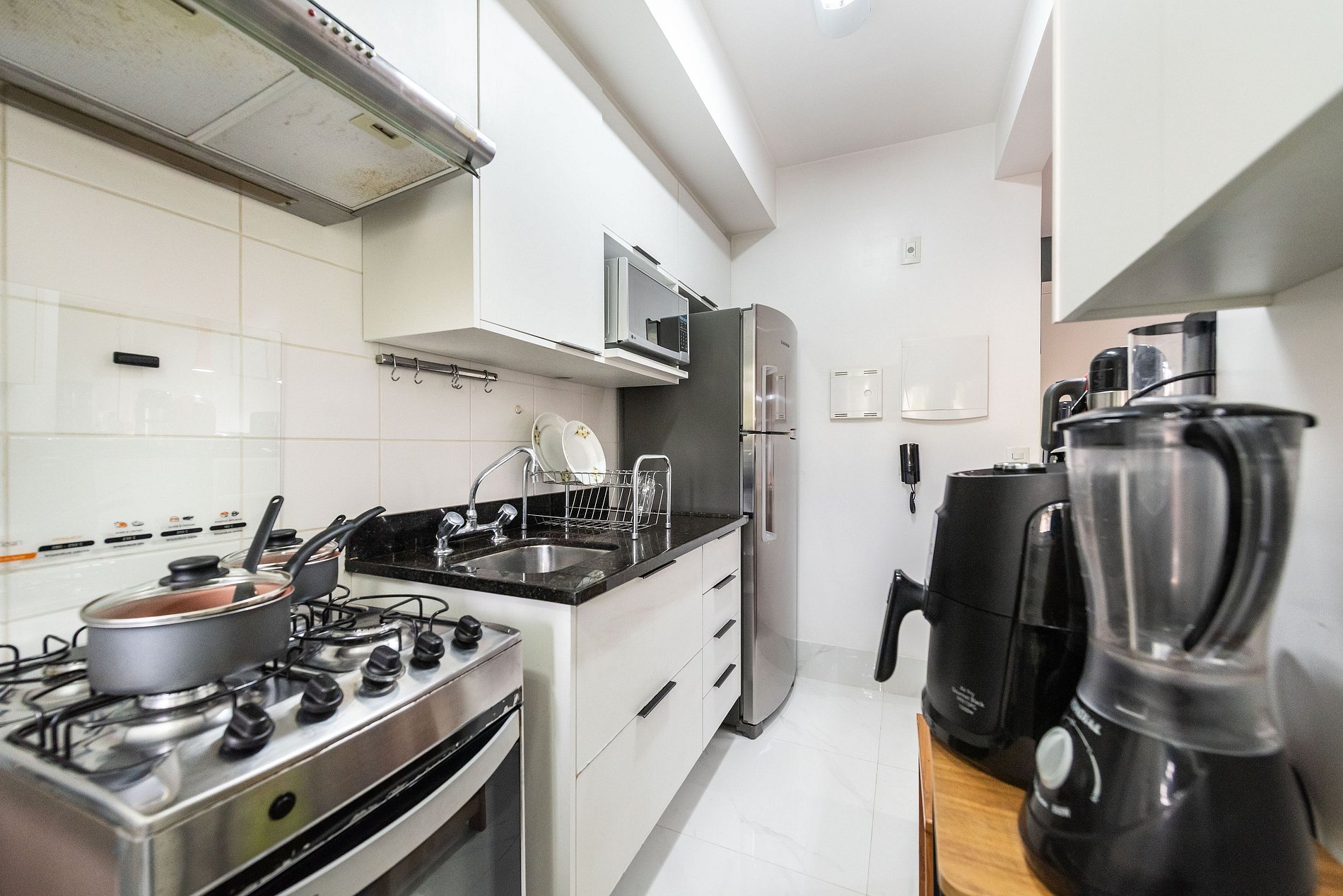 * Cozinha Completa: Com eletrodomésticos modernos (fogão, forno, exaustor, micro-ondas, air-fryer, cafeteira Nespresso, liquidificador, sanduicheira, torradeira, filtro de água) e todos os utensílios necessários para preparar suas refeições favoritas.
