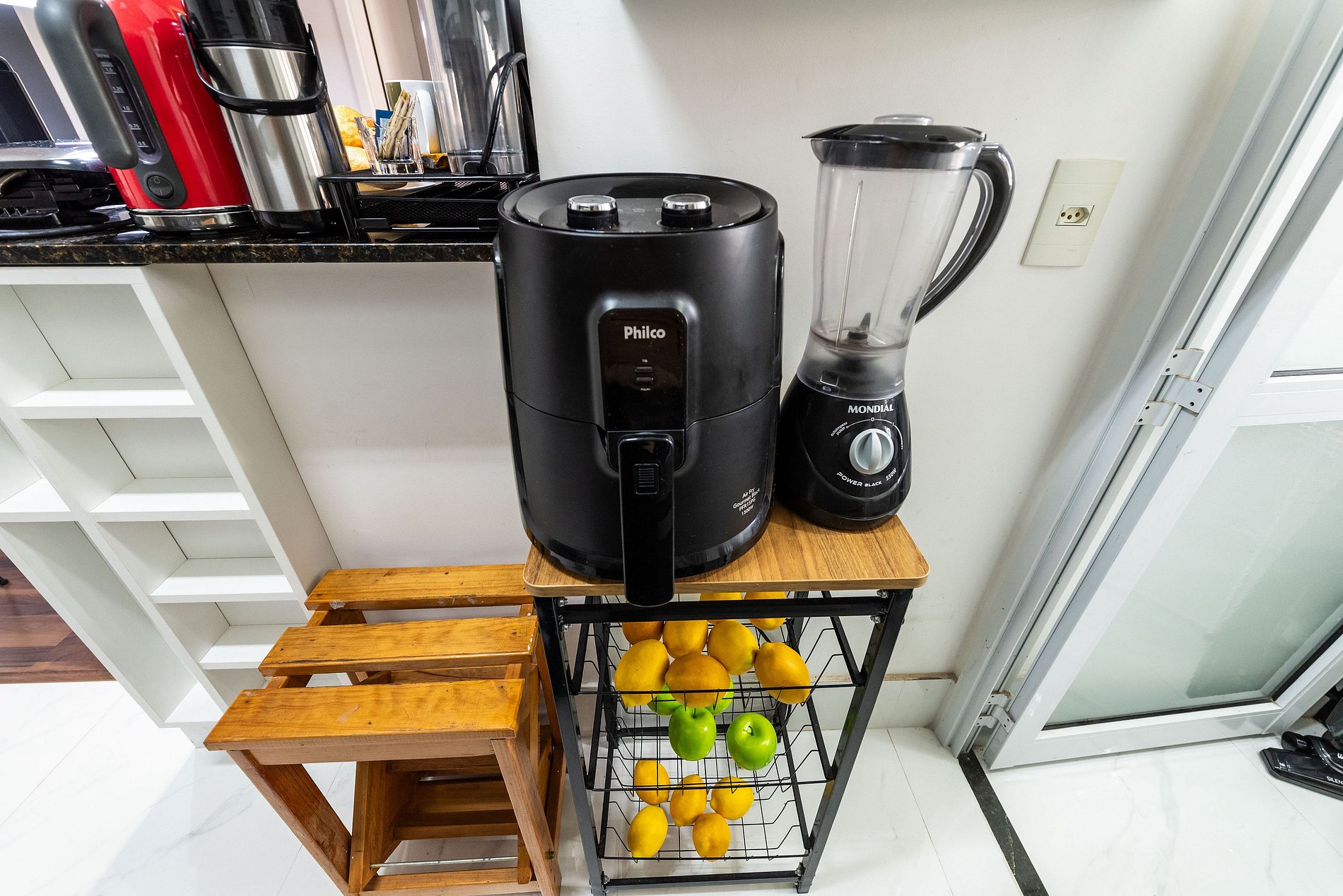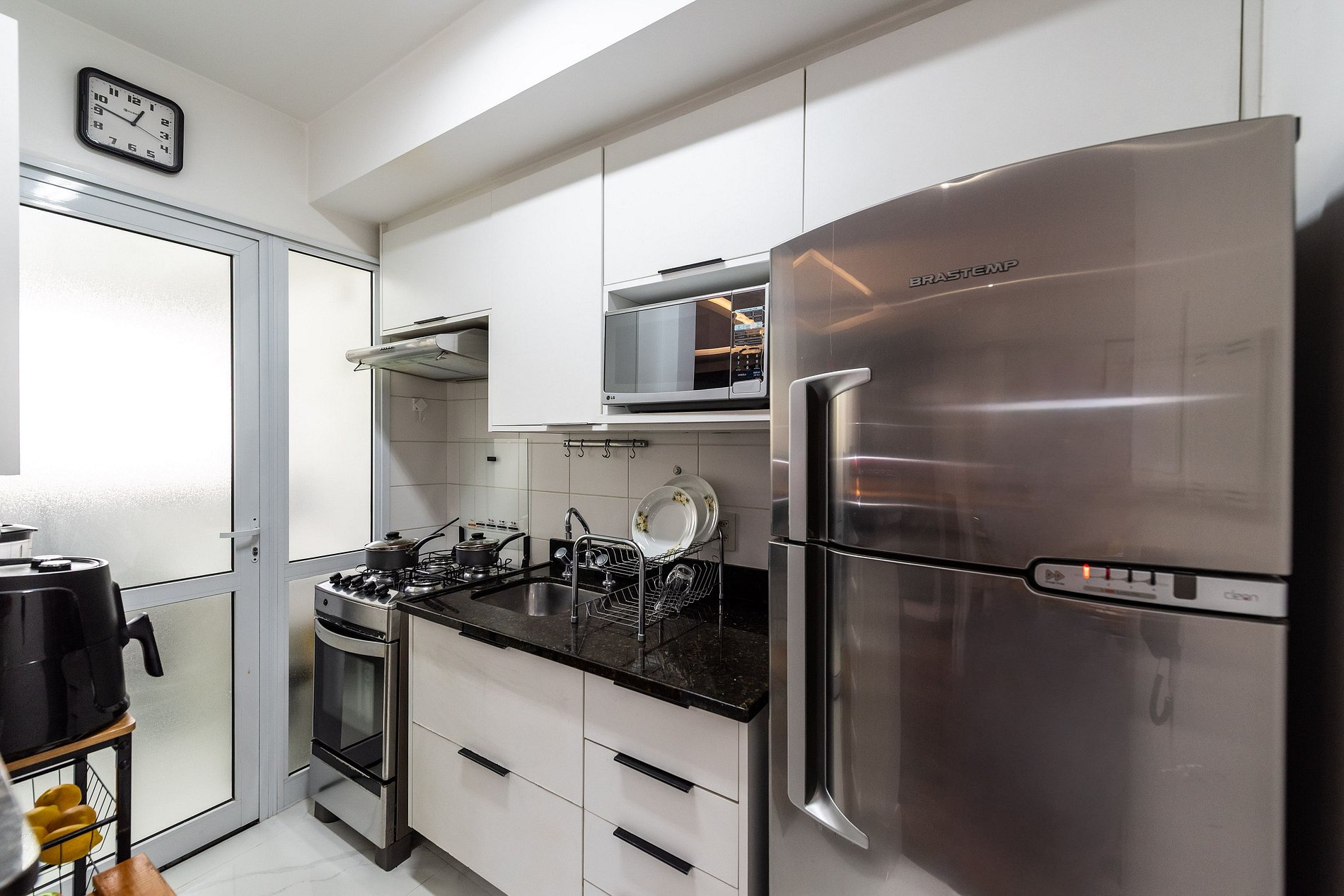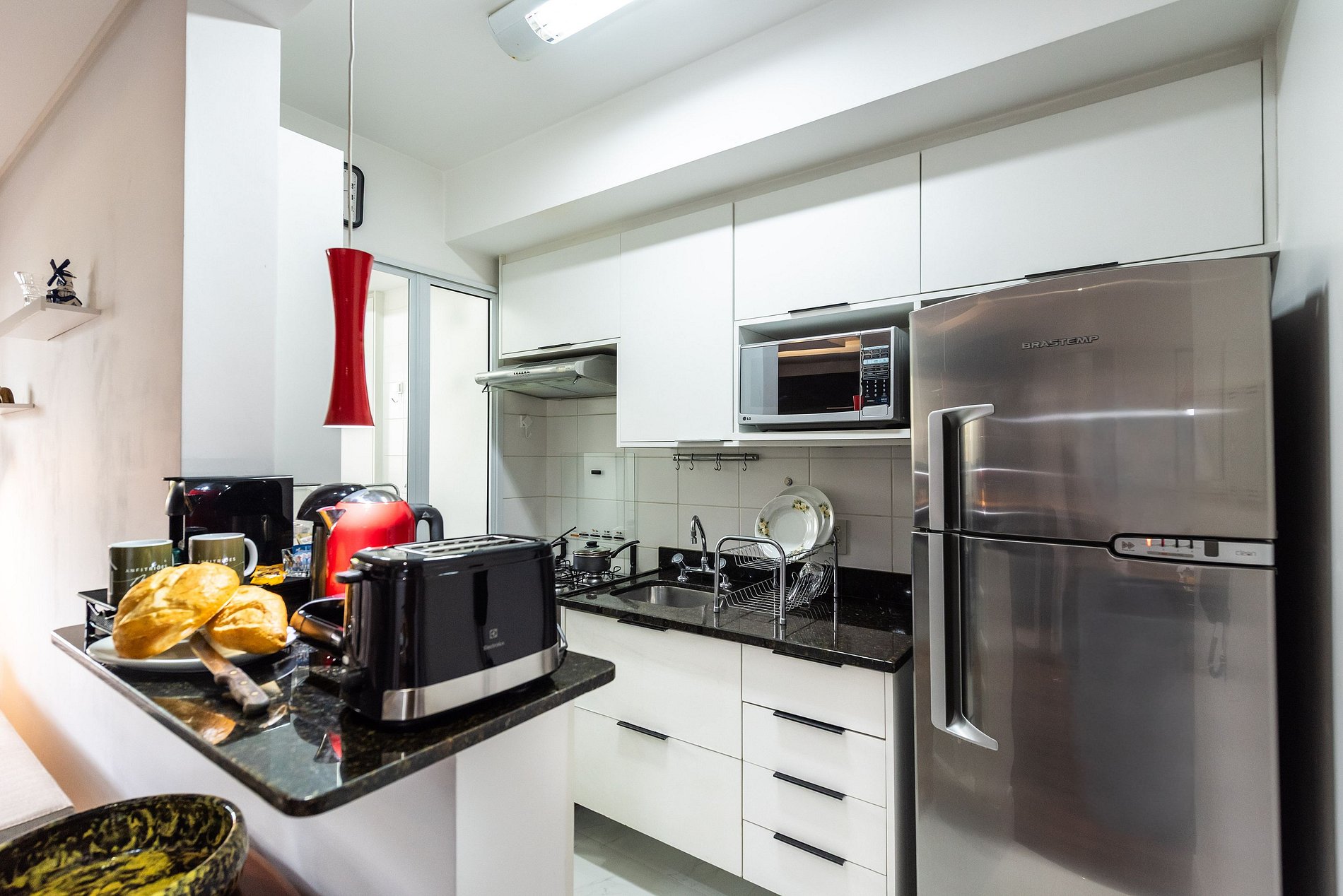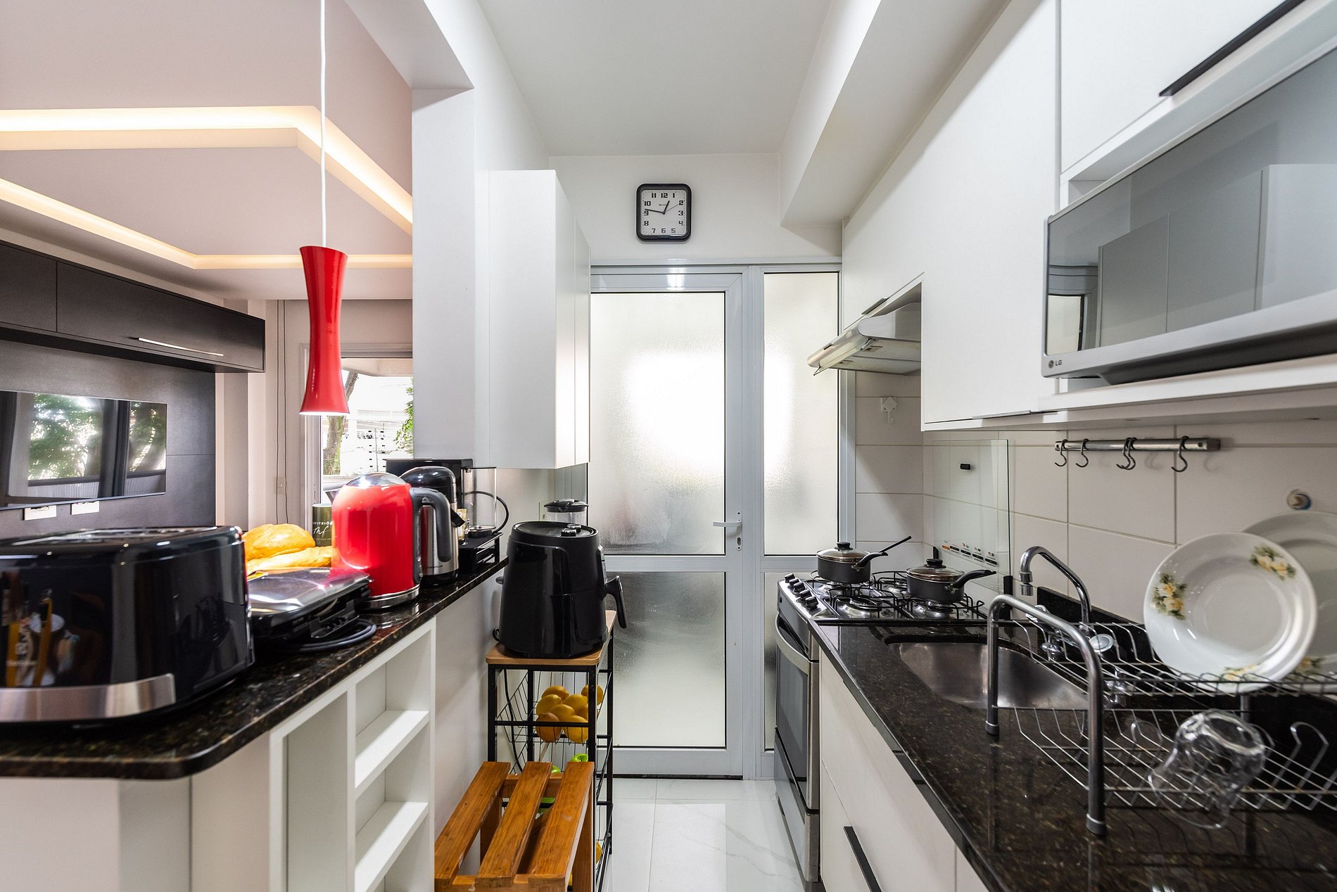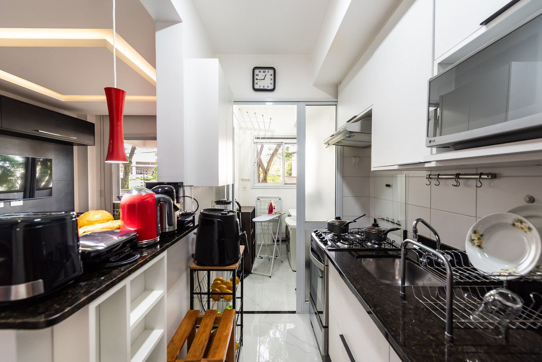 * Cozinha Completa: Com eletrodomésticos modernos (fogão, forno, exaustor, micro-ondas, air-fryer, cafeteira Nespresso, liquidificador, sanduicheira, torradeira, filtro de água) e todos os utensílios necessários para preparar suas refeições favoritas.