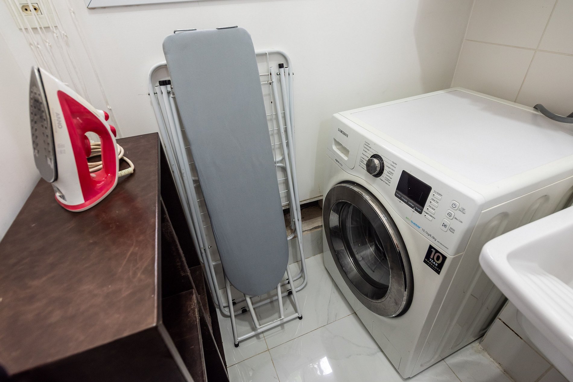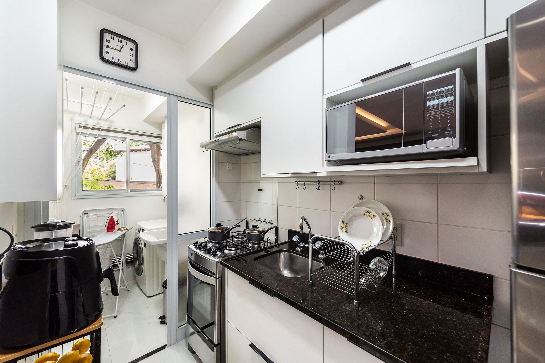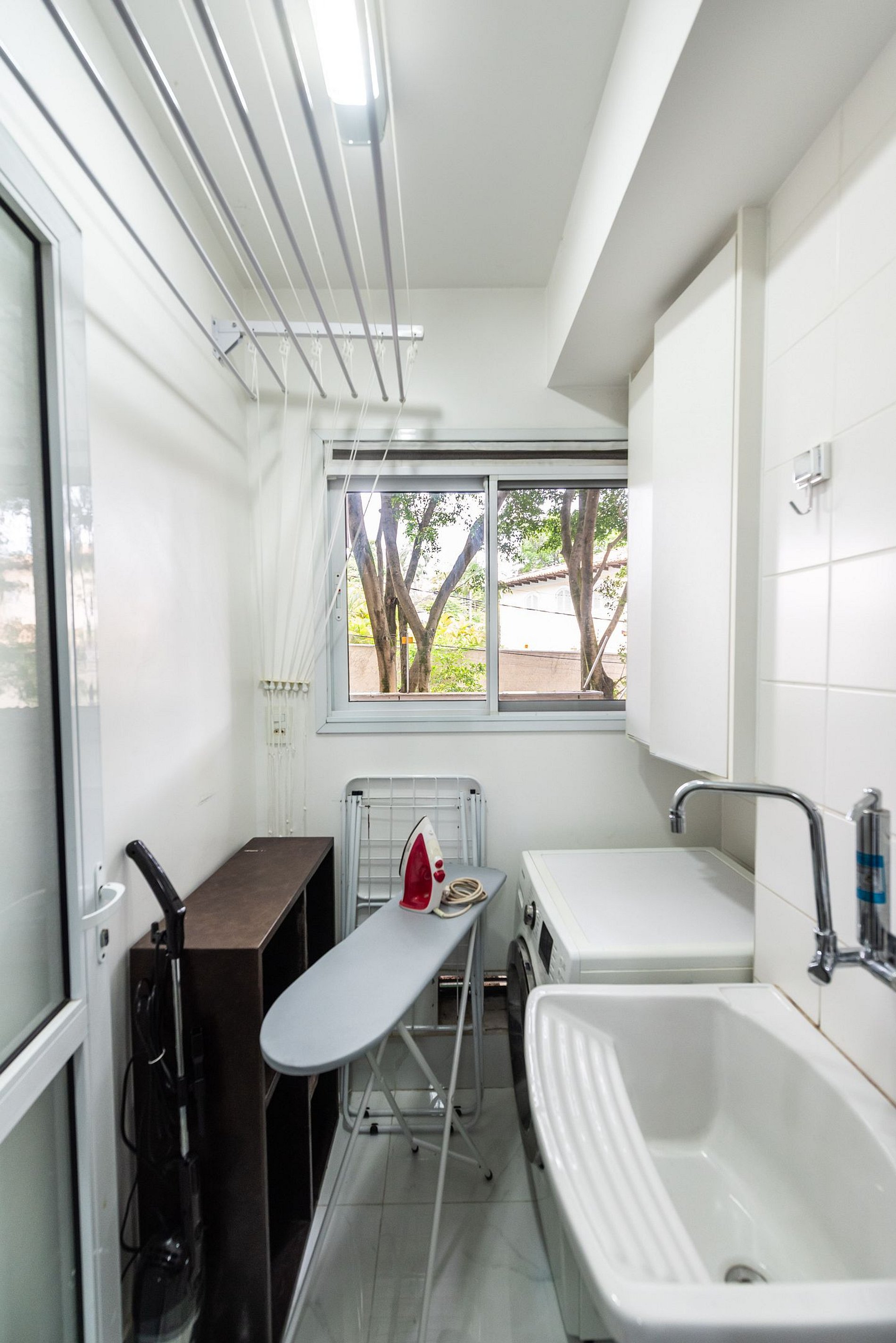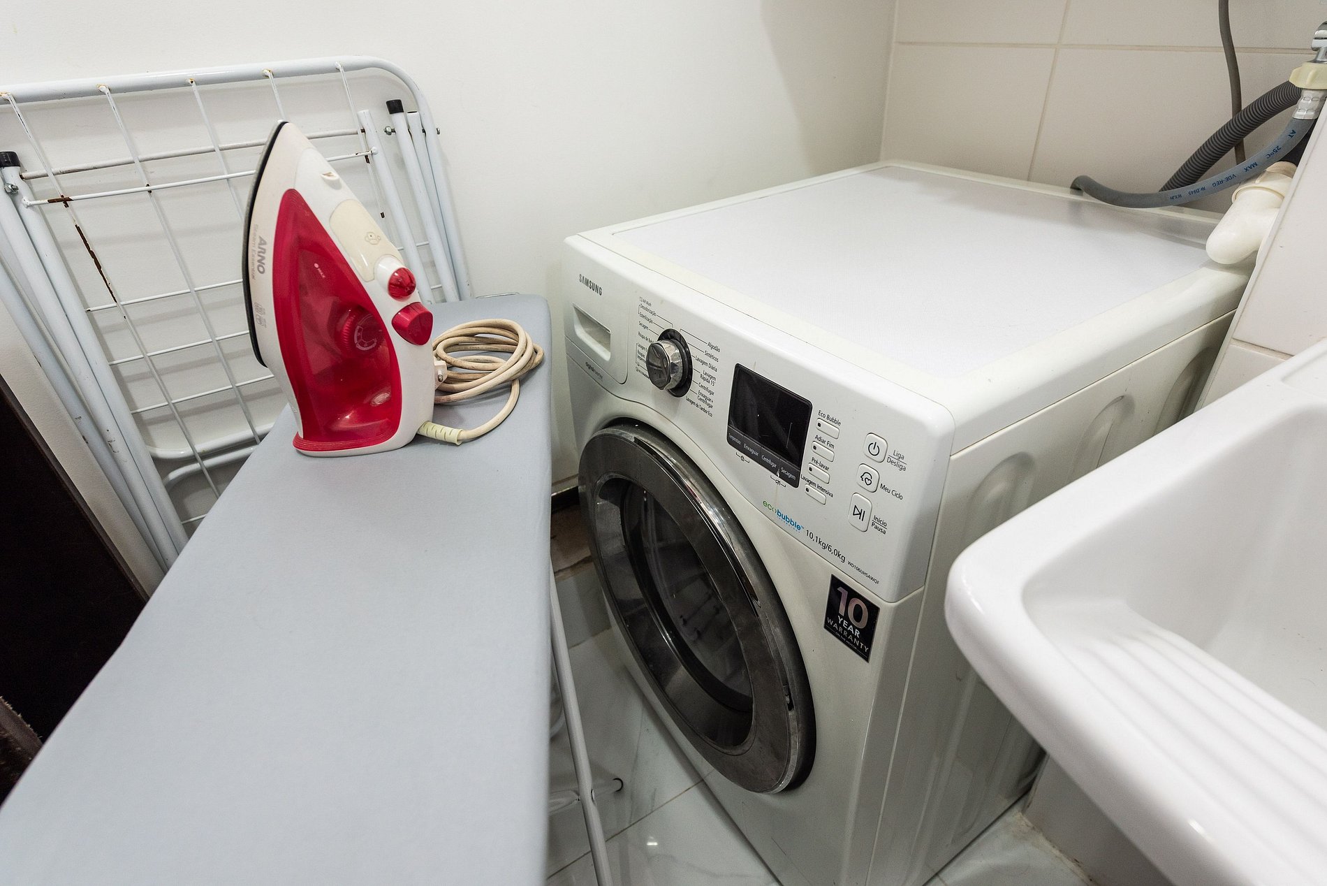 * Área de Serviço: Equipada com máquina de lavar e secar roupas, ferro, varal de teto e lixeira para sua conveniência.